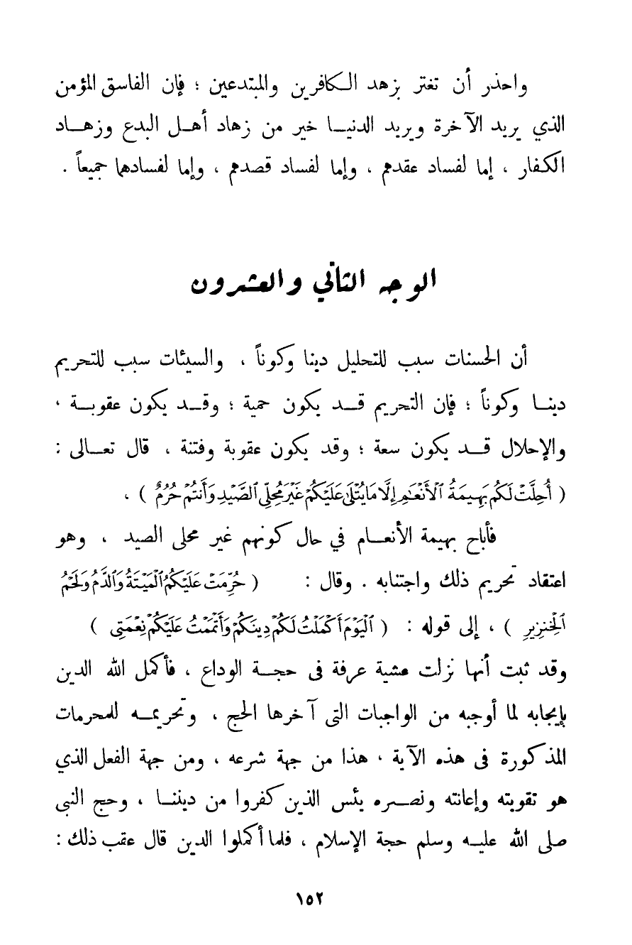 الْوَجْهُ الثَّانِيَ وَالْعِشْرُونَ: أَنَّ الْحَسَنَاتِ سَبَبٌ لِلتَّحْلِيلِ دِينًا وَكَوْنًا وَالسَّيِّئَاتِ سَبَبٌ لِلتَّحْرِيمِ دِينًا وَكَوْنًا؛ فَإِنَّ التَّحْرِيمَ قَدْ يَكُونُ حَمِيَّةً؛ وَقَدْ يَكُونُ عُقُوبَةً وَالْإِحْلَالَ قَدْ يَكُونُ سِعَةً؛ وَقَدْ يَكُونُ عُقُوبَةً وَفِتْنَةً قَالَ تَعَالَى: {أُحِلَّتْ لَكُمْ بَهِيمَةُ الْأَنْعَامِ إلَّا مَا يُتْلَى عَلَيْكُمْ غَيْرَ مُحِلِّي الصَّيْدِ وَأَنْتُمْ حُرُمٌ} فَأَبَاحَ بَهِيمَةَ الْأَنْعَامِ فِي حَالِ كَوْنِهِمْ غَيْرَ مُحَلِّي الصَّيْدِ وَهُوَ اعْتِقَادُ تَحْرِيمِ ذَلِكَ وَاجْتِنَابُهُ. وَقَالَ: {حُرِّمَتْ عَلَيْكُمُ الْمَيْتَةُ وَالدَّمُ وَلَحْمُ الْخِنْزِيرِ} إلَى قَوْلِهِ: {الْيَوْمَ أَكْمَلْتُ لَكُمْ دِينَكُمْ وَأَتْمَمْتُ عَلَيْكُمْ نِعْمَتِي} وَقَدْ ثَبَتَ أَنَّهَا نَزَلَتْ عَشِيَّةَ عَرَفَةَ فِي حِجَّةِ الْوَدَاعِ فَأَكْمَلَ اللَّهُ الدِّينَ بِإِيجَابِهِ لِمَا أَوْجَبَهُ مِنْ الْوَاجِبَاتِ الَّتِي آخِرُهَا الْحَجُّ وَتَحْرِيمِهِ لِلْمُحَرَّمَاتِ الْمَذْكُورَةِ فِي هَذِهِ الْآيَةِ هَذَا مِنْ جِهَةِ شَرْعِهِ وَمِنْ جِهَةِ الْفِعْلِ الَّذِي هُوَ تَقْوِيَتُهُ وَإِعَانَتُهُ وَنَصْرُهُ يَئِسَ الَّذِينَ كَفَرُوا مِنْ دِينِنَا وَحَجَّ النَّبِيُّ صَلَّى اللَّهُ عَلَيْهِ وَسَلَّمَ حِجَّةَ الْإِسْلَامِ فَلَمَّا أَكْمَلُوا الدِّينَ قَالَ عَقِبَ ذَلِكَ: