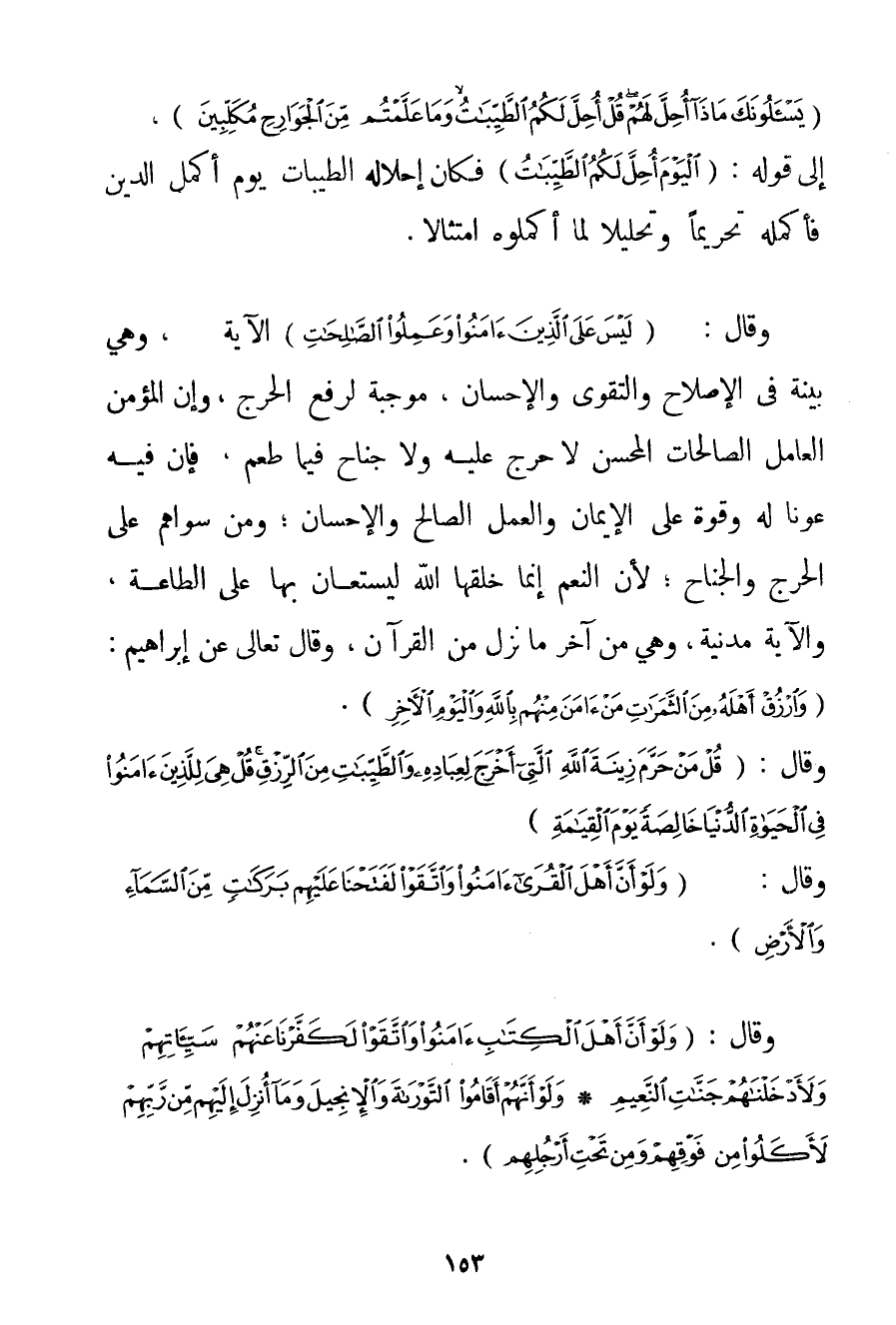 {يَسْأَلُونَكَ مَاذَا أُحِلَّ لَهُمْ قُلْ أُحِلَّ لَكُمُ الطَّيِّبَاتُ وَمَا عَلَّمْتُمْ مِنَ الْجَوَارِحِ مُكَلِّبِينَ} إلَى قَوْلِهِ: {الْيَوْمَ أُحِلَّ لَكُمُ الطَّيِّبَاتُ} فَكَانَ إحْلَالُهُ الطَّيِّبَاتِ يَوْمَ أَكْمَلَ الدِّينَ فَأَكْمَلَهُ تَحْرِيمًا وَتَحْلِيلًا لِمَا أَكْمَلُوهُ امْتِثَالًا. وَقَالَ: {لَيْسَ عَلَى الَّذِينَ آمَنُوا وَعَمِلُوا الصَّالِحَاتِ} الْآيَةَ وَهِيَ بَيِّنَةٌ فِي الْإِصْلَاحِ وَالتَّقْوَى وَالْإِحْسَانِ مُوجِبَةٌ لِرَفْعِ الْحَرَجِ وَإِنَّ الْمُؤْمِنَ الْعَامِلَ الصَّالِحَاتِ الْمُحْسِنَ لَا حَرَجَ عَلَيْهِ وَلَا جُنَاحَ فِيمَا طَعِمَ فَإِنَّ فِيهِ عَوْنًا لَهُ وَقُوَّةً عَلَى الْإِيمَانِ وَالْعَمَلِ الصَّالِحِ وَالْإِحْسَانِ: وَمَنْ سِوَاهُمْ عَلَى الْحَرَجِ وَالْجُنَاحِ؛ لِأَنَّ النِّعَمَ إنَّمَا خَلَقَهَا اللَّهُ لِيُسْتَعَانَ بِهَا عَلَى الطَّاعَةِ وَالْآيَةُ مَدَنِيَّةٌ وَهِيَ مِنْ آخِرِ مَا نَزَلَ مِنْ الْقُرْآنِ وَقَالَ تَعَالَى عَنْ إبْرَاهِيمَ: {وَارْزُقْ أَهْلَهُ مِنَ الثَّمَرَاتِ مَنْ آمَنَ مِنْهُمْ بِاللَّهِ وَالْيَوْمِ الْآخِرِ} وَقَالَ: {قُلْ مَنْ حَرَّمَ زِينَةَ اللَّهِ الَّتِي أَخْرَجَ لِعِبَادِهِ وَالطَّيِّبَاتِ مِنَ الرِّزْقِ قُلْ هِيَ لِلَّذِينَ آمَنُوا فِي الْحَيَاةِ الدُّنْيَا خَالِصَةً يَوْمَ الْقِيَامَةِ} وَقَالَ: {وَلَوْ أَنَّ أَهْلَ الْقُرَى آمَنُوا وَاتَّقَوْا لَفَتَحْنَا عَلَيْهِمْ بَرَكَاتٍ مِنَ السَّمَاءِ وَالْأَرْضِ} . وَقَالَ. {وَلَوْ أَنَّ أَهْلَ الْكِتَابِ آمَنُوا وَاتَّقَوْا لَكَفَّرْنَا عَنْهُمْ سَيِّئَاتِهِمْ وَلَأَدْخَلْنَاهُمْ جَنَّاتِ النَّعِيمِ} {وَلَوْ أَنَّهُمْ أَقَامُوا التَّوْرَاةَ وَالْإِنْجِيلَ وَمَا أُنْزِلَ إلَيْهِمْ مِنْ رَبِّهِمْ لَأَكَلُوا مِنْ فَوْقِهِمْ وَمِنْ تَحْتِ أَرْجُلِهِمْ} .