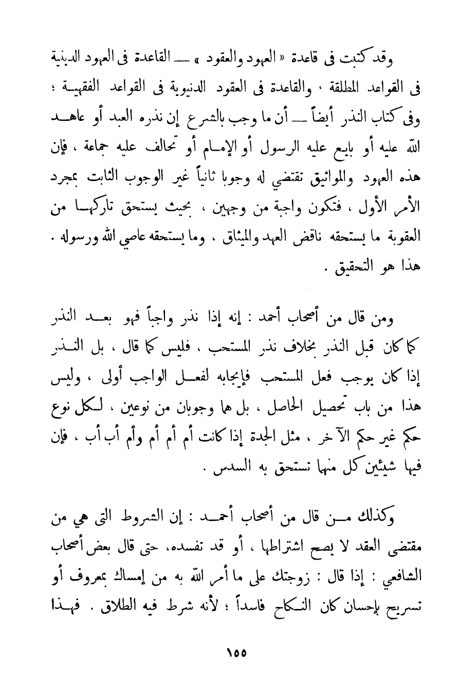 وَقَدْ كَتَبْت فِي قَاعِدَةِ " الْعُهُودِ وَالْعُقُودِ " - الْقَاعِدَةِ فِي الْعُهُودِ الدِّينِيَّةِ فِي الْقَوَاعِدِ الْمُطْلَقَةِ وَالْقَاعِدَةِ فِي الْعُقُودِ الدُّنْيَوِيَّةِ فِي الْقَوَاعِدِ الْفِقْهِيَّةِ؛ وَفِي كِتَابِ النَّذْرِ أَيْضًا - أَنَّ مَا وَجَبَ بِالشَّرْعِ إنْ نَذَرَهُ الْعَبْدُ أَوْ عَاهَدَ اللَّهَ عَلَيْهِ أَوْ بَايَعَ عَلَيْهِ الرَّسُولَ أَوْ الْإِمَامَ أَوْ تَحَالَفَ عَلَيْهِ جَمَاعَةٌ فَإِنَّ هَذِهِ الْعُهُودَ وَالْمَوَاثِيقَ تَقْتَضِي لَهُ وُجُوبًا ثَانِيًا غَيْرَ الْوُجُوبِ الثَّابِتِ بِمُجَرَّدِ الْأَمْرِ الْأَوَّلِ فَتَكُونُ وَاجِبَةً مِنْ وَجْهَيْنِ بِحَيْثُ يَسْتَحِقُّ تَارِكُهَا مِنْ الْعُقُوبَةِ مَا يَسْتَحِقُّهُ نَاقِضُ الْعَهْدِ وَالْمِيثَاقِ وَمَا يَسْتَحِقُّهُ عَاصِي اللَّهِ وَرَسُولِهِ. هَذَا هُوَ التَّحْقِيقُ. وَمَنْ قَالَ مِنْ أَصْحَابِ أَحْمَد: إنَّهُ إذَا نَذَرَ وَاجِبًا فَهُوَ بَعْدَ النَّذْرِ كَمَا كَانَ قَبْلَ النَّذْرِ بِخِلَافِ نَذْرِ الْمُسْتَحَبِّ فَلَيْسَ كَمَا قَالَ بَلْ النَّذْرُ إذَا كَانَ يُوجِبُ فِعْلَ الْمُسْتَحَبِّ فَإِيجَابُهُ لِفِعْلِ الْوَاجِبِ أَوْلَى وَلَيْسَ هَذَا مِنْ بَابِ تَحْصِيلِ الْحَاصِلِ بَلْ هُمَا وجوبان مِنْ نَوْعَيْنِ لِكُلِّ نَوْعٍ حُكْمٌ غَيْرُ حُكْمِ الْآخَرِ مِثْلَ الْجَدَّةِ إذَا كَانَتْ أُمَّ أُمِّ أُمٍّ وَأُمَّ أب أَبٍ فَإِنَّ فِيهَا شَيْئَيْنِ كُلٌّ مِنْهُمَا تَسْتَحِقُّ بِهِ السُّدُسَ.