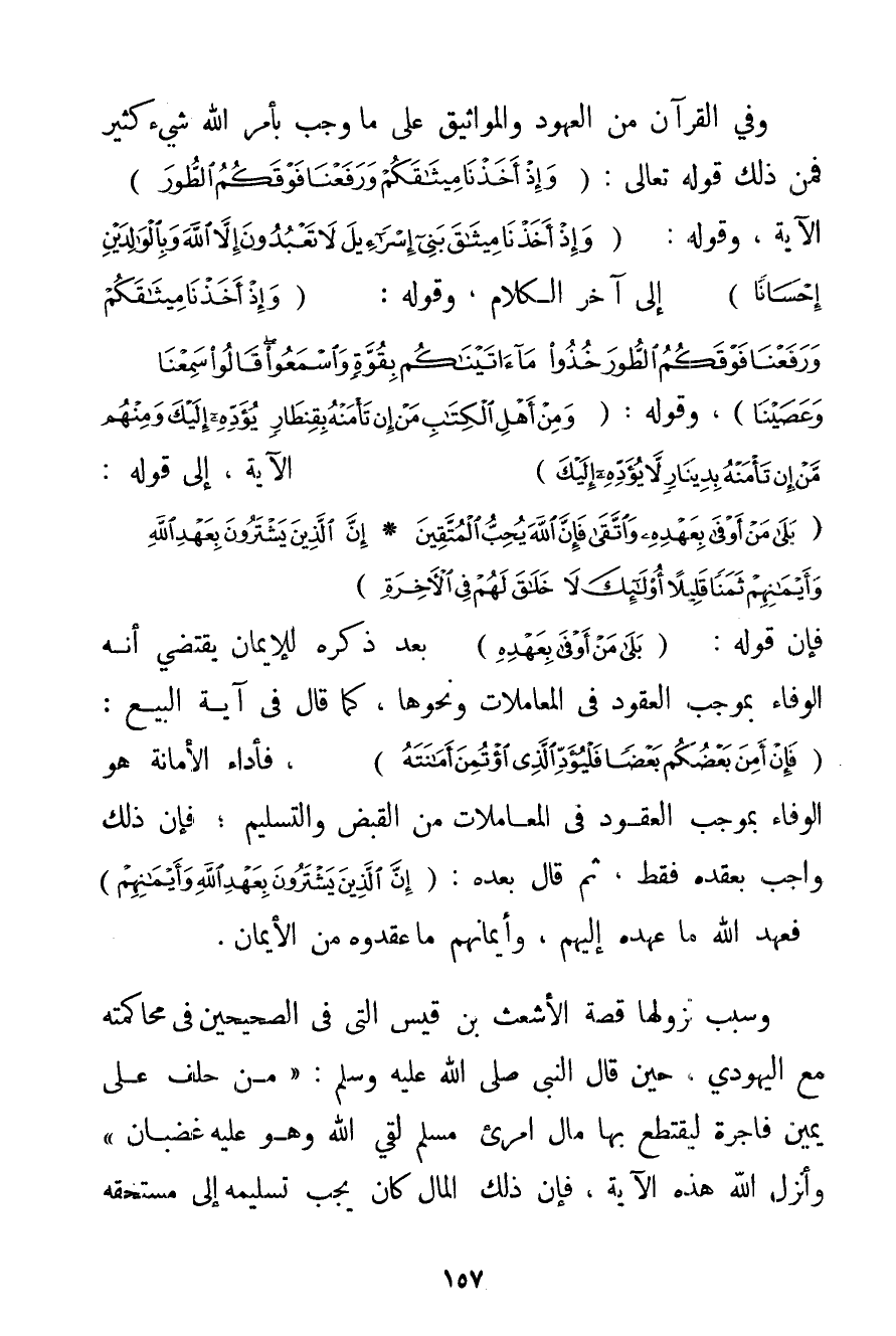 وَفِي الْقُرْآنِ مِنْ الْعُهُودِ وَالْمَوَاثِيقِ عَلَى مَا وَجَبَ بِأَمْرِ اللَّهِ شَيْءٌ كَثِيرٌ فَمِنْ ذَلِكَ قَوْله تَعَالَى {وَإِذْ أَخَذْنَا مِيثَاقَكُمْ وَرَفَعْنَا فَوْقَكُمُ الطُّورَ} الْآيَةَ وَقَوْلُهُ: {وَإِذْ أَخَذْنَا مِيثَاقَ بَنِي إسْرَائِيلَ لَا تَعْبُدُونَ إلَّا اللَّهَ وَبِالْوَالِدَيْنِ إحْسَانًا} إلَى آخِرِ الْكَلَامِ وَقَوْلُهُ: {وَإِذْ أَخَذْنَا مِيثَاقَكُمْ وَرَفَعْنَا فَوْقَكُمُ الطُّورَ خُذُوا مَا آتَيْنَاكُمْ بِقُوَّةٍ وَاسْمَعُوا قَالُوا سَمِعْنَا وَعَصَيْنَا} وَقَوْلُهُ: {وَمِنْ أَهْلِ الْكِتَابِ مَنْ إنْ تَأْمَنْهُ بِقِنْطَارٍ يُؤَدِّهِ إلَيْكَ وَمِنْهُمْ مَنْ إنْ تَأْمَنْهُ بِدِينَارٍ لَا يُؤَدِّهِ إلَيْكَ} الْآيَةَ إلَى قَوْلِهِ: {بَلَى مَنْ أَوْفَى بِعَهْدِهِ وَاتَّقَى فَإِنَّ اللَّهَ يُحِبُّ الْمُتَّقِينَ} {إنَّ الَّذِينَ يَشْتَرُونَ بِعَهْدِ اللَّهِ وَأَيْمَانِهِمْ ثَمَنًا قَلِيلًا أُولَئِكَ لَا خَلَاقَ لَهُمْ فِي الْآخِرَةِ} فَإِنَّ قَوْلَهُ: {بَلَى مَنْ أَوْفَى بِعَهْدِهِ} بَعْدَ ذِكْرِهِ لِلْإِيمَانِ يَقْتَضِي أَنَّهُ الْوَفَاءُ بِمُوجَبِ الْعُقُودِ فِي الْمُعَامَلَاتِ وَنَحْوِهَا كَمَا قَالَ فِي آيَةِ الْبَيْعِ: {فَإِنْ أَمِنَ بَعْضُكُمْ بَعْضًا فَلْيُؤَدِّ الَّذِي اؤْتُمِنَ أَمَانَتَهُ} فَأَدَاءُ الْأَمَانَةِ هُوَ الْوَفَاءُ بِمُوجَبِ الْعُقُودِ فِي الْمُعَامَلَاتِ مِنْ الْقَبْضِ وَالتَّسْلِيمِ؛ فَإِنَّ ذَلِكَ وَاجِبٌ بِعَقْدِهِ فَقَطْ ثُمَّ قَالَ بَعْدَهُ: {إنَّ الَّذِينَ يَشْتَرُونَ بِعَهْدِ اللَّهِ وَأَيْمَانِهِمْ} فَعَهْدُ اللَّهِ مَا عَهِدَهُ إلَيْهِمْ وَأَيْمَانُهُمْ مَا عَقَدُوهُ مِنْ الْأَيْمَانِ. وَسَبَبُ نُزُولِهَا قِصَّةُ الْأَشْعَثِ بْنِ قَيْسٍ الَّتِي فِي الصَّحِيحَيْنِ فِي مُحَاكَمَتِهِ مَعَ الْيَهُودِيِّ حِينَ قَالَ النَّبِيُّ صَلَّى اللَّهُ عَلَيْهِ وَسَلَّمَ {مَنْ حَلَفَ عَلَى يَمِينٍ فَاجِرَةٍ لِيَقْتَطِعَ بِهَا مَالَ امْرِئٍ مُسْلِمٍ لَقِيَ اللَّهَ وَهُوَ عَلَيْهِ غَضْبَانُ} وَأَنْزَلَ اللَّهُ هَذِهِ الْآيَةَ فَإِنَّ ذَلِكَ الْمَالَ كَانَ يَجِبُ تَسْلِيمُهُ إلَى مُسْتَحِقِّهِ