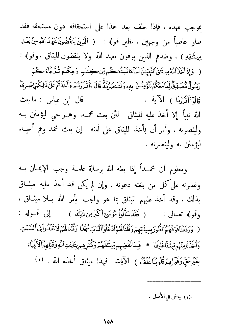 بِمُوجَبِ عَهْدِهِ فَإِذَا حَلَفَ بَعْدَ هَذَا عَلَى اسْتِحْقَاقِهِ دُونَ مُسْتَحِقِّهِ فَقَدْ صَارَ عَاصِيًا مِنْ وَجْهَيْنِ نَظِيرَ قَوْلِهِ: {الَّذِينَ يَنْقُضُونَ عَهْدَ اللَّهِ مِنْ بَعْدِ مِيثَاقِهِ} وَضِدُّهُمْ الَّذِينَ يُوفُونَ بِعَهْدِ اللَّهِ وَلَا يَنْقُضُونَ الْمِيثَاقَ وَقَوْلُهُ: {وَإِذْ أَخَذَ اللَّهُ مِيثَاقَ النَّبِيِّينَ لَمَا آتَيْتُكُمْ مِنْ كِتَابٍ وَحِكْمَةٍ ثُمَّ جَاءَكُمْ رَسُولٌ مُصَدِّقٌ لِمَا مَعَكُمْ لَتُؤْمِنُنَّ بِهِ وَلَتَنْصُرُنَّهُ قَالَ أَأَقْرَرْتُمْ وَأَخَذْتُمْ عَلَى ذَلِكُمْ إصْرِي قَالُوا أَقْرَرْنَا} الْآيَةَ قَالَ ابْنُ عَبَّاسٍ: مَا بَعَثَ اللَّهُ نَبِيًّا إلَّا أَخَذَ عَلَيْهِ الْمِيثَاقَ: لَئِنْ بُعِثَ مُحَمَّدٌ وَهُوَ حَيٌّ لَيُؤْمِنُنَّ بِهِ وَلَيَنْصُرُنَّهُ وَأَمَرَ أَنْ يَأْخُذَ الْمِيثَاقَ عَلَى أُمَّتِهِ: إنْ بُعِثَ مُحَمَّدٌ وَهُمْ أَحْيَاءٌ لَيُؤْمِنُنَّ بِهِ وَلَيَنْصُرُنَّهُ. وَمَعْلُومٌ أَنَّ مُحَمَّدًا إذَا بَعَثَهُ اللَّهُ بِرِسَالَةِ عَامَّةٍ وَجَبَ الْإِيمَانُ بِهِ وَنُصْرَتُهُ عَلَى كُلِّ مَنْ بَلَغَتْهُ دَعْوَتُهُ وَإِنْ لَمْ يَكُنْ قَدْ أُخِذَ عَلَيْهِ مِيثَاقٌ بِذَلِكَ وَقَدْ أُخِذَ عَلَيْهِمْ الْمِيثَاقُ بِمَا هُوَ وَاجِبٌ بِأَمْرِ اللَّهِ بِلَا مِيثَاقٍ وقَوْله تَعَالَى {فَقَدْ سَأَلُوا مُوسَى أَكْبَرَ مِنْ ذَلِكَ} إلَى قَوْلِهِ: {وَرَفَعْنَا فَوْقَهُمُ الطُّورَ بِمِيثَاقِهِمْ وَقُلْنَا لَهُمُ ادْخُلُوا الْبَابَ سُجَّدًا وَقُلْنَا لَهُمْ لَا تَعْدُوا فِي السَّبْتِ وَأَخَذْنَا مِنْهُمْ مِيثَاقًا غَلِيظًا} {فَبِمَا نَقْضِهِمْ مِيثَاقَهُمْ وَكُفْرِهِمْ بِآيَاتِ اللَّهِ وَقَتْلِهِمُ الْأَنْبِيَاءَ بِغَيْرِ حَقٍّ وَقَوْلِهِمْ قُلُوبُنَا غُلْفٌ} الْآيَاتِ فَهَذَا مِيثَاقٌ أَخَذَهُ اللَّهُ. . . (1) .