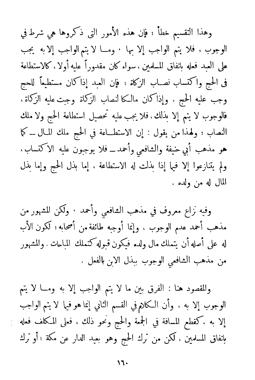 وَهَذَا التَّقْسِيمُ خَطَأٌ؛ فَإِنَّ هَذِهِ الْأُمُورَ الَّتِي ذَكَرُوهَا هِيَ شَرْطٌ فِي الْوُجُوبِ فَلَا يَتِمُّ الْوَاجِبُ إلَّا بِهَا وَمَا لَا يَتِمُّ الْوَاجِبُ إلَّا بِهِ يَجِبُ عَلَى الْعَبْدِ فِعْلُهُ بِاتِّفَاقِ الْمُسْلِمِينَ سَوَاءٌ كَانَ مَقْدُورًا عَلَيْهِ أَوْ لَا كَالِاسْتِطَاعَةِ فِي الْحَجِّ وَاكْتِسَابِ نِصَابِ الزَّكَاةِ؛ فَإِنَّ الْعَبْدَ إذَا كَانَ مُسْتَطِيعًا لِلْحَجِّ وَجَبَ عَلَيْهِ الْحَجُّ وَإِذَا كَانَ مَالِكًا لِنِصَابِ الزَّكَاةِ وَجَبَتْ عَلَيْهِ الزَّكَاةُ فَالْوُجُوبُ لَا يَتِمُّ إلَّا بِذَلِكَ فَلَا يَجِبُ عَلَيْهِ تَحْصِيلُ اسْتِطَاعَةِ الْحَجِّ وَلَا مِلْكُ النِّصَابِ؛ وَلِهَذَا مَنْ يَقُولُ: إنَّ الِاسْتِطَاعَةَ فِي الْحَجِّ مِلْكُ الْمَالِ - كَمَا هُوَ مَذْهَبُ أَبِي حَنِيفَةَ وَالشَّافِعِيِّ وَأَحْمَد - فَلَا يُوجِبُونَ عَلَيْهِ الِاكْتِسَابَ وَلَمْ يَتَنَازَعُوا إلَّا فِيمَا إذَا بُذِلَتْ لَهُ الِاسْتِطَاعَةُ إمَّا بَذْلَ الْحَجِّ وَإِمَّا بَذْلَ الْمَالِ لَهُ مِنْ وَلَدِهِ. وَفِيهِ نِزَاعٌ مَعْرُوفٌ فِي مَذْهَبِ الشَّافِعِيِّ وَأَحْمَد وَلَكِنَّ الْمَشْهُورَ مِنْ مَذْهَبِ أَحْمَد عَدَمُ الْوُجُوبِ وَإِنَّمَا أَوْجَبَهُ طَائِفَةٌ مِنْ أَصْحَابِهِ؛ لِكَوْنِ الْأَبِ لَهُ عَلَى أَصْلِهِ أَنْ يَتَمَلَّكَ مَالَ وَلَدِهِ فَيَكُونُ قَبُولُهُ كَتَمَلُّكِ الْمُبَاحَاتِ. وَالْمَشْهُورُ مِنْ مَذْهَبِ الشَّافِعِيِّ الْوُجُوبُ بِبَذْلِ الِابْنِ بِالْفِعْلِ. وَالْمَقْصُودُ هُنَا: الْفَرْقُ بَيْنَ مَا لَا يَتِمُّ الْوَاجِبُ إلَّا بِهِ وَمَا لَا يَتِمُّ الْوُجُوبُ إلَّا بِهِ وَأَنَّ الْكَلَامَ فِي الْقِسْمِ الثَّانِي إنَّمَا هُوَ فِيمَا لَا يَتِمُّ الْوَاجِبُ إلَّا بِهِ كَقَطْعِ الْمَسَافَةِ فِي الْجُمُعَةِ وَالْحَجِّ وَنَحْوِ ذَلِكَ فَعَلَى الْمُكَلَّفِ فِعْلُهُ بِاتِّفَاقِ الْمُسْلِمِينَ لَكِنْ مَنْ تَرَكَ الْحَجَّ وَهُوَ بَعِيدُ الدَّارِ عَنْ مَكَّةَ؛ أَوْ تَرَكَ