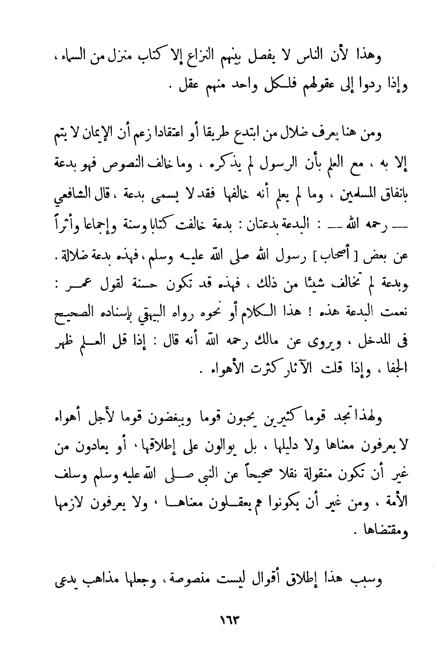 وَهَذَا لِأَنَّ النَّاسَ لَا يَفْصِلُ بَيْنَهُمْ النِّزَاعَ إلَّا كِتَابٌ مُنَزَّلٌ مِنْ السَّمَاءِ وَإِذَا رَدُّوا إلَى عُقُولِهِمْ فَلِكُلِّ وَاحِدٍ مِنْهُمْ عَقْلٌ. وَمِنْ هُنَا يُعْرَفُ ضَلَالُ مَنْ ابْتَدَعَ طَرِيقًا أَوْ اعْتِقَادًا زَعَمَ أَنَّ الْإِيمَانَ لَا يَتِمُّ إلَّا بِهِ مَعَ الْعِلْمِ بِأَنَّ الرَّسُولَ لَمْ يَذْكُرْهُ وَمَا خَالَفَ النُّصُوصَ فَهُوَ بِدْعَةٌ بِاتِّفَاقِ الْمُسْلِمِينَ وَمَا لَمْ يُعْلَمْ أَنَّهُ خَالَفَهَا فَقَدْ لَا يُسَمَّى بِدْعَةً قَالَ الشَّافِعِيُّ - رَحِمَهُ اللَّهُ -: الْبِدْعَةُ بِدْعَتَانِ: بِدْعَةٌ خَالَفَتْ كِتَابًا وَسُنَّةً وَإِجْمَاعًا وَأَثَرًا عَنْ بَعْضِ أَصْحَابِ رَسُولِ اللَّهِ صَلَّى اللَّهُ عَلَيْهِ وَسَلَّمَ فَهَذِهِ بِدْعَةُ ضَلَالَةٍ. وَبِدْعَةٌ لَمْ تُخَالِفْ شَيْئًا مِنْ ذَلِكَ فَهَذِهِ قَدْ تَكُونُ حَسَنَةً لِقَوْلِ عُمَرَ: نِعْمَتْ الْبِدْعَةُ هَذِهِ هَذَا الْكَلَامُ أَوْ نَحْوُهُ رَوَاهُ البيهقي بِإِسْنَادِهِ الصَّحِيحِ فِي الْمَدْخَلِ وَيُرْوَى عَنْ مَالِكٍ رَحِمَهُ اللَّهُ أَنَّهُ قَالَ: إذَا قَلَّ الْعِلْمُ ظَهَرَ الْجَفَا وَإِذَا قَلَّتْ الْآثَارُ كَثُرَتْ الْأَهْوَاءُ. وَلِهَذَا تَجِدُ قَوْمًا كَثِيرِينَ يُحِبُّونَ قَوْمًا وَيُبْغِضُونَ قَوْمًا لِأَجْلِ أَهْوَاءٍ لَا يَعْرِفُونَ مَعْنَاهَا وَلَا دَلِيلَهَا بَلْ يُوَالُونَ عَلَى إطْلَاقِهَا أَوْ يُعَادُونَ مِنْ غَيْرِ أَنْ تَكُونَ مَنْقُولَةً نَقْلًا صَحِيحًا عَنْ النَّبِيِّ صَلَّى اللَّهُ عَلَيْهِ وَسَلَّمَ وَسَلَفِ الْأُمَّةِ وَمِنْ غَيْرِ أَنْ يَكُونُوا هُمْ يَعْقِلُونَ مَعْنَاهَا وَلَا يَعْرِفُونَ لَازِمَهَا وَمُقْتَضَاهَا. وَسَبَبُ هَذَا إطْلَاقُ أَقْوَالٍ لَيْسَتْ مَنْصُوصَةً وَجَعْلُهَا مَذَاهِبَ يُدْعَى