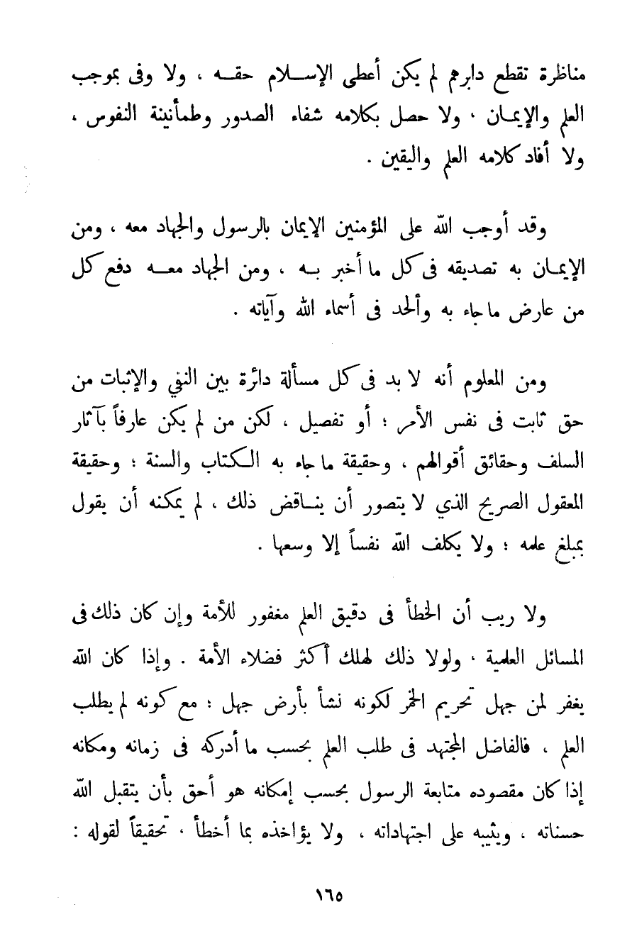 مُنَاظَرَةً تَقْطَعُ دَابِرَهُمْ لَمْ يَكُنْ أَعْطَى الْإِسْلَامَ حَقَّهُ وَلَا وَفَى بِمُوجِبِ الْعِلْمِ وَالْإِيمَانِ وَلَا حَصَلَ بِكَلَامِهِ شِفَاءُ الصُّدُورِ وَطُمَأْنِينَةُ النُّفُوسِ وَلَا أَفَادَ كَلَامُهُ الْعِلْمَ وَالْيَقِينَ. وَقَدْ أَوْجَبَ اللَّهُ عَلَى الْمُؤْمِنِينَ الْإِيمَانَ بِالرَّسُولِ وَالْجِهَادَ مَعَهُ وَمِنْ الْإِيمَانِ بِهِ تَصْدِيقُهُ فِي كُلِّ مَا أَخْبَرَ بِهِ وَمِنْ الْجِهَادِ مَعَهُ دَفْعُ كُلِّ مَنْ عَارَضَ مَا جَاءَ بِهِ وَأَلْحَدَ فِي أَسْمَاءِ اللَّهِ وَآيَاتِهِ. وَمِنْ الْمَعْلُومِ أَنَّهُ لَا بُدَّ فِي كُلِّ مَسْأَلَةٍ دَائِرَةٍ بَيْنَ النَّفْيِ وَالْإِثْبَاتِ مِنْ حَقٍّ ثَابِتٍ فِي نَفْسِ الْأَمْرِ؛ أَوْ تَفْصِيلٍ لَكِنْ مَنْ لَمْ يَكُنْ عَارِفًا بِآثَارِ السَّلَفِ وَحَقَائِقِ أَقْوَالِهِمْ وَحَقِيقَةِ مَا جَاءَ بِهِ الْكِتَابُ وَالسُّنَّةُ؛ وَحَقِيقَةِ الْمَعْقُولِ الصَّرِيحِ الَّذِي لَا يُتَصَوَّرُ أَنْ يُنَاقِضَ ذَلِكَ لَمْ يُمْكِنْهُ أَنْ يَقُولَ بِمَبْلَغِ عِلْمِهِ؛ وَلَا يُكَلِّفُ اللَّهُ نَفْسًا إلَّا وُسْعَهَا.