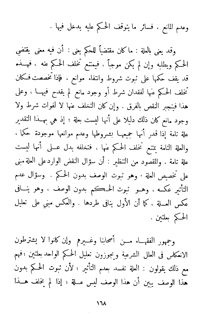 وَعَدَمَ الْمَانِعِ فَسَائِرُ مَا يَتَوَقَّفُ الْحُكْمُ عَلَيْهِ يَدْخُلُ فِيهَا. وَقَدْ يَعْنِي بِالْعِلَّةِ: مَا كَانَ مُقْتَضِيًا لِلْحُكْمِ يَعْنِي: أَنَّ فِيهِ مَعْنًى يَقْتَضِي الْحُكْمَ وَيَطْلُبُهُ وَإِنْ لَمْ يَكُنْ مُوجِبًا فَيَمْتَنِعُ تَخَلُّفُ الْحُكْمِ عَنْهُ فَهَذِهِ قَدْ يَقِفُ حُكْمُهَا عَلَى ثُبُوتِ شُرُوطٍ وَانْتِفَاءِ مَوَانِعَ فَإِذَا تَخَصَّصَتْ فَكَانَ تَخَلُّفُ الْحُكْمِ عَنْهَا لِفِقْدَانِ شَرْطٍ أَوْ وُجُودِ مَانِعٍ لَمْ يَقْدَحْ فِيهَا وَعَلَى هَذَا فَيَنْجَبِرُ النَّقْصُ بِالْفَرْقِ. وَإِنْ كَانَ التَّخَلُّفُ عَنْهَا لَا لِفَوَاتِ شَرْطٍ وَلَا وُجُودِ مَانِعٍ كَانَ ذَلِكَ دَلِيلًا عَلَى أَنَّهَا لَيْسَتْ بِعِلَّةِ؛ إذْ هِيَ بِهَذَا التَّقْدِيرِ عِلَّةٌ تَامَّةٌ إذَا قُدِّرَ أَنَّهَا جَمِيعُهَا بِشُرُوطِهَا وَعَدَمِ مَوَانِعِهَا مَوْجُودَةٌ حُكْمًا وَالْعِلَّةُ التَّامَّةُ يَمْتَنِعُ تَخَلُّفُ الْحُكْمِ عَنْهَا فَتَخَلُّفُهُ يَدُلُّ عَلَى أَنَّهَا لَيْسَتْ عِلَّةً تَامَّةً وَالْمَقْصُودُ مِنْ التَّنْظِيرِ: أَنَّ سُؤَالَ النَّقْضِ الْوَارِدِ عَلَى الْعِلَّةِ مَبْنِيٌّ عَلَى تَخْصِيصِ الْعِلَّةِ وَهُوَ ثُبُوتُ الْوَصْفِ بِدُونِ الْحُكْمِ. وَسُؤَالُ عَدَمِ التَّأْثِيرِ عَكْسُهُ وَهُوَ ثُبُوتُ الْحُكْمِ بِدُونِ الْوَصْفِ وَهُوَ يُنَافِي عَكْسَ الْعِلَّةِ كَمَا أَنَّ الْأَوَّلَ يُنَافِي طَرْدَهَا. وَالْعَكْسُ مَبْنِيٌّ عَلَى تَعْلِيلِ الْحُكْمِ بِعِلَّتَيْنِ. وَجُمْهُورُ الْفُقَهَاءِ مِنْ أَصْحَابِنَا وَغَيْرِهِمْ وَإِنْ كَانُوا لَا يَشْتَرِطُونَ الِانْعِكَاسَ فِي الْعِلَلِ الشَّرْعِيَّةِ وَيُجَوِّزُونَ تَعْلِيلَ الْحُكْمِ الْوَاحِدِ بِعِلَّتَيْنِ؛ فَهُمْ مَعَ ذَلِكَ يَقُولُونَ: الْعِلَّةُ تَفْسُدُ بِعَدَمِ التَّأْثِيرِ؛ لِأَنَّ ثُبُوتَ الْحُكْمِ بِدُونِ هَذَا الْوَصْفِ يُبَيِّنُ أَنَّ هَذَا الْوَصْفَ لَيْسَ عِلَّةً؛ إذَا لَمْ يُخْلِفْ هَذَا