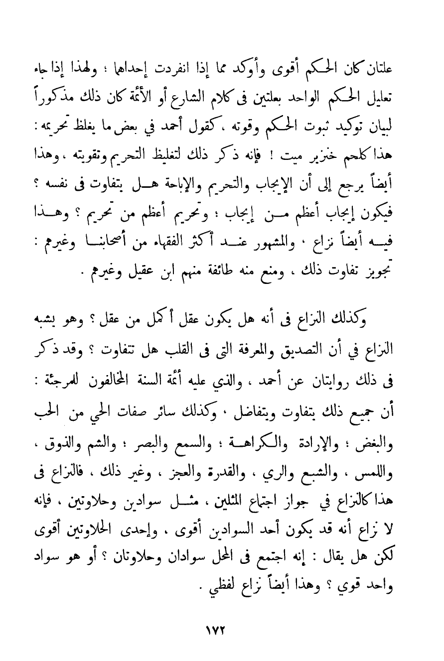 عِلَّتَانِ كَانَ الْحُكْمُ أَقْوَى وَأَوْكَدَ مِمَّا إذَا انْفَرَدَتْ إحْدَاهُمَا؛ وَلِهَذَا إذَا جَاءَ تَعْلِيلُ الْحُكْمِ الْوَاحِدِ بِعِلَّتَيْنِ فِي كَلَامِ الشَّارِعِ أَوْ الْأَئِمَّةِ كَانَ ذَلِكَ مَذْكُورًا لِبَيَانِ تَوْكِيدِ ثُبُوتِ الْحُكْمِ وَقُوَّتِهِ كَقَوْلِ أَحْمَد فِي بَعْضِ مَا يَغْلُظُ تَحْرِيمُهُ: هَذَا كَلَحْمِ خِنْزِيرٍ مَيِّتٍ فَإِنَّهُ ذَكَرَ ذَلِكَ لِتَغْلِيظِ التَّحْرِيمِ وَتَقْوِيَتِهِ وَهَذَا أَيْضًا يَرْجِعُ إلَى أَنَّ الْإِيجَابَ وَالتَّحْرِيمَ وَالْإِبَاحَةَ هَلْ يَتَفَاوَتُ فِي نَفْسِهِ؟ فَيَكُونُ إيجَابٌ أَعْظَمَ مِنْ إيجَابٍ؛ وَتَحْرِيمٌ أَعْظَمَ مِنْ تَحْرِيمٍ؟ وَهَذَا فِيهِ أَيْضًا نِزَاعٌ وَالْمَشْهُورُ عِنْدَ أَكْثَرِ الْفُقَهَاءِ مِنْ أَصْحَابِنَا وَغَيْرِهِمْ: تَجْوِيزُ تَفَاوُتِ ذَلِكَ وَمَنَعَ مِنْهُ طَائِفَة مِنْهُمْ ابْنُ عَقِيلٍ وَغَيْرُهُمْ. وَكَذَلِكَ النِّزَاعُ فِي أَنَّهُ هَلْ يَكُونُ عَقْلٌ أَكْمَلَ مِنْ عَقْلٍ؟ وَهُوَ يُشْبِهُ النِّزَاعَ فِي أَنَّ التَّصْدِيقَ وَالْمَعْرِفَةَ الَّتِي فِي الْقَلْبِ هَلْ تَتَفَاوَتُ؟ وَقَدْ ذُكِرَ فِي ذَلِكَ رِوَايَتَانِ عَنْ أَحْمَد وَاَلَّذِي عَلَيْهِ أَئِمَّةُ السُّنَّةِ الْمُخَالِفُونَ لِلْمُرْجِئَةِ: أَنَّ جَمِيعَ ذَلِكَ يَتَفَاوَتُ وَيَتَفَاضَلُ وَكَذَلِكَ سَائِرُ صِفَاتِ الْحَيِّ مِنْ الْحُبِّ وَالْبُغْضِ؛ وَالْإِرَادَةِ وَالْكَرَاهَةِ؛ وَالسَّمْعِ وَالْبَصَرِ؛ وَالشَّمِّ وَالذَّوْقِ وَاللَّمْسِ وَالشِّبَعِ وَالرِّيِّ وَالْقُدْرَةِ وَالْعَجْزِ وَغَيْرِ ذَلِكَ فَالنِّزَاعُ فِي هَذَا كَالنِّزَاعِ فِي جَوَازِ اجْتِمَاعِ الْمِثْلَيْنِ مِثْلَ سوادين وَحَلَاوَتَيْنِ فَإِنَّهُ لَا نِزَاعَ أَنَّهُ قَدْ يَكُونُ أَحَدُ السوادين أَقْوَى وَإِحْدَى الْحَلَاوَتَيْنِ أَقْوَى لَكِنْ هَلْ يُقَالُ: إنَّهُ اجْتَمَعَ فِي الْمَحَلِّ سوادان وَحَلَاوَتَانِ؟ أَوْ هُوَ سَوَادٌ وَاحِدٌ قَوِيٌّ؟ وَهَذَا أَيْضًا نِزَاعٌ لَفْظِيٌّ.