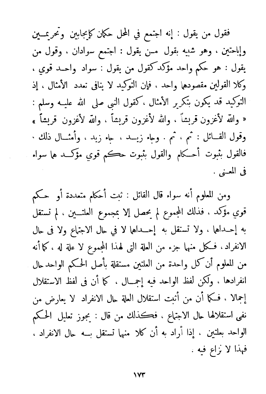 فَقَوْلُ مَنْ يَقُولُ: إنَّهُ اجْتَمَعَ فِي الْمَحَلِّ حُكْمَانِ كَإِيجَابَيْنِ وَتَحْرِيمَيْنِ وَإِبَاحَتَيْنِ وَهُوَ شَبِيهٌ بِقَوْلِ مَنْ يَقُولُ: اجْتَمَعَ سوادان وَقَوْلُ مَنْ يَقُولُ: هُوَ حُكْمٌ وَاحِدٌ مُؤَكَّدٌ كَقَوْلِ مَنْ يَقُولُ: سَوَادٌ وَاحِدٌ قَوِيٌّ وَكِلَا الْقَوْلَيْنِ مَقْصُودُهُمَا وَاحِدٌ فَإِنَّ التَّوْكِيدَ لَا يُنَافِي تَعَدُّدَ الْأَمْثَالِ إذْ التَّوْكِيدُ قَدْ يَكُونُ بِتَكْرِيرِ الْأَمْثَالِ {كَقَوْلِ النَّبِيِّ صَلَّى اللَّهُ عَلَيْهِ وَسَلَّمَ وَاَللَّهِ لَأَغْزُوَنَّ قُرَيْشًا وَاَللَّهِ لَأَغْزُوَنَّ قُرَيْشًا وَاَللَّهِ لَأَغْزُوَنَّ قُرَيْشًا} وَقَوْلُ الْقَائِلِ: ثُمَّ ثُمَّ. وَجَاءَ زَيْدٌ جَاءَ زَيْدٌ وَأَمْثَالُ ذَلِكَ فَالْقَوْلُ بِثُبُوتِ أَحْكَامٍ وَالْقَوْلُ بِثُبُوتِ حُكْمٍ قَوِيٍّ مُؤَكَّدٍ هُمَا سَوَاءٌ فِي الْمَعْنَى. وَمِنْ الْمَعْلُومِ أَنَّهُ سَوَاءٌ قَالَ الْقَائِلُ: ثَبَتَ أَحْكَامٌ مُتَعَدِّدَةٌ أَوْ حُكْمٌ قَوِيٌّ مُؤَكَّدٌ فَذَلِكَ الْمَجْمُوعُ لَمْ يَحْصُلْ إلَّا بِمَجْمُوعِ الْعِلَّتَيْنِ لَمْ تَسْتَقِلَّ بِهِ إحْدَاهُمَا وَلَا تَسْتَقِلُّ بِهِ إحْدَاهُمَا لَا فِي حَالِ الِاجْتِمَاعِ وَلَا فِي حَالِ الِانْفِرَادِ فَكُلٌّ مِنْهُمَا جُزْءٌ مِنْ الْعِلَّةِ الَّتِي لِهَذَا الْمَجْمُوعِ لَا عِلَّةٌ لَهُ كَمَا أَنَّهُ مِنْ الْمَعْلُومِ أَنَّ كُلَّ وَاحِدَةٍ مِنْ الْعِلَّتَيْنِ مُسْتَقِلَّةٌ بِأَصْلِ الْحُكْمِ الْوَاحِدِ حَالَ انْفِرَادِهَا وَلَكِنَّ لَفْظَ الْوَاحِدِ فِيهِ إجْمَالٌ كَمَا أَنَّ فِي لَفْظِ الِاسْتِقْلَالِ إجْمَالًا فَكَمَا أَنَّ مَنْ أَثْبَتَ اسْتِقْلَالَ الْعِلَّةِ حَالَ الِانْفِرَادِ لَا يُعَارِضُ مَنْ نَفَى اسْتِقْلَالَهَا حَالَ الِاجْتِمَاعِ فَكَذَلِكَ مَنْ قَالَ: يَجُوزُ تَعْلِيلُ الْحُكْمِ الْوَاحِدِ بِعِلَّتَيْنِ إذَا أَرَادَ بِهِ أَنَّ كُلًّا مِنْهُمَا تَسْتَقِلُّ بِهِ حَالَ الِانْفِرَادِ فَهَذَا لَا نِزَاعَ فِيهِ.