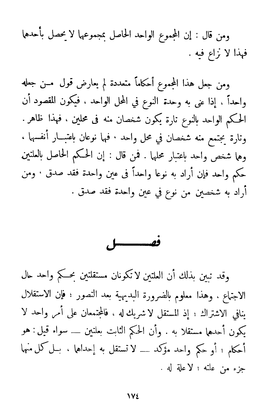 وَمَنْ قَالَ: إنَّ الْمَجْمُوعَ الْوَاحِدَ الْحَاصِلَ بِمَجْمُوعِهِمَا لَا يَحْصُلُ بِأَحَدِهِمَا فَهَذَا لَا نِزَاعَ فِيهِ. وَمَنْ جَعَلَ هَذَا الْمَجْمُوعَ أَحْكَامًا مُتَعَدِّدَةً لَمْ يُعَارِضْ قَوْلَ مَنْ جَعَلَهُ وَاحِدًا إذَا عَنَى بِهِ وِحْدَةَ النَّوْعِ فِي الْمَحَلِّ الْوَاحِدِ فَيَكُونُ الْمَقْصُودُ أَنَّ الْحُكْمَ الْوَاحِدَ بِالنَّوْعِ تَارَةً يَكُونُ شَخْصَانِ مِنْهُ فِي مَحَلَّيْنِ فَهَذَا ظَاهِرٌ. وَتَارَةً يَجْتَمِعُ مِنْهُ شَخْصَانِ فِي مَحَلٍّ وَاحِدٍ فَهُمَا نَوْعَانِ بِاعْتِبَارِ أَنْفُسِهِمَا وَهُمَا شَخْصٌ وَاحِدٌ بِاعْتِبَارِ مَحَلِّهِمَا. فَمَنْ قَالَ: إنَّ الْحُكْمَ الْحَاصِلَ بِالْعِلَّتَيْنِ حُكْمٌ وَاحِدٌ فَإِنْ أَرَادَ بِهِ نَوْعًا وَاحِدًا فِي عَيْنٍ وَاحِدَةٍ فَقَدْ صَدَقَ وَمَنْ أَرَادَ بِهِ شَخْصَيْنِ مِنْ نَوْعٍ فِي عَيْنٍ وَاحِدَةٍ فَقَدْ صَدَقَ.