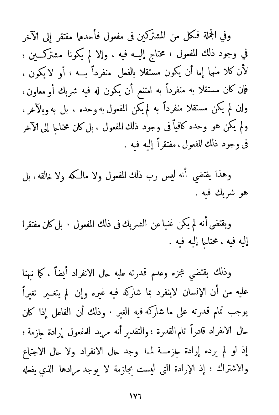 وَفِي الْجُمْلَةِ فَكُلٌّ مِنْ الْمُشْتَرِكَيْنِ فِي مَفْعُولٍ فَأَحَدُهُمَا مُفْتَقِرٌ إلَى الْآخَرِ فِي وُجُودِ ذَلِكَ الْمَفْعُولِ؛ مُحْتَاجٌ إلَيْهِ فِيهِ وَإِلَّا لَمْ يَكُونَا مُشْتَرِكَيْنِ؛ لِأَنَّ كُلًّا مِنْهُمَا إمَّا أَنْ يَكُونَ مُسْتَقِلًّا بِالْفِعْلِ مُنْفَرِدًا بِهِ؛ أَوْ لَا يَكُونَ فَإِنْ كَانَ مُسْتَقِلًّا بِهِ مُنْفَرِدًا بِهِ امْتَنَعَ أَنْ يَكُونَ لَهُ فِيهِ شَرِيكٌ أَوْ مُعَاوِنٌ وَإِنْ لَمْ يَكُنْ مُسْتَقِلًّا مُنْفَرِدًا بِهِ لَمْ يَكُنْ الْمَفْعُولَ بِهِ وَحْدَهُ بَلْ بِهِ وَبِالْآخَرِ وَلَمْ يَكُنْ هُوَ وَحْدَهُ كَافِيًا فِي وُجُودِ ذَلِكَ الْمَفْعُولِ بَلْ كَانَ مُحْتَاجًا إلَى الْآخَرِ فِي وُجُودِ ذَلِكَ الْمَفْعُولِ مُفْتَقِرًا إلَيْهِ فِيهِ. وَهَذَا يَقْتَضِي أَنَّهُ لَيْسَ رَبَّ ذَلِكَ الْمَفْعُولِ وَلَا مَالِكَهُ وَلَا خَالِقَهُ بَلْ هُوَ شَرِيكٌ فِيهِ. وَيَقْتَضِي أَنَّهُ لَمْ يَكُنْ غَنِيًّا عَنْ الشَّرِيكِ فِي ذَلِكَ الْمَفْعُولِ بَلْ كَانَ مُفْتَقِرًا إلَيْهِ فِيهِ مُحْتَاجًا إلَيْهِ فِيهِ. وَذَلِكَ يَقْتَضِي عَجْزَهُ وَعَدَمَ قُدْرَتِهِ عَلَيْهِ حَالَ الِانْفِرَادِ أَيْضًا كَمَا نَبَّهْنَا عَلَيْهِ مِنْ أَنَّ الْإِنْسَانَ لَا يَنْفَرِدُ بِمَا شَارَكَهُ فِيهِ غَيْرُهُ وَإِنْ لَمْ يَتَغَيَّرْ تَغَيُّرًا يُوجِبُ تَمَامَ قُدْرَتِهِ عَلَى مَا شَارَكَهُ فِيهِ الْغَيْرُ وَذَلِكَ أَنَّ الْفَاعِلَ إذَا كَانَ حَالَ الِانْفِرَادِ قَادِرًا تَامَّ الْقُدْرَةِ؛ وَالتَّقْدِيرُ أَنَّهُ مُرِيدٌ لِلْمَفْعُولِ إرَادَةً جَازِمَةً؛ إذْ لَوْ لَمْ يُرِدْهُ إرَادَةً جَازِمَةً لَمَا وُجِدَ حَالَ الِانْفِرَادِ وَلَا حَالَ الِاجْتِمَاعِ وَالِاشْتِرَاكِ: إذْ الْإِرَادَةُ الَّتِي لَيْسَتْ بِجَازِمَةٍ لَا يُوجَدُ مُرَادُهَا الَّذِي يَفْعَلُهُ