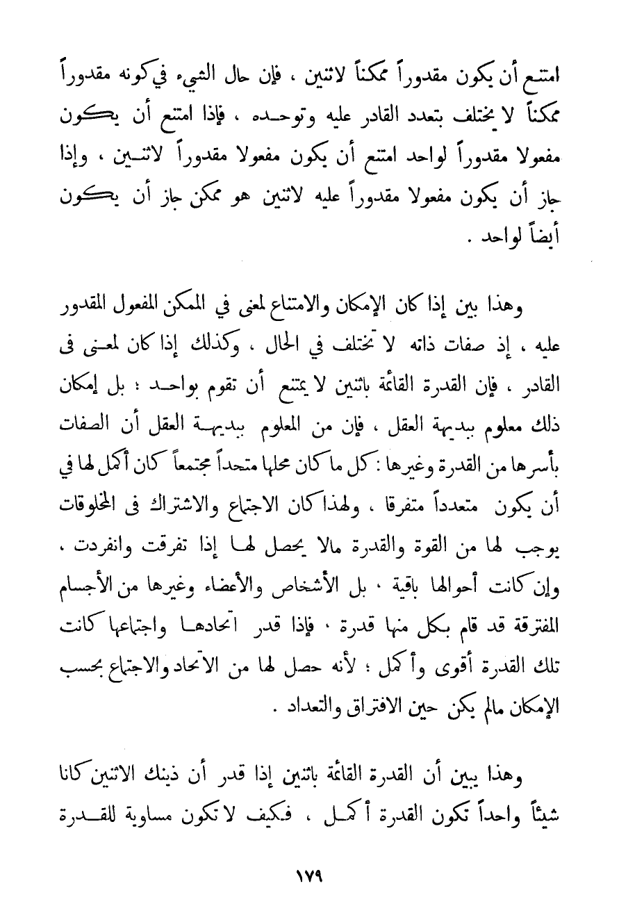 امْتَنَعَ أَنْ يَكُونَ مَقْدُورًا مُمْكِنًا لِاثْنَيْنِ فَإِنَّ حَالَ الشَّيْءِ فِي كَوْنِهِ مَقْدُورًا مُمْكِنًا لَا يَخْتَلِفُ بِتَعَدُّدِ الْقَادِرِ عَلَيْهِ وَتَوَحُّدِهِ فَإِذَا امْتَنَعَ أَنْ يَكُونَ مَفْعُولًا مَقْدُورًا لِوَاحِدِ امْتَنَعَ أَنْ يَكُونَ مَفْعُولًا مَقْدُورًا لِاثْنَيْنِ وَإِذَا جَازَ أَنْ يَكُونَ مَفْعُولًا مَقْدُورًا عَلَيْهِ لِاثْنَيْنِ هُوَ مُمْكِنٌ جَازَ أَنْ يَكُونَ أَيْضًا لِوَاحِدِ. وَهَذَا بَيِّنٌ إذَا كَانَ الْإِمْكَانُ وَالِامْتِنَاعُ لِمَعْنَى فِي الْمُمْكِنِ الْمَفْعُولِ الْمَقْدُورِ عَلَيْهِ إذْ صِفَاتُ ذَاتِهِ لَا تَخْتَلِفُ فِي الْحَالِ وَكَذَلِكَ إذَا كَانَ لِمَعْنَى فِي الْقَادِرِ فَإِنَّ الْقُدْرَةَ الْقَائِمَةَ بِاثْنَيْنِ لَا يَمْتَنِعُ أَنْ تَقُومَ بِوَاحِدِ؛ بَلْ إمْكَانُ ذَلِكَ مَعْلُومٌ بِبَدِيهَةِ الْعَقْلِ فَإِنَّ مِنْ الْمَعْلُومِ بِبَدِيهَةِ الْعَقْلِ أَنَّ الصِّفَاتِ بِأَسْرِهَا مِنْ الْقُدْرَةِ وَغَيْرِهَا: كُلُّ مَا كَانَ مَحَلُّهَا مُتَّحِدًا مُجْتَمِعًا كَانَ أَكْمَلَ لَهَا فِي أَنْ يَكُونَ مُتَعَدِّدًا مُتَفَرِّقًا وَلِهَذَا كَانَ الِاجْتِمَاعُ وَالِاشْتِرَاكُ فِي الْمَخْلُوقَاتِ يُوجِبُ لَهَا مِنْ الْقُوَّةِ وَالْقُدْرَةِ مَا لَا يَحْصُلُ لَهَا إذَا تَفَرَّقَتْ وَانْفَرَدَتْ وَإِنْ كَانَتْ أَحْوَالُهَا بَاقِيَةً بَلْ الْأَشْخَاصُ وَالْأَعْضَاءُ وَغَيْرُهَا مِنْ الْأَجْسَامِ الْمُفْتَرِقَةِ قَدْ قَامَ بِكُلِّ مِنْهَا قُدْرَةٌ فَإِذَا قُدِّرَ اتِّحَادُهَا وَاجْتِمَاعُهَا كَانَتْ تِلْكَ الْقُدْرَةُ أَقْوَى وَأَكْمَلَ؛ لِأَنَّهُ حَصَلَ لَهَا مِنْ الِاتِّحَادِ وَالِاجْتِمَاعِ بِحَسَبِ الْإِمْكَانِ مَا لَمْ يَكُنْ حِينَ الِافْتِرَاقِ وَالتَّعْدَادِ. وَهَذَا يُبَيِّنُ أَنَّ الْقُدْرَةَ الْقَائِمَةَ بِاثْنَيْنِ إذَا قُدِّرَ أَنَّ ذَيْنَك الِاثْنَيْنِ كَانَا شَيْئًا وَاحِدًا تَكُونُ الْقُدْرَةُ أَكْمَلَ فَكَيْفَ لَا تَكُونُ مُسَاوِيَةً لِلْقُدْرَةِ