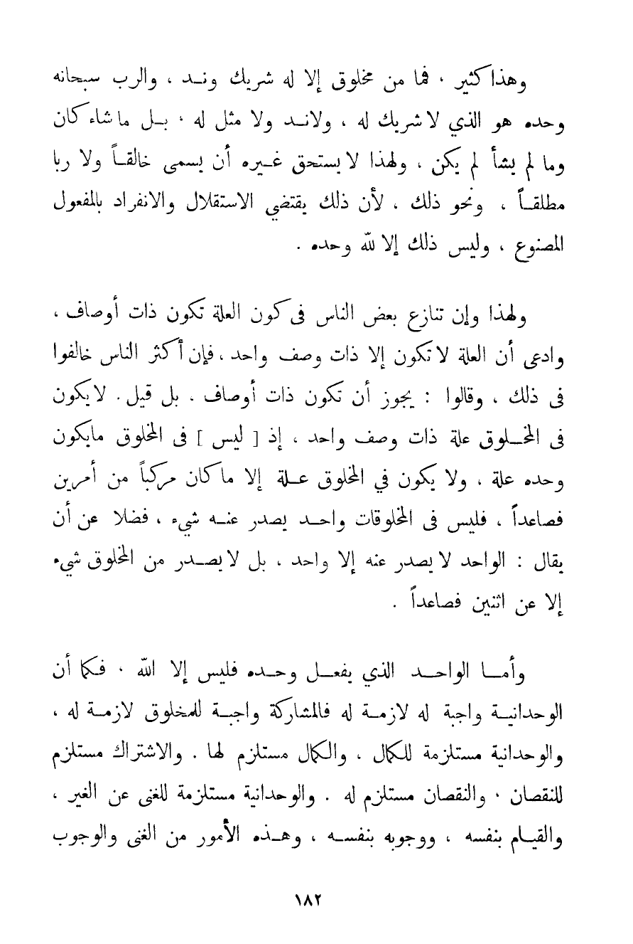 وَهَذَا كَثِيرٌ فَمَا مِنْ مَخْلُوقٍ إلَّا لَهُ شَرِيكٌ وَنِدٌّ وَالرَّبُّ سُبْحَانَهُ وَحْدَهُ هُوَ الَّذِي لَا شَرِيكَ لَهُ وَلَا نِدَّ وَلَا مِثْلَ لَهُ بَلْ مَا شَاءَ كَانَ وَمَا لَمْ يَشَأْ لَمْ يَكُنْ وَلِهَذَا لَا يَسْتَحِقُّ غَيْرُهُ أَنْ يُسَمَّى خَالِقًا وَلَا رَبًّا مُطْلَقًا وَنَحْوَ ذَلِكَ لِأَنَّ ذَلِكَ يَقْتَضِي الِاسْتِقْلَالَ وَالِانْفِرَادَ بِالْمَفْعُولِ الْمَصْنُوعِ وَلَيْسَ ذَلِكَ إلَّا لِلَّهِ وَحْدَهُ. وَلِهَذَا وَإِنْ تَنَازَعَ بَعْضُ النَّاسِ فِي كَوْنِ الْعِلَّةِ يَكُونُ ذَاتَ أَوْصَافٍ وَادَّعَى أَنَّ الْعِلَّةَ لَا تَكُونُ إلَّا ذَاتَ وَصْفٍ وَاحِدٍ فَإِنَّ أَكْثَرَ النَّاسِ خَالَفُوا فِي ذَلِكَ وَقَالُوا: يَجُوزُ أَنْ تَكُونَ ذَاتَ أَوْصَافٍ بَلْ قِيلَ: لَا يَكُونُ فِي الْمَخْلُوقِ عِلَّةٌ ذَاتُ وَصْفٍ وَاحِدٍ إذْ لَيْسَ فِي الْمَخْلُوقِ مَا يَكُونُ وَحْدَهُ عِلَّةً وَلَا يَكُونُ فِي الْمَخْلُوقِ عِلَّةٌ إلَّا مَا كَانَ مُرَكَّبًا مِنْ أَمْرَيْنِ فَصَاعِدًا فَلَيْسَ فِي الْمَخْلُوقَاتِ وَاحِدٌ يَصْدُرُ عَنْهُ شَيْءٌ فَضْلًا عَنْ أَنْ يُقَالَ: الْوَاحِدُ لَا يَصْدُرُ عَنْهُ إلَّا وَاحِدٌ بَلْ لَا يَصْدُرُ مِنْ الْمَخْلُوقِ شَيْءٌ إلَّا عَنْ اثْنَيْنِ فَصَاعِدًا. وَأَمَّا الْوَاحِدُ الَّذِي يَفْعَلُ وَحْدَهُ فَلَيْسَ إلَّا اللَّهُ فَكَمَا أَنَّ الْوَحْدَانِيَّةَ وَاجِبَةٌ لَهُ لَازِمَةٌ لَهُ فَالْمُشَارَكَةُ وَاجِبَةٌ لِلْمَخْلُوقِ لَازِمَةٌ لَهُ والوحدانية مُسْتَلْزِمَةٌ لِلْكَمَالِ وَالْكَمَالُ مُسْتَلْزِمٌ لَهَا. وَالِاشْتِرَاكُ مُسْتَلْزِمٌ لِلنُّقْصَانِ وَالنُّقْصَانُ مُسْتَلْزِمٌ لَهُ. والوحدانية مُسْتَلْزِمَةٌ لِلْغِنَى عَنْ الْغَيْرِ وَالْقِيَامِ بِنَفْسِهِ وَوُجُوبِهِ بِنَفْسِهِ وَهَذِهِ الْأُمُورُ مِنْ الْغِنَى وَالْوُجُوبِ بِالنَّفْسِ