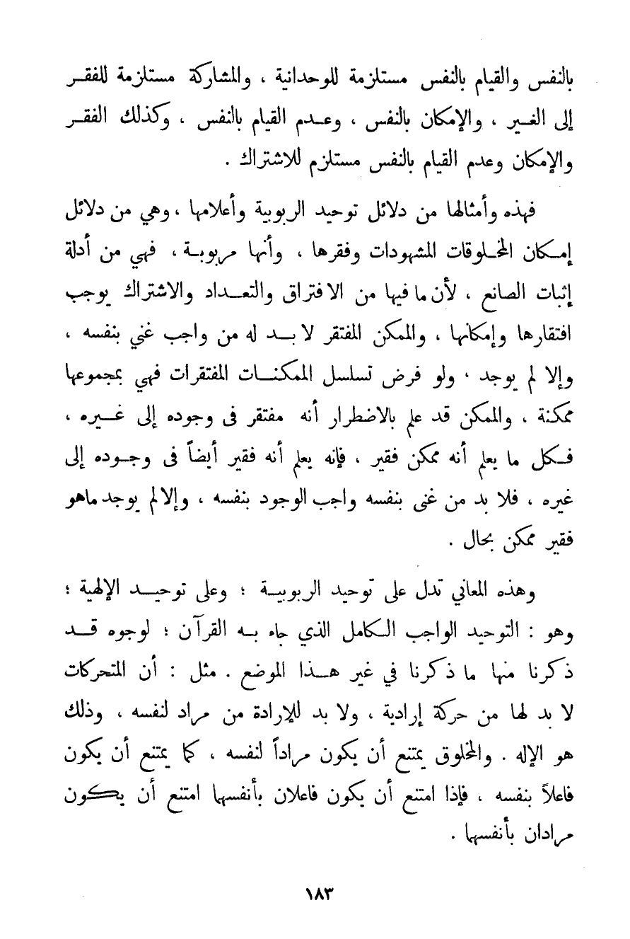 وَالْقِيَامِ بِالنَّفْسِ مُسْتَلْزِمَةٌ لِلْوَحْدَانِيَّةِ وَالْمُشَارَكَةُ مُسْتَلْزِمَةٌ لِلْفَقْرِ إلَى الْغَيْرِ وَالْإِمْكَانِ بِالنَّفْسِ وَعَدَمِ الْقِيَامِ بِالنَّفْسِ وَكَذَلِكَ الْفَقْرُ وَالْإِمْكَانُ وَعَدَمُ الْقِيَامِ بِالنَّفْسِ مُسْتَلْزِمٌ لِلِاشْتِرَاكِ. فَهَذِهِ وَأَمْثَالُهَا مِنْ دَلَائِلِ تَوْحِيدِ الرُّبُوبِيَّةِ وَأَعْلَامِهَا وَهِيَ مِنْ دَلَائِلِ إمْكَانِ الْمَخْلُوقَاتِ الْمَشْهُودَاتِ وَفَقْرِهَا وَأَنَّهَا مَرْبُوبَةٌ فَهِيَ مِنْ أَدِلَّةِ إثْبَاتِ الصَّانِعِ لِأَنَّ مَا فِيهَا مِنْ الِافْتِرَاقِ وَالتَّعْدَادِ وَالِاشْتِرَاكِ يُوجِبُ افْتِقَارَهَا وَإِمْكَانَهَا وَالْمُمْكِنُ الْمُفْتَقِرُ لَا بُدَّ لَهُ مِنْ وَاجِبٍ غَنِيٍّ بِنَفْسِهِ وَإِلَّا لَمْ يُوجَدْ وَلَوْ فُرِضَ تَسَلْسُلُ الْمُمْكِنَاتِ الْمُفْتَقِرَاتِ فَهِيَ بِمَجْمُوعِهَا مُمْكِنَةٌ وَالْمُمْكِنُ قَدْ عُلِمَ بِالِاضْطِرَارِ أَنَّهُ مُفْتَقِرٌ فِي وُجُودِهِ إلَى غَيْرِهِ فَكُلُّ مَا يُعْلَمُ أَنَّهُ مُمْكِنٌ فَقِيرٌ فَإِنَّهُ يُعْلَمُ أَنَّهُ فَقِيرٌ أَيْضًا فِي وُجُودِهِ إلَى غَيْرِهِ فَلَا بُدَّ مِنْ غَنِيٍّ بِنَفْسِهِ وَاجِبِ الْوُجُودِ بِنَفْسِهِ وَإِلَّا لَمْ يُوجَدْ مَا هُوَ فَقِيرٌ مُمْكِنٌ بِحَالِ. وَهَذِهِ الْمَعَانِي تَدُلُّ عَلَى تَوْحِيدِ الرُّبُوبِيَّةِ؛ وَعَلَى تَوْحِيدِ الْإِلَهِيَّةِ؛ وَهُوَ: التَّوْحِيدُ الْوَاجِبُ الْكَامِلُ الَّذِي جَاءَ بِهِ الْقُرْآنُ؛ لِوُجُوهِ قَدْ ذَكَرْنَا مِنْهَا مَا ذَكَرْنَا فِي غَيْرِ هَذَا الْمَوْضِعِ. مِثْلَ: أَنَّ الْمُتَحَرِّكَاتِ لَا بُدَّ لَهَا مِنْ حَرَكَةٍ إرَادِيَّةٍ وَلَا بُدَّ لِلْإِرَادَةِ مِنْ مُرَادٍ لِنَفْسِهِ وَذَلِكَ هُوَ الْإِلَهُ. وَالْمَخْلُوقُ يَمْتَنِعُ أَنْ يَكُونَ مُرَادًا لِنَفْسِهِ كَمَا يَمْتَنِعُ أَنْ يَكُونَ فَاعِلًا بِنَفْسِهِ فَإِذَا امْتَنَعَ أَنْ يَكُونَ فَاعِلَانِ بِأَنْفُسِهِمَا امْتَنَعَ أَنْ يَكُونَ مَرَادَانِ بِأَنْفُسِهِمَا.