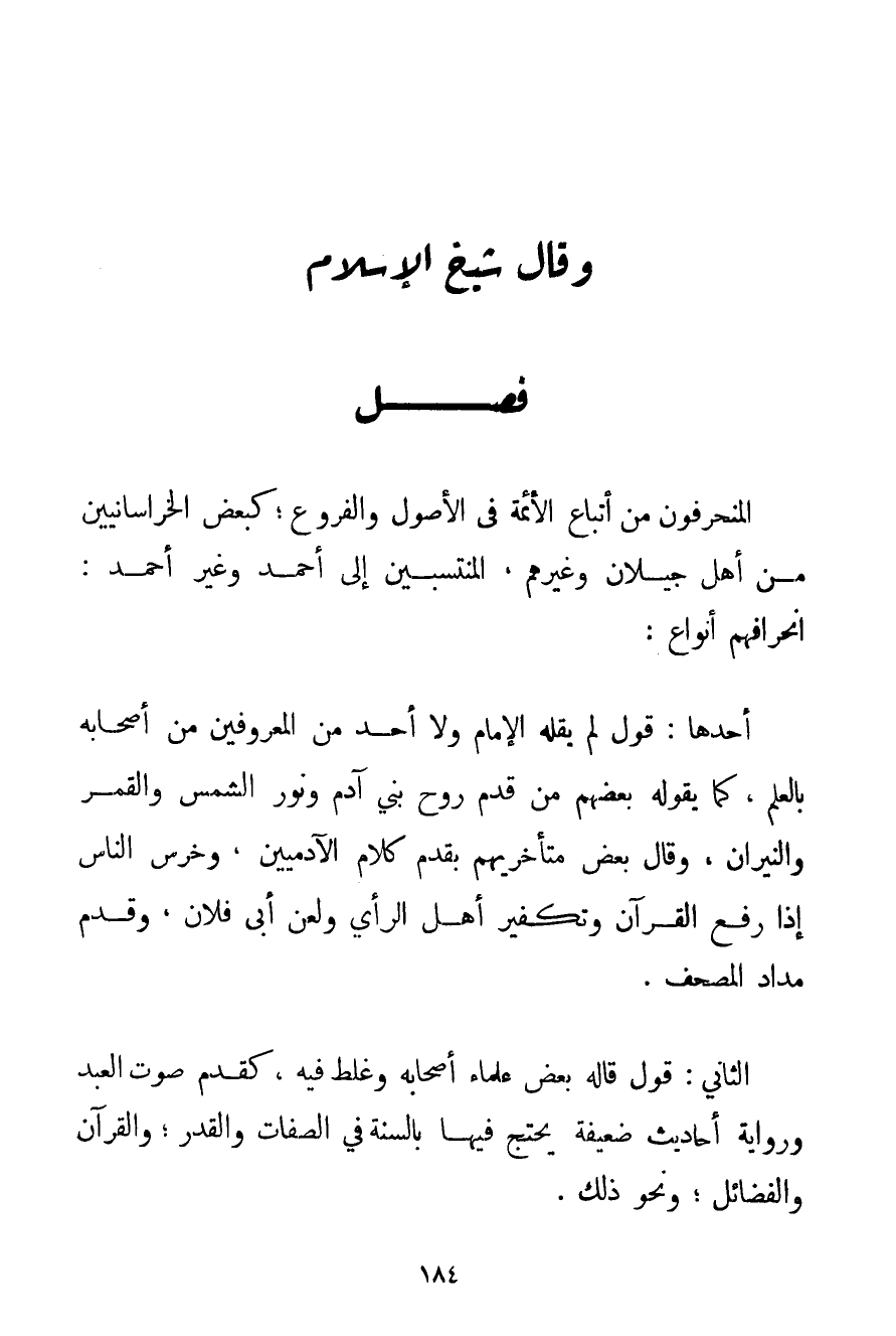 الْمُنْحَرِفُونَ مِنْ أَتْبَاعِ الْأَئِمَّةِ فِي الْأُصُولِ وَالْفُرُوعِ؛ كَبَعْضِ الْخُرَاسَانِيِينَ مِنْ أَهْلِ جِيلَانَ وَغَيْرِهِمْ الْمُنْتَسِبِينَ إلَى أَحْمَد وَغَيْرِ أَحْمَد: انْحِرَافُهُمْ أَنْوَاعٌ: أَحَدُهَا: قَوْلٌ لَمْ يَقُلْهُ الْإِمَامُ وَلَا أَحَدٌ مِنْ الْمَعْرُوفَيْنِ مِنْ أَصْحَابِهِ بِالْعِلْمِ كَمَا يَقُولُهُ بَعْضُهُمْ مِنْ قِدَمِ رُوحِ بَنِي آدَمَ وَنُورِ الشَّمْسِ وَالْقَمَرِ وَالنِّيرَانِ وَقَالَ بَعْضُ مُتَأَخِّرِيهِمْ بِقِدَمِ كَلَامِ الْآدَمِيِّينَ وَخَرَسِ النَّاسِ إذَا رُفِعَ الْقُرْآنُ وَتَكْفِيرِ أَهْلِ الرَّأْيِ وَلَعْنِ أَبِي فُلَانٍ وَقِدَمِ مِدَادِ الْمُصْحَفِ. الثَّانِي: قَوْلٌ قَالَهُ بَعْضُ عُلَمَاءِ أَصْحَابِهِ وَغَلِطَ فِيهِ كَقِدَمِ صَوْتِ الْعَبْدِ وَرِوَايَةِ أَحَادِيثَ ضَعِيفَةٍ يُحْتَجُّ فِيهَا بِالسُّنَّةِ فِي الصِّفَاتِ وَالْقَدَرِ؛ وَالْقُرْآنِ وَالْفَضَائِلِ؛ وَنَحْوِ ذَلِكَ.