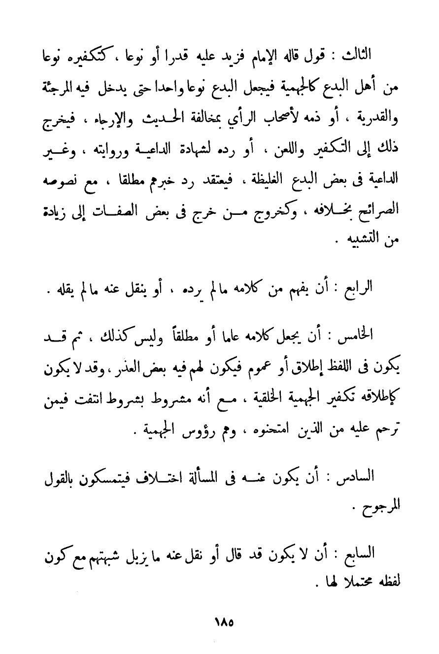 الثَّالِثُ: قَوْلٌ قَالَهُ الْإِمَامُ فَزِيدَ عَلَيْهِ قَدْرًا أَوْ نَوْعًا كَتَكْفِيرِهِ نَوْعًا مِنْ أَهْلِ الْبِدَعِ كالْجَهْمِيَّة فَيَجْعَلُ الْبِدَعَ نَوْعًا وَاحِدًا حَتَّى يَدْخُلَ فِيهِ الْمُرْجِئَةُ وَالْقَدَرِيَّةُ أَوْ ذَمَّهُ لِأَصْحَابِ الرَّأْيِ بِمُخَالَفَةِ الْحَدِيثِ وَالْإِرْجَاءِ فَيَخْرُجُ ذَلِكَ إلَى التَّكْفِيرِ وَاللَّعْنِ أَوْ رَدِّهِ لِشَهَادَةِ الدَّاعِيَةِ وَرِوَايَتِهِ وَغَيْرِ الدَّاعِيَةِ فِي بَعْضِ الْبِدَعِ الْغَلِيظَةِ فَيَعْتَقِدُ رَدَّ خَبَرِهِمْ مُطْلَقًا مَعَ نُصُوصِهِ الصَّرَائِحِ بِخِلَافِهِ وَكَخُرُوجِ مَنْ خَرَجَ فِي بَعْضِ الصِّفَاتِ إلَى زِيَادَةٍ مِنْ التَّشْبِيهِ. الرَّابِعُ: أَنْ يَفْهَمَ مِنْ كَلَامِهِ مَا لَمْ يُرِدْهُ أَوْ يَنْقُلَ عَنْهُ مَا لَمْ يَقُلْهُ. الْخَامِسُ: أَنْ يَجْعَلَ كَلَامَهُ عَامًّا أَوْ مُطْلَقًا وَلَيْسَ كَذَلِكَ ثُمَّ قَدْ يَكُونُ فِي اللَّفْظِ إطْلَاقٌ أَوْ عُمُومٌ فَيَكُونُ لَهُمْ فِيهِ بَعْضُ الْعُذْرِ وَقَدْ لَا يَكُونُ كَإِطْلَاقِهِ تَكْفِيرَ الْجَهْمِيَّة الْخِلْقِيَّةِ مَعَ أَنَّهُ مَشْرُوطٌ بِشُرُوطِ انْتَفَتْ فِيمَنْ تَرَحَّمَ عَلَيْهِ مِنْ الَّذِينَ امْتَحَنُوهُ وَهُمْ رُءُوسُ الْجَهْمِيَّة. السَّادِسُ: أَنْ يَكُونَ عَنْهُ فِي الْمَسْأَلَةِ اخْتِلَافٌ فَيَتَمَسَّكُونَ بِالْقَوْلِ الْمَرْجُوحِ. السَّابِعُ: أَنْ لَا يَكُونَ قَدْ قَالَ أَوْ نُقِلَ عَنْهُ مَا يُزِيلُ شُبْهَتَهُمْ مَعَ كَوْنِ لَفْظِهِ مُحْتَمِلًا لَهَا.