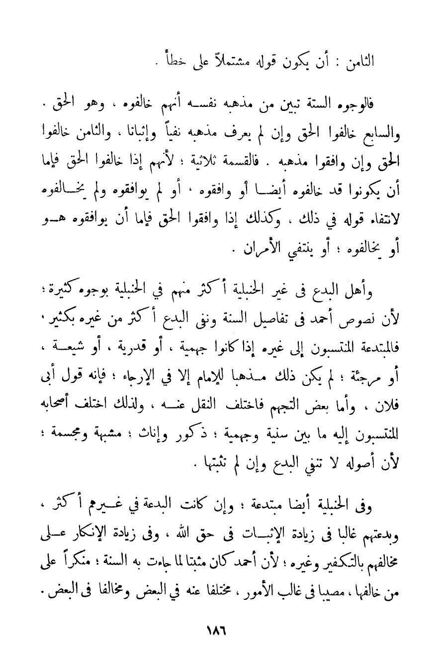 الثَّامِنُ: أَنْ يَكُونَ قَوْلُهُ مُشْتَمِلًا عَلَى خَطَأٍ. فَالْوُجُوهُ السِّتَّةُ تُبَيِّنُ مِنْ مَذْهَبِهِ نَفْسِهِ أَنَّهُمْ خَالَفُوهُ وَهُوَ الْحَقُّ وَالسَّابِعُ خَالَفُوا الْحَقَّ وَإِنْ لَمْ يَعْرِفْ مَذْهَبَهُ نَفْيًا وَإِثْبَاتًا وَالثَّامِنُ خَالَفُوا الْحَقَّ وَإِنْ وَافَقُوا مَذْهَبَهُ. فَالْقِسْمَةُ ثُلَاثِيَّةٌ؛ لِأَنَّهُمْ إذَا خَالَفُوا الْحَقَّ فَإِمَّا أَنْ يَكُونُوا قَدْ خَالَفُوهُ أَيْضًا أَوْ وَافَقُوهُ أَوْ لَمْ يُوَافِقُوهُ وَلَمْ يُخَالِفُوهُ لِانْتِفَاءِ قَوْلِهِ فِي ذَلِكَ وَكَذَلِكَ إذَا وَافَقُوا الْحَقَّ فَإِمَّا أَنْ يُوَافِقُوهُ هُوَ أَوْ يُخَالِفُوهُ؛ أَوْ يَنْتَفِيَ الْأَمْرَانِ. وَأَهْلُ الْبِدَعِ فِي غَيْرِ الْحَنْبَلِيَّةِ أَكْثَرُ مِنْهُمْ فِي الْحَنْبَلِيَّةِ بِوُجُوهِ كَثِيرَةٍ؛ لِأَنَّ نُصُوصَ أَحْمَد فِي تَفَاصِيلِ السُّنَّةِ وَنَفْيِ الْبِدَعِ أَكْثَرُ مِنْ غَيْرِهِ بِكَثِيرِ فَالْمُبْتَدِعَةُ الْمُنْتَسِبُونَ إلَى غَيْرِهِ إذَا كَانُوا جهمية أَوْ قَدَرِيَّةً أَوْ شِيعَةً أَوْ مُرْجِئَةً؛ لَمْ يَكُنْ ذَلِكَ مَذْهَبًا لِلْإِمَامِ إلَّا فِي الْإِرْجَاءِ؛ فَإِنَّهُ قَوْلُ أَبِي فُلَانٍ وَأَمَّا بَعْضُ التَّجَهُّمِ فَاخْتَلَفَ النَّقْلُ عَنْهُ وَلِذَلِكَ اخْتَلَفَ أَصْحَابُهُ الْمُنْتَسِبُونَ إلَيْهِ مَا بَيْنَ سُنِّيَّةٍ وجهمية؛ ذُكُورٍ وَإِنَاثٍ؛ مُشَبِّهَةٍ وَمُجَسِّمَةٍ؛ لِأَنَّ أُصُولَهُ لَا تَنْفِي الْبِدَعَ وَإِنْ لَمْ تُثْبِتْهَا. وَفِي الْحَنْبَلِيَّةِ أَيْضًا مُبْتَدِعَةٌ؛ وَإِنْ كَانَتْ الْبِدْعَةُ فِي غَيْرِهِمْ أَكْثَرَ وَبِدْعَتُهُمْ غَالِبًا فِي زِيَادَةِ الْإِثْبَاتِ فِي حَقِّ اللَّهِ وَفِي زِيَادَةِ الْإِنْكَارِ عَلَى مُخَالِفِهِمْ بِالتَّكْفِيرِ وَغَيْرِهِ؛ لِأَنَّ أَحْمَد كَانَ مُثْبِتًا لِمَا جَاءَتْ بِهِ السُّنَّةُ؛ مُنْكِرًا عَلَى مَنْ خَالَفَهَا مُصِيبًا فِي غَالِبِ الْأُمُورِ مُخْتَلِفًا عَنْهُ فِي الْبَعْضِ وَمُخَالِفًا فِي الْبَعْضِ.