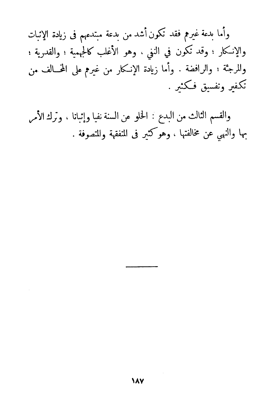وَأَمَّا بِدْعَةُ غَيْرِهِمْ فَقَدْ تَكُونُ أَشَدَّ مِنْ بِدْعَةِ مُبْتَدِعِهِمْ فِي زِيَادَةِ الْإِثْبَاتِ وَالْإِنْكَارِ؛ وَقَدْ تَكُونُ فِي النَّفْيِ وَهُوَ الْأَغْلَبُ كالْجَهْمِيَّة؛ وَالْقَدَرِيَّةِ؛ وَالْمُرْجِئَةِ؛ وَالرَّافِضَةِ. وَأَمَّا زِيَادَةُ الْإِنْكَارِ مِنْ غَيْرِهِمْ عَلَى الْمُخَالِفِ مِنْ تَكْفِيرٍ وَتَفْسِيقٍ فَكَثِيرٌ. وَالْقِسْمُ الثَّالِثُ مِنْ الْبِدَعِ: الْخُلُوُّ عَنْ السُّنَّةِ نَفْيًا وَإِثْبَاتًا وَتَرْكُ الْأَمْرِ بِهَا وَالنَّهْيِ عَنْ مُخَالَفَتِهَا وَهُوَ كَثِيرٌ فِي الْمُتَفَقِّهَةِ وَالْمُتَصَوِّفَةِ.