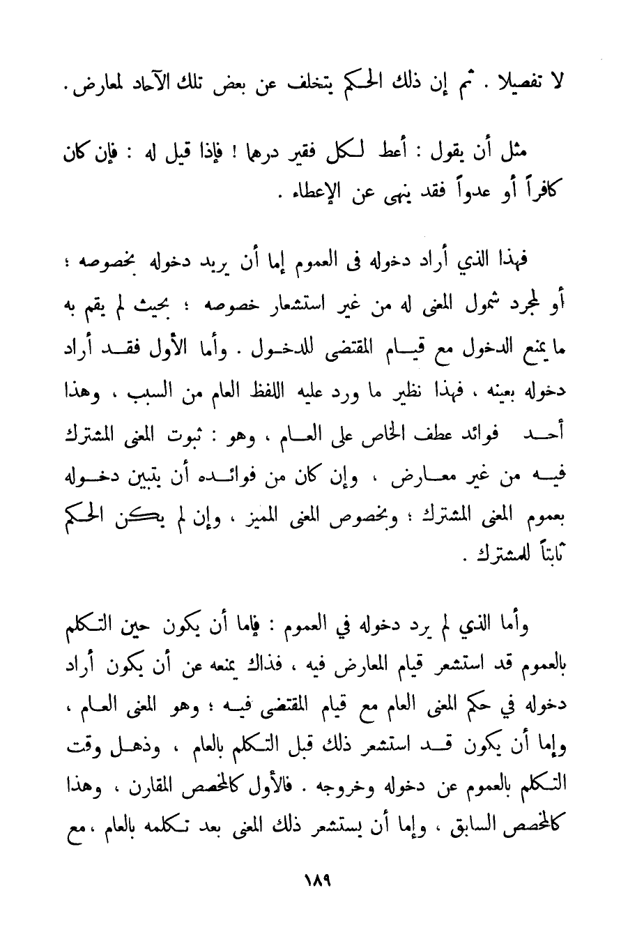 لَا تَفْصِيلًا ثُمَّ إنَّ ذَلِكَ الْحُكْمَ يَتَخَلَّفُ عَنْ بَعْضِ تِلْكَ الْآحَادِ لِمُعَارِضِ. مِثْلَ أَنْ يَقُولَ: أَعْطِ لِكُلِّ فَقِيرٍ دِرْهَمًا فَإِذَا قِيلَ لَهُ: فَإِنْ كَانَ كَافِرًا أَوْ عَدُوًّا فَقَدَ يُنْهَى عَنْ الْإِعْطَاءِ. فَهَذَا الَّذِي أَرَادَ دُخُولَهُ فِي الْعُمُومِ إمَّا أَنْ يُرِيدَ دُخُولَهُ بِخُصُوصِهِ؛ أَوْ لِمُجَرَّدِ شُمُولِ الْمَعْنَى لَهُ مِنْ غَيْرِ اسْتِشْعَارِ خُصُوصِهِ؛ بِحَيْثُ لَمْ يَقُمْ بِهِ مَا يَمْنَعُ الدُّخُولَ مَعَ قِيَامِ الْمُقْتَضِي لِلدُّخُولِ. وَأَمَّا الْأَوَّلُ فَقَدْ أَرَادَ دُخُولَهُ بِعَيْنِهِ فَهَذَا نَظِيرُ مَا وَرَدَ عَلَيْهِ اللَّفْظُ الْعَامُّ مِنْ السَّبَبِ وَهَذَا إحْدَى فَوَائِدِ عَطْفِ الْخَاصِّ عَلَى الْعَامِّ وَهُوَ: ثُبُوتُ الْمَعْنَى الْمُشْتَرَكِ فِيهِ مِنْ غَيْرِ مُعَارِضٍ وَإِنْ كَانَ مِنْ فَوَائِدِهِ أَنْ يَتَبَيَّنَ دُخُولُهُ بِعُمُومِ الْمَعْنَى الْمُشْتَرَكِ: وَبِخُصُوصِ الْمَعْنَى الْمُمَيِّزِ وَإِنْ لَمْ يَكُنْ الْحُكْمُ ثَابِتًا لِلْمُشْتَرَكِ. وَأَمَّا الَّذِي لَمْ يُرِدْ دُخُولَهُ فِي الْعُمُومِ: فَإِمَّا أَنْ يَكُونَ حِينَ التَّكَلُّمِ بِالْعُمُومِ قَدْ اسْتَشْعَرَ قِيَامَ الْمُعَارِضِ فِيهِ فَذَاكَ يَمْنَعُهُ عَنْ أَنْ يَكُونَ أَرَادَ دُخُولَهُ فِي حُكْمِ الْمَعْنَى الْعَامِّ مَعَ قِيَامِ الْمُقْتَضِي فِيهِ؛ وَهُوَ الْمَعْنَى الْعَامُّ وَإِمَّا أَنْ يَكُونَ قَدْ اسْتَشْعَرَ ذَلِكَ قَبْلَ التَّكَلُّمِ بِالْعَامِّ وَذُهِلَ وَقْتَ التَّكَلُّمِ بِالْعُمُومِ عَنْ دُخُولِهِ وَخُرُوجِهِ. فَالْأَوَّلُ كَالْمُخَصَّصِ الْمُقَارِنِ وَهَذَا كَالْمُخَصَّصِ السَّابِقِ وَإِمَّا أَنْ يَسْتَشْعِرَ ذَلِكَ الْمَعْنَى بَعْدَ تَكَلُّمِهِ بِالْعَامِّ مَعَ