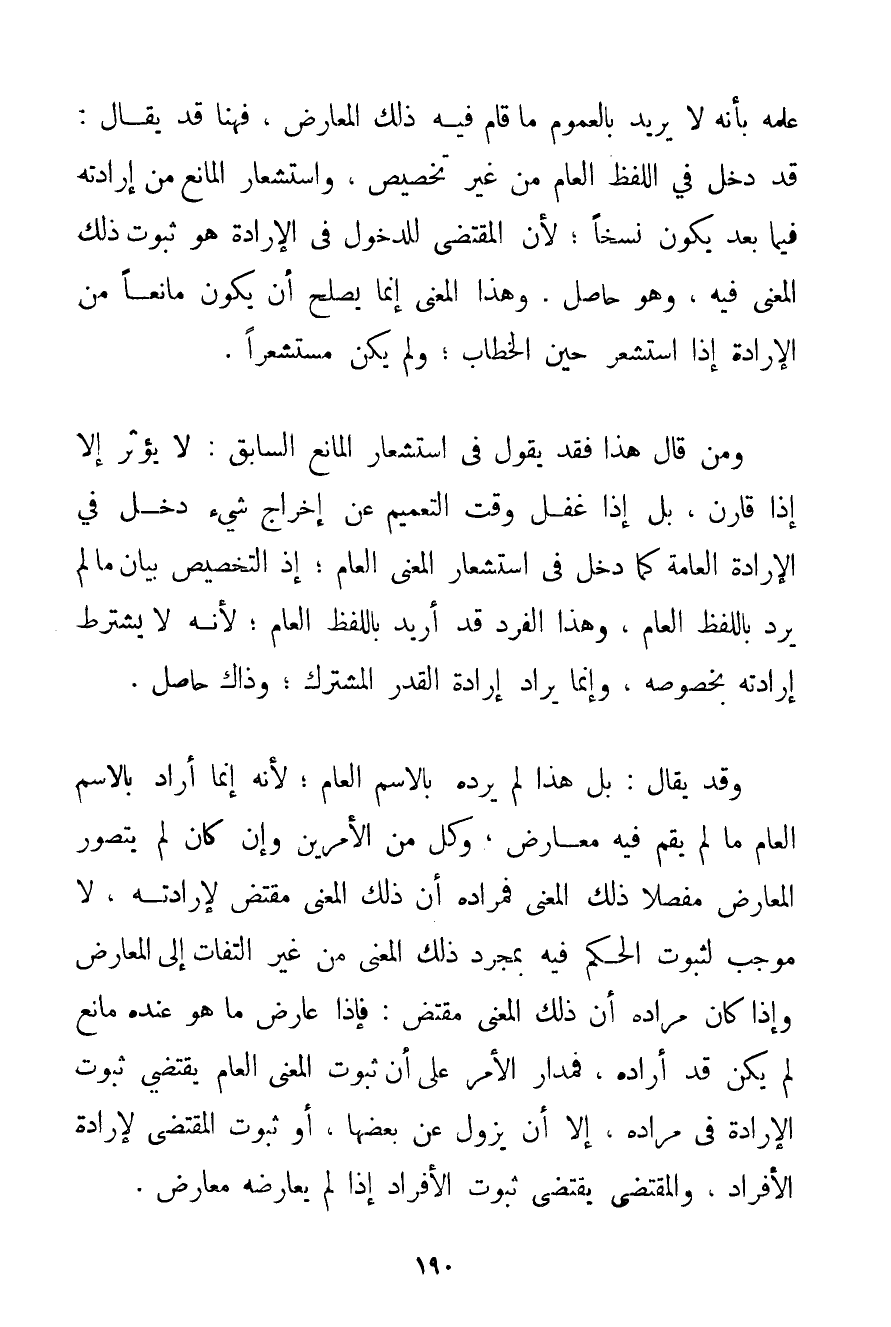 عِلْمِهِ بِأَنَّهُ لَا يُرِيدُ بِالْعُمُومِ مَا قَامَ فِيهِ ذَلِكَ الْمُعَارِضُ فَهُنَا قَدْ يُقَالُ: قَدْ دَخَلَ فِي اللَّفْظِ الْعَامِّ مِنْ غَيْرِ تَخْصِيصٍ وَاسْتِشْعَارِ الْمَانِعِ مِنْ إرَادَتِهِ فِيمَا بَعْدُ يَكُونُ نَسْخًا؛ لِأَنَّ الْمُقْتَضِيَ لِلدُّخُولِ فِي الْإِرَادَةِ هُوَ ثُبُوتُ ذَلِكَ الْمَعْنَى فِيهِ وَهُوَ حَاصِلٌ. وَهَذَا الْمَعْنَى إنَّمَا يَصْلُحُ أَنْ يَكُونَ مَانِعًا مِنْ الْإِرَادَةِ إذَا اسْتَشْعَرَ حِينَ الْخِطَابِ؛ وَلَمْ يَكُنْ مُسْتَشْعِرًا. وَمَنْ قَالَ هَذَا فَقَدْ يَقُولُ فِي اسْتِشْعَارِ الْمَانِعِ السَّابِقِ: لَا يُؤَثِّرُ إلَّا إذَا قَارَنَ بَلْ إذَا غَفَلَ وَقْتَ التَّعْمِيمِ عَنْ إخْرَاجِ شَيْءٍ دَخَلَ فِي الْإِرَادَةِ الْعَامَّةِ كَمَا دَخَلَ فِي اسْتِشْعَارِ الْمَعْنَى الْعَامِّ؛ إذْ التَّخْصِيصُ بَيَانُ مَا لَمْ يُرِدْ بِاللَّفْظِ الْعَامِّ وَهَذَا الْفَرْدُ قَدْ أُرِيدَ بِاللَّفْظِ الْعَامِّ؛ لِأَنَّهُ لَا يُشْتَرَطُ إرَادَتُهُ بِخُصُوصِهِ وَإِنَّمَا يُرَادُ إرَادَةُ الْقَدْرِ الْمُشْتَرَكِ؛ وَذَاكَ حَاصِلٌ. وَقَدْ يُقَالُ: بَلْ هَذَا لَمْ يُرِدْهُ بِالِاسْمِ الْعَامِّ؛ لِأَنَّهُ إنَّمَا أَرَادَ بِالِاسْمِ الْعَامِّ مَا لَمْ يَقُمْ فِيهِ مُعَارِضٌ وَكُلٌّ مِنْ الْأَمْرَيْنِ وَإِنْ كَانَ لَمْ يُتَصَوَّرْ الْمُعَارِضُ مُفَصَّلًا ذَلِكَ الْمَعْنَى فَمُرَادُهُ أَنَّ ذَلِكَ الْمَعْنَى مُقْتَضٍ لِإِرَادَتِهِ لَا مُوجَبَ لِثُبُوتِ الْحُكْمِ فِيهِ بِمُجَرَّدِ ذَلِكَ الْمَعْنَى مِنْ غَيْرِ الْتِفَاتٍ إلَى الْمَعَارِضِ وَإِذَا كَانَ مُرَادُهُ أَنَّ ذَلِكَ الْمَعْنَى مُقْتَضٍ: فَإِذَا عَارَضَ مَا هُوَ عِنْدَهُ مَانِعٌ لَمْ يَكُنْ قَدْ أَرَادَهُ فَمَدَارُ الْأَمْرِ عَلَى أَنَّ ثُبُوتَ الْمَعْنَى الْعَامِّ يَقْتَضِي ثُبُوتَ الْإِرَادَةِ فِي مُرَادِهِ إلَّا أَنْ يَزُولَ عَنْ بَعْضِهَا أَوْ ثُبُوتَ الْمُقْتَضِي لِإِرَادَةِ الْأَفْرَادِ وَالْمُقْتَضِي يَقْتَضِي ثُبُوتَ الْأَفْرَادِ إذَا لَمْ يُعَارِضْهُ مُعَارِضٌ.
