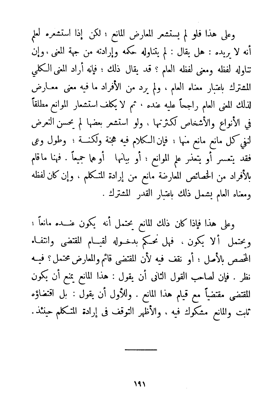 وَعَلَى هَذَا فَلَوْ لَمْ يَسْتَشْعِرْ الْمُعَارِضُ الْمَانِعَ؛ لَكِنْ إذَا اسْتَشْعَرَهُ لَعَلِمَ أَنَّهُ لَا يُرِيدُهُ: هَلْ يُقَالُ: لَمْ يَتَنَاوَلْهُ حُكْمُهُ وَإِرَادَتُهُ مِنْ جِهَةِ الْمَعْنَى وَإِنْ تَنَاوَلَهُ لَفْظُهُ وَمَعْنَى لَفْظِهِ الْعَامُّ؟ قَدْ يُقَالُ ذَلِكَ؛ فَإِنَّهُ أَرَادَ الْمَعْنَى الْكُلِّيَّ الْمُشْتَرَكَ بِاعْتِبَارِ مَعْنَاهُ الْعَامِّ وَلَمْ يُرِدْ مِنْ الْأَفْرَادِ مَا فِيهِ مَعْنًى مُعَارِضٌ لِذَلِكَ الْمَعْنَى الْعَامِّ رَاجِحًا عَلَيْهِ عِنْدَهُ ثُمَّ لَا يُكَلَّفُ اسْتِشْعَارَ الْمَوَانِعِ مُطْلَقًا فِي الْأَنْوَاعِ وَالْأَشْخَاصِ لِكَثْرَتِهَا وَلَوْ اسْتَشْعَرَ بَعْضَهَا لَمْ يَحْسُنْ التَّعَرُّضُ؛ لِنَفْيِ كُلِّ مَانِعٍ مَانِعٍ مِنْهَا؛ فَإِنَّ الْكَلَامَ فِيهِ هُجْنَةٌ وَلُكْنَةٌ؛ وَطُولٌ، وَعَيٌّ فَقَدْ يَتَعَسَّرُ أَوْ يَتَعَذَّرُ عِلْمُ الْمَوَانِعِ؛ أَوْ بَيَانُهَا؛ أَوْ هُمَا جَمِيعًا. فَهُنَا مَا قَامَ بِالْأَفْرَادِ مِنْ الْخَصَائِصِ الْمُعَارِضَةِ مَانِعٌ مِنْ إرَادَةِ الْمُتَكَلِّمِ وَإِنْ كَانَ لَفْظُهُ وَمَعْنَاهُ الْعَامُّ يَشْمَلُ ذَلِكَ بِاعْتِبَارِ الْقَدْرِ الْمُشْتَرَكِ. وَعَلَى هَذَا فَإِذَا كَانَ ذَلِكَ الْمَانِعُ يُحْتَمَلُ أَنَّهُ يَكُونُ عِنْدَهُ مَانِعًا؛ وَيُحْتَمَلُ أَلَّا يَكُونَ فَهَلْ نَحْكُمُ بِدُخُولِهِ لِقِيَامِ الْمُقْتَضِي وَانْتِفَاءِ الْمُخَصِّصِ بِالْأَصْلِ؛ أَوْ نَقِفُ فِيهِ لِأَنَّ الْمُقْتَضِي قَائِمٌ وَالْمُعَارِضُ مُحْتَمَلٌ؟ فِيهِ نَظَرٌ. فَإِنَّ لِصَاحِبِ الْقَوْلِ الثَّانِي أَنْ يَقُولَ: هَذَا الْمَانِعُ يَمْنَعُ أَنْ يَكُونَ الْمُقْتَضِي مُقْتَضِيًا مَعَ قِيَامِ هَذَا الْمَانِعِ. وَلِلْأَوَّلِ أَنْ يَقُولَ: بَلْ اقْتِضَاؤُهُ ثَابِتٌ وَالْمَانِعُ مَشْكُوكٌ فِيهِ وَالْأَظْهَرُ التَّوَقُّفُ فِي إرَادَةِ الْمُتَكَلِّمِ حِينَئِذٍ.