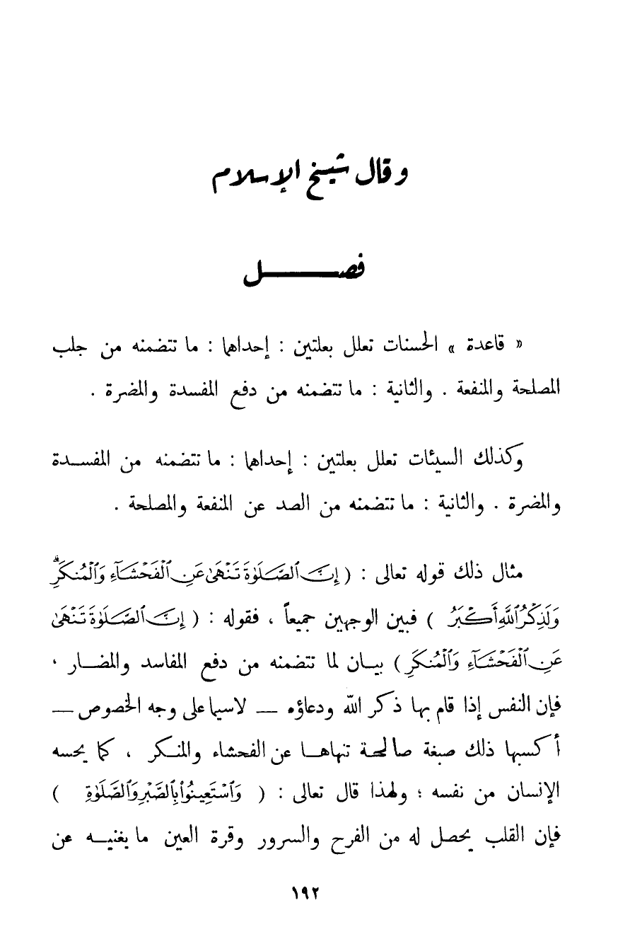 " قَاعِدَةٌ " الْحَسَنَاتُ تُعَلَّلُ بِعِلَّتَيْنِ: إحْدَاهُمَا: مَا تَتَضَمَّنُهُ مِنْ جَلْبِ الْمَصْلَحَةِ وَالْمَنْفَعَةِ. وَالثَّانِيَةُ: مَا تَتَضَمَّنُهُ مِنْ دَفْعِ الْمَفْسَدَةِ وَالْمَضَرَّةِ. وَكَذَلِكَ السَّيِّئَاتُ تُعَلَّلُ بِعِلَّتَيْنِ: إحْدَاهُمَا: مَا تَتَضَمَّنُهُ مِنْ الْمَفْسَدَةِ وَالْمَضَرَّةِ. وَالثَّانِيَةُ: مَا تَتَضَمَّنُهُ مِنْ الصَّدِّ عَنْ الْمَنْفَعَةِ وَالْمَصْلَحَةِ. مِثَالُ ذَلِكَ قَوْله تَعَالَى {إنَّ الصَّلَاةَ تَنْهَى عَنِ الْفَحْشَاءِ وَالْمُنْكَرِ وَلَذِكْرُ اللَّهِ أَكْبَرُ} فَبَيَّنَ الْوَجْهَيْنِ جَمِيعًا فَقَوْلُهُ: {إنَّ الصَّلَاةَ تَنْهَى عَنِ الْفَحْشَاءِ وَالْمُنْكَرِ} بَيَانٌ لِمَا تَتَضَمَّنُهُ مِنْ دَفْعِ الْمَفَاسِدِ وَالْمَضَارِّ فَإِنَّ النَّفْسَ إذَا قَامَ بِهَا ذِكْرُ اللَّهِ وَدُعَاؤُهُ - لَا سِيَّمَا عَلَى وَجْهِ الْخُصُوصِ - أَكْسَبَهَا ذَلِكَ صِبْغَةً صَالِحَةً تَنْهَاهَا عَنْ الْفَحْشَاءِ وَالْمُنْكَرِ كَمَا يُحِسُّهُ الْإِنْسَانُ مِنْ نَفْسِهِ؛ وَلِهَذَا قَالَ تَعَالَى: {وَاسْتَعِينُوا بِالصَّبْرِ وَالصَّلَاةِ} فَإِنَّ الْقَلْبَ يَحْصُلُ لَهُ مِنْ الْفَرَحِ وَالسُّرُورِ وَقُرَّةِ الْعَيْنِ مَا يُغْنِيهِ عَنْ