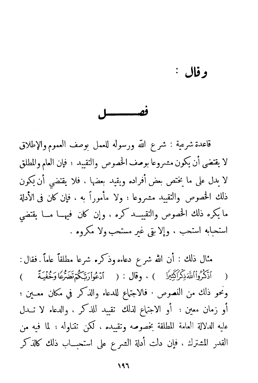 " قَاعِدَةٌ شَرْعِيَّةٌ ": شَرْعُ اللَّهِ وَرَسُولِهِ لِلْعَمَلِ بِوَصْفِ الْعُمُومِ وَالْإِطْلَاقِ لَا يَقْتَضِي أَنْ يَكُونَ مَشْرُوعًا بِوَصْفِ الْخُصُوصِ وَالتَّقْيِيدِ؛ فَإِنَّ الْعَامَّ وَالْمُطْلَقَ لَا يَدُلُّ عَلَى مَا يَخْتَصُّ بَعْضُ أَفْرَادِهِ وَيُقَيِّدُ بَعْضَهَا فَلَا يَقْتَضِي أَنْ يَكُونَ ذَلِكَ الْخُصُوصُ وَالتَّقْيِيدُ مَشْرُوعًا؛ وَلَا مَأْمُورًا بِهِ فَإِنْ كَانَ فِي الْأَدِلَّةِ مَا يَكْرَهُ ذَلِكَ الْخُصُوصَ وَالتَّقْيِيدَ كُرِهَ وَإِنْ كَانَ فِيهَا مَا يَقْتَضِي اسْتِحْبَابَهُ اُسْتُحِبَّ وَإِلَّا بَقِيَ غَيْرَ مُسْتَحَبٍّ وَلَا مَكْرُوهٍ. مِثَالُ ذَلِكَ: أَنَّ اللَّهَ شَرَعَ دُعَاءَهُ وَذِكْرَهُ شَرْعًا مُطْلَقًا عَامًّا. فَقَالَ: {اذْكُرُوا اللَّهَ ذِكْرًا كَثِيرًا} وَقَالَ: {ادْعُوا رَبَّكُمْ تَضَرُّعًا وَخُفْيَةً} وَنَحْوَ ذَلِكَ مِنْ النُّصُوصِ فَالِاجْتِمَاعُ لِلدُّعَاءِ وَالذِّكْرِ فِي مَكَانٍ مُعَيَّنٍ؛ أَوْ زَمَانٍ مُعَيَّنٍ؛ أَوْ الِاجْتِمَاعِ لِذَلِكَ: تَقْيِيدٌ لِلذِّكْرِ وَالدُّعَاءِ لَا تَدُلُّ عَلَيْهِ الدَّلَالَةُ الْعَامَّةُ الْمُطْلَقَةُ بِخُصُوصِهِ وَتَقْيِيدِهِ لَكِنْ تَتَنَاوَلُهُ؛ لِمَا فِيهِ مِنْ الْقَدْرِ الْمُشْتَرَكِ فَإِنْ دَلَّتْ أَدِلَّةُ الشَّرْعِ عَلَى اسْتِحْبَابِ ذَلِكَ كَالذِّكْرِ