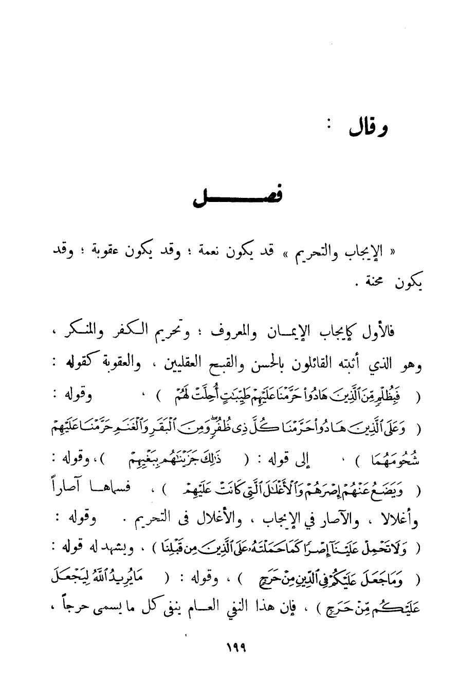 " الْإِيجَابُ وَالتَّحْرِيمُ " قَدْ يَكُونُ نِعْمَةً؛ وَقَدْ يَكُونُ عُقُوبَةً؛ وَقَدْ يَكُونُ مِحْنَةً. فَالْأَوَّلُ كَإِيجَابِ الْإِيمَانِ وَالْمَعْرُوفِ؛ وَتَحْرِيمِ الْكُفْرِ وَالْمُنْكَرِ وَهُوَ الَّذِي أَثْبَتَهُ الْقَائِلُونَ بِالْحُسْنِ وَالْقُبْحِ الْعَقْلِيَّيْنِ وَالْعُقُوبَةِ كَقَوْلِهِ: {فَبِظُلْمٍ مِنَ الَّذِينَ هَادُوا حَرَّمْنَا عَلَيْهِمْ طَيِّبَاتٍ أُحِلَّتْ لَهُمْ} وَقَوْلِهِ: {وَعَلَى الَّذِينَ هَادُوا حَرَّمْنَا كُلَّ ذِي ظُفُرٍ وَمِنَ الْبَقَرِ وَالْغَنَمِ حَرَّمْنَا عَلَيْهِمْ شُحُومَهُمَا} إلَى قَوْلِهِ: {ذَلِكَ جَزَيْنَاهُمْ بِبَغْيِهِمْ} وَقَوْلِهِ: {وَيَضَعُ عَنْهُمْ إصْرَهُمْ وَالْأَغْلَالَ الَّتِي كَانَتْ عَلَيْهِمْ} فَسَمَّاهَا آصَارًا وَأَغْلَالًا وَالْآصَارُ فِي الْإِيجَابِ وَالْأَغْلَالُ فِي التَّحْرِيمِ. وَقَوْلِهِ: {وَلَا تَحْمِلْ عَلَيْنَا إصْرًا كَمَا حَمَلْتَهُ عَلَى الَّذِينَ مِنْ قَبْلِنَا} وَيَشْهَدُ لَهُ قَوْلُهُ: {وَمَا جَعَلَ عَلَيْكُمْ فِي الدِّينِ مِنْ حَرَجٍ} وَقَوْلُهُ: {مَا يُرِيدُ اللَّهُ لِيَجْعَلَ عَلَيْكُمْ مِنْ حَرَجٍ} فَإِنَّ هَذَا النَّفْيَ الْعَامَّ يَنْفِي كُلَّ مَا يُسَمَّى حَرَجًا،