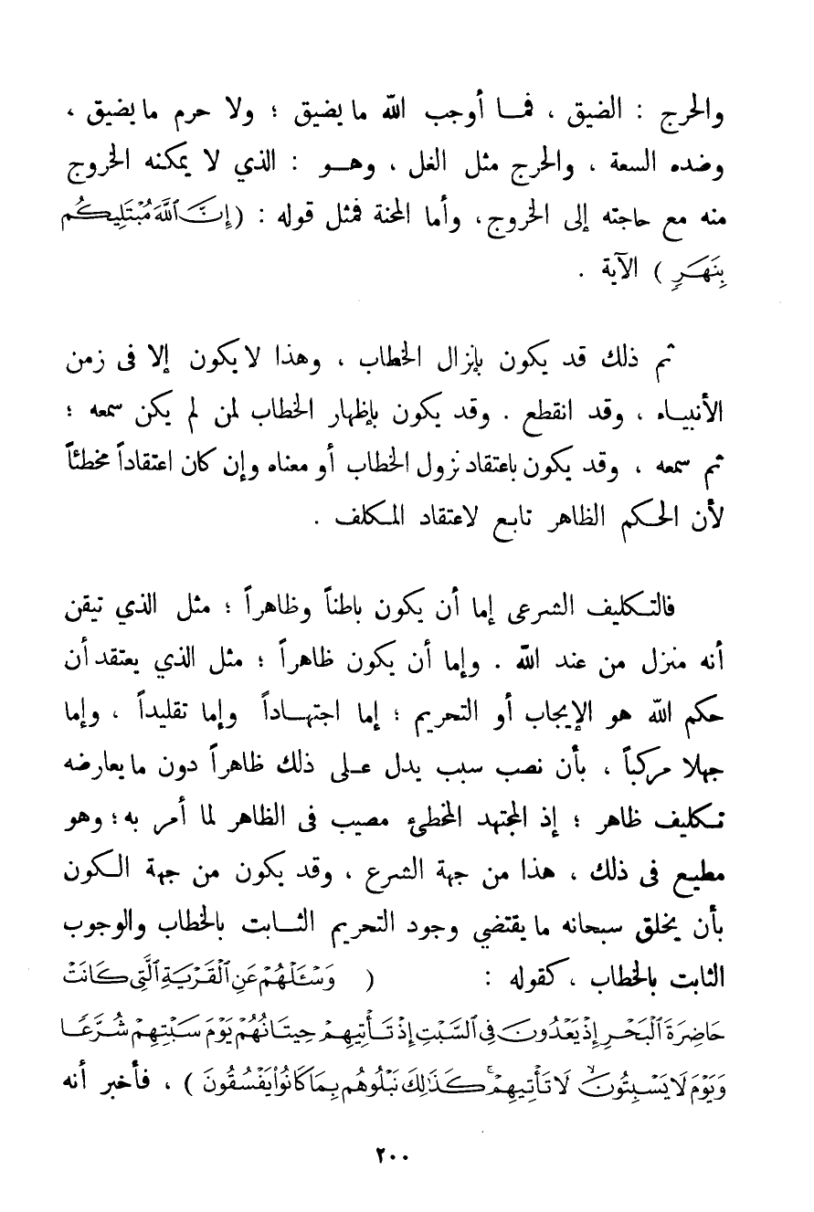 وَالْحَرَجُ: الضِّيقُ فَمَا أَوْجَبَ اللَّهُ مَا يَضِيقُ؛ وَلَا حَرَّمَ مَا يَضِيقُ وَضِدَّهُ السِّعَةُ وَالْحَرَجُ مِثْلُ الْغَلِّ وَهُوَ: الَّذِي لَا يُمْكِنُهُ الْخُرُوجُ مِنْهُ مَعَ حَاجَتِهِ إلَى الْخُرُوجِ وَأَمَّا الْمِحْنَةُ فَمِثْلُ قَوْلِهِ: {إنَّ اللَّهَ مُبْتَلِيكُمْ بِنَهَرٍ} الْآيَةَ. ثُمَّ ذَلِكَ قَدْ يَكُونُ بِإِنْزَالِ الْخِطَابِ وَهَذَا لَا يَكُونُ إلَّا فِي زَمَنِ الْأَنْبِيَاءِ وَقَدْ انْقَطَعَ. وَقَدْ يَكُونُ بِإِظْهَارِ الْخِطَابِ لِمَنْ لَمْ يَكُنْ سَمِعَهُ؛ ثُمَّ سَمِعَهُ وَقَدْ يَكُونُ بِاعْتِقَادِ نُزُولِ الْخِطَابِ أَوْ مَعْنَاهُ وَإِنْ كَانَ اعْتِقَادًا مُخْطِئًا لِأَنَّ الْحُكْمَ الظَّاهِرَ تَابِعٌ لِاعْتِقَادِ الْمُكَلَّفِ. فَالتَّكْلِيفُ الشَّرْعِيُّ إمَّا أَنْ يَكُونَ بَاطِنًا وَظَاهِرًا؛ مِثْلَ الَّذِي تَيَقَّنَ أَنَّهُ مُنْزَلٌ مِنْ عِنْدِ اللَّهِ. وَإِمَّا أَنْ يَكُونَ ظَاهِرًا؛ مِثْلَ الَّذِي يَعْتَقِدُ أَنَّ حُكْمَ اللَّهِ هُوَ الْإِيجَابُ أَوْ التَّحْرِيمُ؛ إمَّا اجْتِهَادًا وَإِمَّا تَقْلِيدًا وَإِمَّا جَهْلًا مُرَكَّبًا بِأَنْ نُصِبَ سَبَبٌ يَدُلُّ عَلَى ذَلِكَ ظَاهِرًا دُونَ مَا يُعَارِضُهُ تَكْلِيفٌ ظَاهِرٌ؛ إذْ الْمُجْتَهِدُ الْمُخْطِئُ مُصِيبٌ فِي الظَّاهِرِ لِمَا أُمِرَ بِهِ؛ وَهُوَ مُطِيعٌ فِي ذَلِكَ هَذَا مِنْ جِهَةِ الشَّرْعِ وَقَدْ يَكُونُ مِنْ جِهَةِ الْكَوْنِ بِأَنْ يَخْلُقَ سُبْحَانَهُ مَا يَقْتَضِي وُجُودَ التَّحْرِيمِ الثَّابِتِ بِالْخِطَابِ وَالْوُجُوبِ الثَّابِتِ بِالْخِطَابِ كَقَوْلِهِ: {وَاسْأَلْهُمْ عَنِ الْقَرْيَةِ الَّتِي كَانَتْ حَاضِرَةَ الْبَحْرِ إذْ يَعْدُونَ فِي السَّبْتِ إذْ تَأْتِيهِمْ حِيتَانُهُمْ يَوْمَ سَبْتِهِمْ شُرَّعًا وَيَوْمَ لَا يَسْبِتُونَ لَا تَأْتِيهِمْ كَذَلِكَ نَبْلُوهُمْ بِمَا كَانُوا يَفْسُقُونَ} فَأَخْبَرَ أَنَّهُ