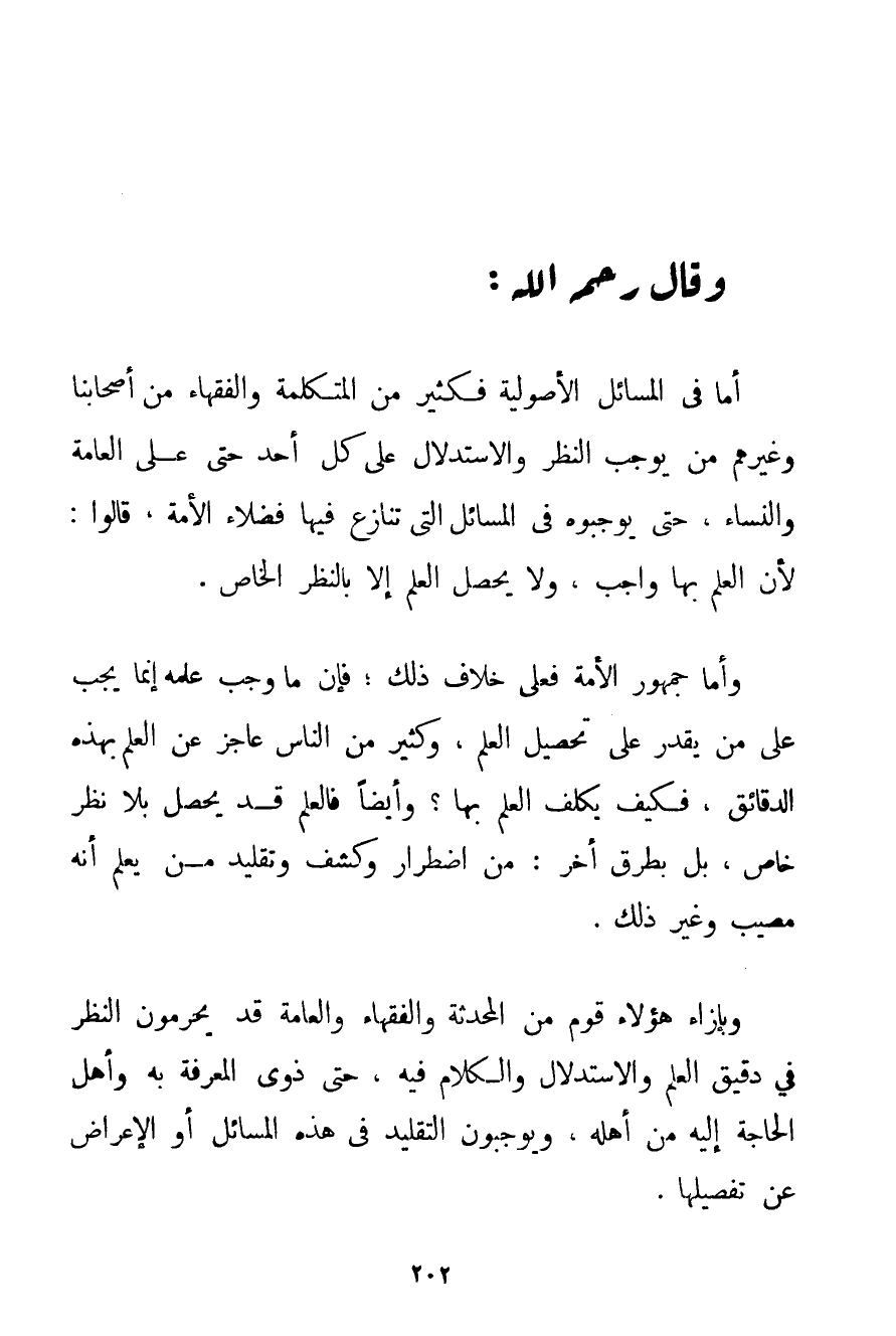 أَمَّا فِي الْمَسَائِلِ الْأُصُولِيَّةِ فَكَثِيرٌ مِنْ الْمُتَكَلِّمَةِ وَالْفُقَهَاءِ مِنْ أَصْحَابِنَا وَغَيْرِهِمْ مَنْ يُوجِبُ النَّظَرَ وَالِاسْتِدْلَالَ عَلَى كُلِّ أَحَدٍ حَتَّى عَلَى الْعَامَّةِ وَالنِّسَاءِ حَتَّى يُوجِبُوهُ فِي الْمَسَائِلِ الَّتِي تَنَازَعَ فِيهَا فُضَلَاءُ الْأُمَّةِ قَالُوا: لِأَنَّ الْعِلْمَ بِهَا وَاجِبٌ وَلَا يَحْصُلُ الْعِلْمُ إلَّا بِالنَّظَرِ الْخَاصِّ. وَأَمَّا جُمْهُورُ الْأُمَّةِ فَعَلَى خِلَافِ ذَلِكَ؛ فَإِنَّ مَا وَجَبَ عِلْمُهُ إنَّمَا يَجِبُ عَلَى مَنْ يَقْدِرُ عَلَى تَحْصِيلِ الْعِلْمِ وَكَثِيرٌ مِنْ النَّاسِ عَاجِزٌ عَنْ الْعِلْمِ بِهَذِهِ الدَّقَائِقِ فَكَيْفَ يُكَلَّفُ الْعِلْمَ بِهَا؟ وَأَيْضًا فَالْعِلْمُ قَدْ يَحْصُلُ بِلَا نَظَرٍ خَاصٍّ بَلْ بِطُرُقِ أُخَرَ: مِنْ اضْطِرَارٍ وَكَشْفٍ وَتَقْلِيدِ مَنْ يَعْلَمُ أَنَّهُ مُصِيبٌ وَغَيْرِ ذَلِكَ.