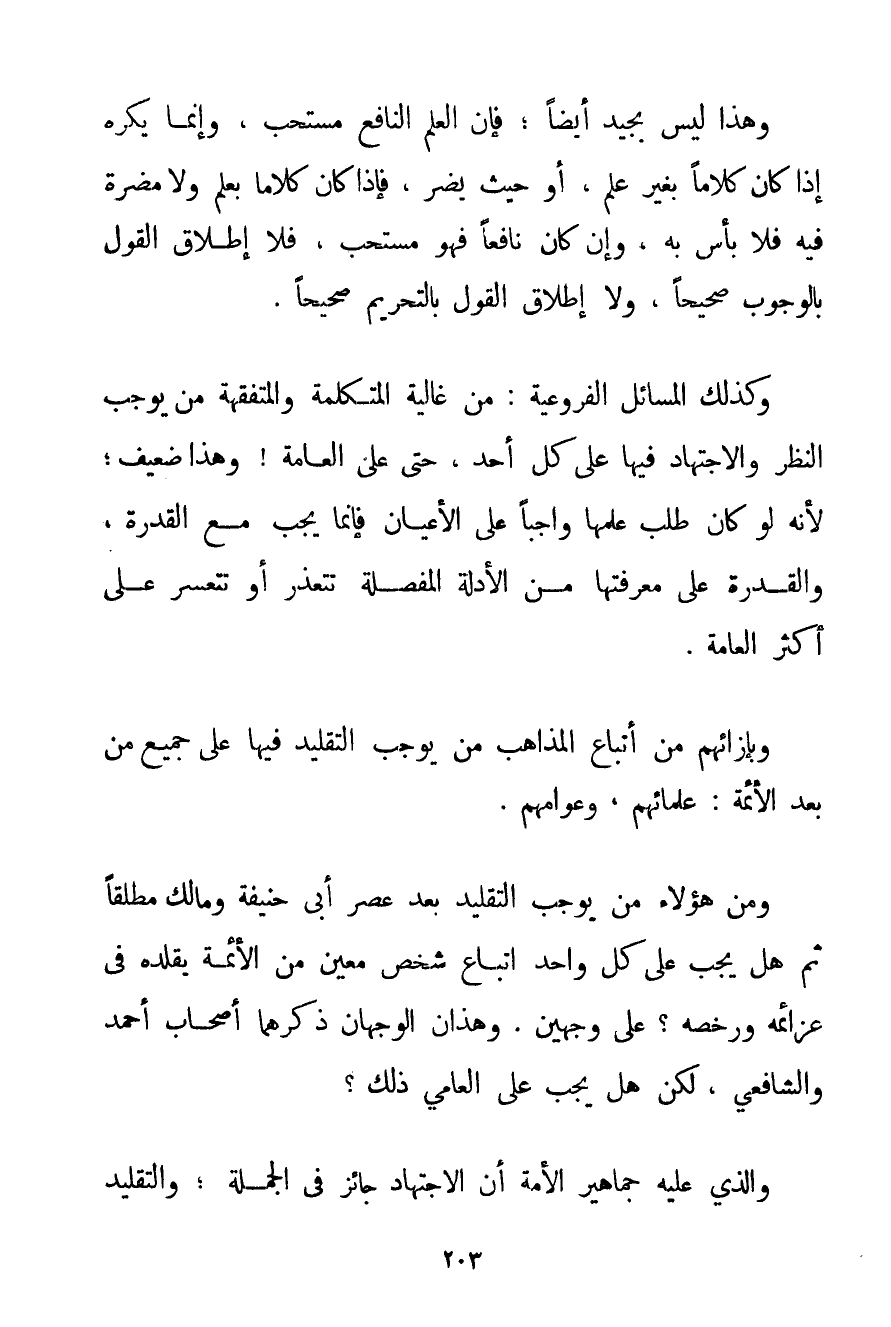 وَهَذَا لَيْسَ بِجَيِّدِ أَيْضًا؛ فَإِنَّ الْعِلْمَ النَّافِعَ مُسْتَحَبٌّ وَإِنَّمَا يُكْرَهُ إذَا كَانَ كَلَامًا بِغَيْرِ عِلْمٍ أَوْ حَيْثُ يَضُرُّ فَإِذَا كَانَ كَلَامًا بِعِلْمِ وَلَا مَضَرَّةَ فِيهِ فَلَا بَأْسَ بِهِ وَإِنْ كَانَ نَافِعًا فَهُوَ مُسْتَحَبٌّ فَلَا إطْلَاقُ الْقَوْلِ بِالْوُجُوبِ صَحِيحًا وَلَا إطْلَاقُ الْقَوْلِ بِالتَّحْرِيمِ صَحِيحًا. وَكَذَلِكَ الْمَسَائِلُ الفروعية: مِنْ غَالِيَةِ الْمُتَكَلِّمَةِ وَالْمُتَفَقِّهَةِ مَنْ يُوجِبُ النَّظَرَ وَالِاجْتِهَادَ فِيهَا عَلَى كُلِّ أَحَدٍ حَتَّى عَلَى الْعَامَّةِ وَهَذَا ضَعِيفٌ؛ لِأَنَّهُ لَوْ كَانَ طَلَبُ عِلْمِهَا وَاجِبًا عَلَى الْأَعْيَانِ فَإِنَّمَا يَجِبُ مَعَ الْقُدْرَةِ وَالْقُدْرَةُ عَلَى مَعْرِفَتِهَا مِنْ الْأَدِلَّةِ الْمُفَصَّلَةِ تَتَعَذَّرُ أَوْ تَتَعَسَّرُ عَلَى أَكْثَرِ الْعَامَّةِ. وَبِإِزَائِهِمْ مِنْ أَتْبَاعِ الْمَذَاهِبِ مَنْ يُوجِبُ التَّقْلِيدَ فِيهَا عَلَى جَمِيعِ مَنْ بَعْدَ الْأَئِمَّةِ: عُلَمَائِهِمْ؛ وَعَوَامِّهِمْ. وَمِنْ هَؤُلَاءِ مَنْ يُوجِبُ التَّقْلِيدَ بَعْدَ عَصْرِ أَبِي حَنِيفَةَ وَمَالِكٍ مُطْلَقًا ثُمَّ هَلْ يَجِبُ عَلَى كُلٍّ وَاحِدٍ اتِّبَاعُ شَخْصٍ مُعَيَّنٍ مِنْ الْأَئِمَّةِ يُقَلِّدُهُ فِي عَزَائِمِهِ وَرُخَصِهِ؟ عَلَى وَجْهَيْنِ. وَهَذَانِ الْوَجْهَانِ ذَكَرَهُمَا أَصْحَابُ أَحْمَد وَالشَّافِعِيِّ لَكِنْ هَلْ يَجِبُ عَلَى الْعَامِّيِّ ذَلِكَ؟ وَاَلَّذِي عَلَيْهِ جَمَاهِيرُ الْأُمَّةِ أَنَّ الِاجْتِهَادَ جَائِزٌ فِي الْجُمْلَةِ؛ وَالتَّقْلِيدَ