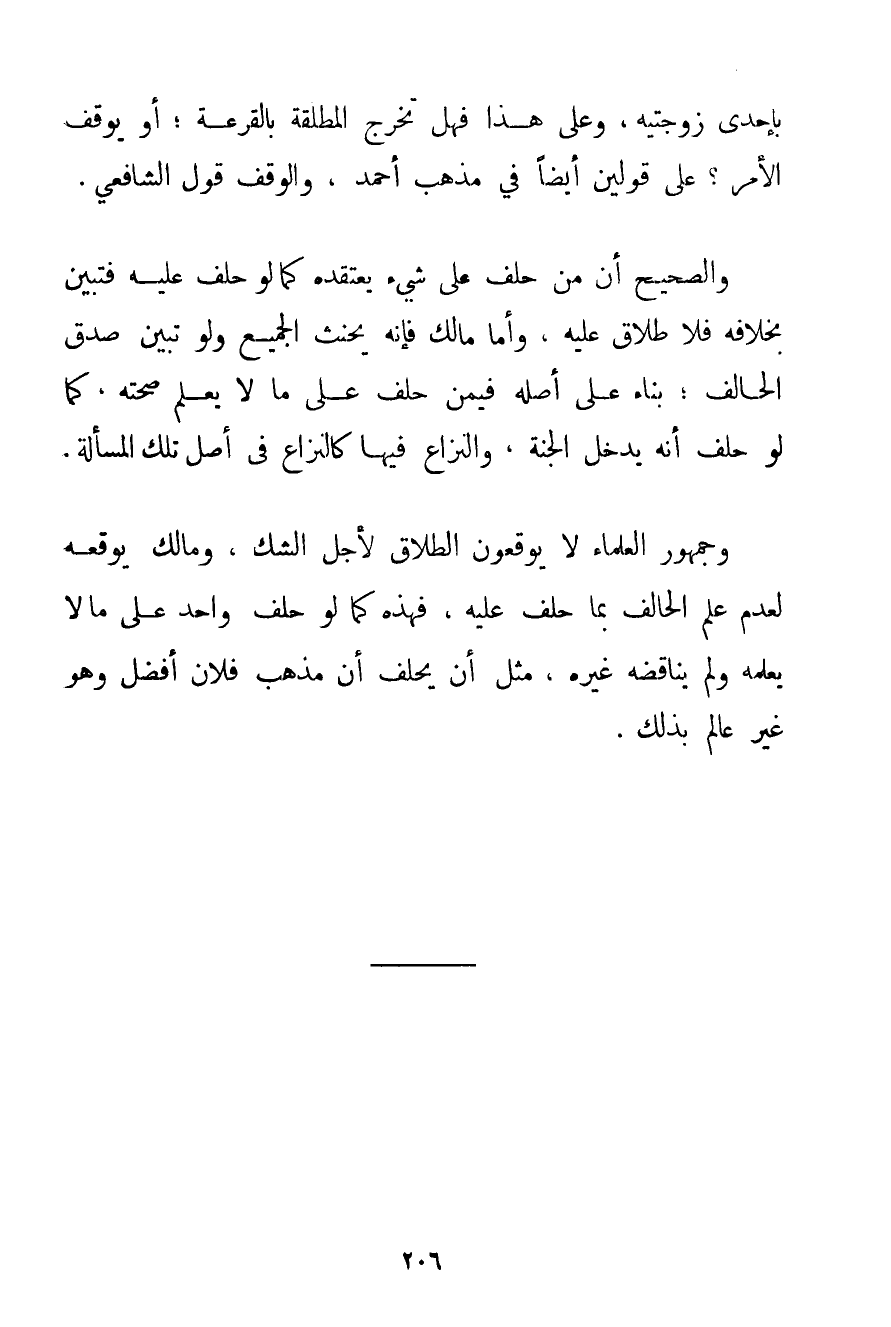 بِإِحْدَى زَوْجَتَيْهِ وَعَلَى هَذَا فَهَلْ تَخْرُجُ الْمُطَلَّقَةُ بِالْقَرْعَةِ؛ أَوْ يُوقَفُ الْأَمْرُ؟ عَلَى قَوْلَيْنِ أَيْضًا فِي مَذْهَبِ أَحْمَد وَالْوَقْفُ قَوْلُ الشَّافِعِيِّ. وَالصَّحِيحُ أَنَّ مَنْ حَلَفَ عَلَى شَيْءٍ يَعْتَقِدُهُ كَمَا لَوْ حَلَفَ عَلَيْهِ فَتَبَيَّنَ بِخِلَافِهِ فَلَا طَلَاقَ عَلَيْهِ وَأَمَّا مَالِكٌ فَإِنَّهُ يُحَنِّثُ الْجَمِيعَ وَلَوْ تَبَيَّنَ صِدْقُ الْحَالِفِ؛ بِنَاءً عَلَى أَصْلِهِ فِيمَنْ حَلَفَ عَلَى مَا لَا يَعْلَمُ صِحَّتَهُ كَمَا لَوْ حَلَفَ أَنَّهُ يَدْخُلُ الْجَنَّةَ وَالنِّزَاعُ فِيهَا كَالنِّزَاعِ فِي أَصْلِ تِلْكَ الْمَسْأَلَةِ. وَجُمْهُورُ الْعُلَمَاءِ لَا يُوقِعُونَ الطَّلَاقَ لِأَجْلِ الشَّكِّ وَمَالِكٌ يُوقِعُهُ لِعَدَمِ عِلْمِ الْحَالِفِ بِمَا حَلَفَ عَلَيْهِ فَهَذِهِ كَمَا لَوْ حَلَفَ وَاحِدٌ عَلَى مَا لَا يَعْلَمُهُ وَلَمْ يُنَاقِضْهُ غَيْرُهُ مِثْلَ أَنْ يَحْلِفَ أَنَّ مَذْهَبَ فُلَانٍ أَفْضَلُ وَهُوَ غَيْرُ عَالِمٍ بِذَلِكَ.
