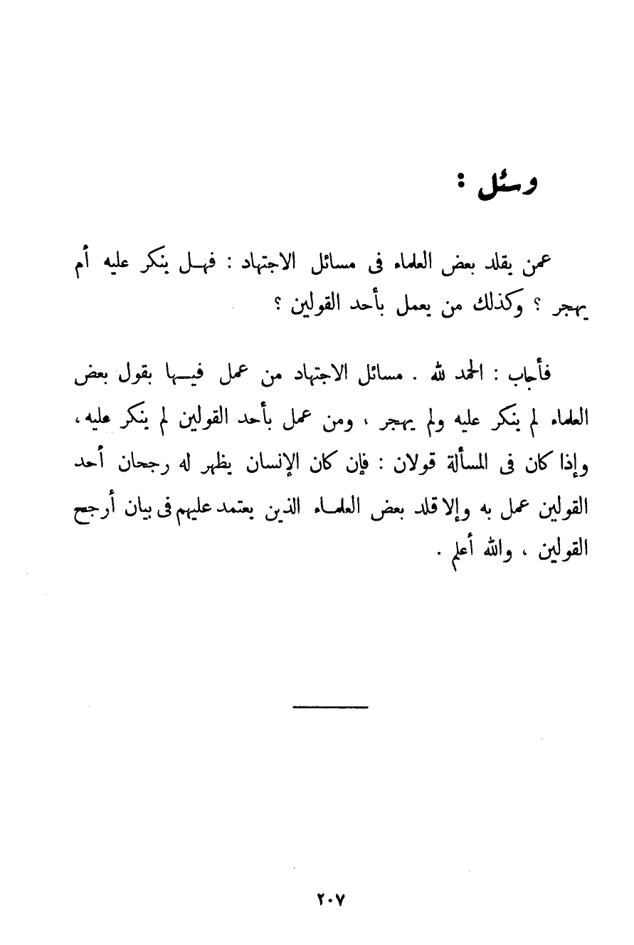 الْحَمْدُ لِلَّهِ، مَسَائِلُ الِاجْتِهَادِ مَنْ عَمِلَ فِيهَا بِقَوْلِ بَعْضِ الْعُلَمَاءِ لَمْ يُنْكَرْ عَلَيْهِ وَلَمْ يُهْجَرْ وَمَنْ عَمِلَ بِأَحَدِ الْقَوْلَيْنِ لَمْ يُنْكَرْ عَلَيْهِ وَإِذَا كَانَ فِي الْمَسْأَلَةِ قَوْلَانِ: فَإِنْ كَانَ الْإِنْسَانُ يَظْهَرُ لَهُ رُجْحَانُ أَحَدِ الْقَوْلَيْنِ عَمِلَ بِهِ وَإِلَّا قَلَّدَ بَعْضَ الْعُلَمَاءِ الَّذِينَ يُعْتَمَدُ عَلَيْهِمْ فِي بَيَانِ أَرْجَحِ الْقَوْلَيْنِ وَاَللَّهُ أَعْلَمُ.