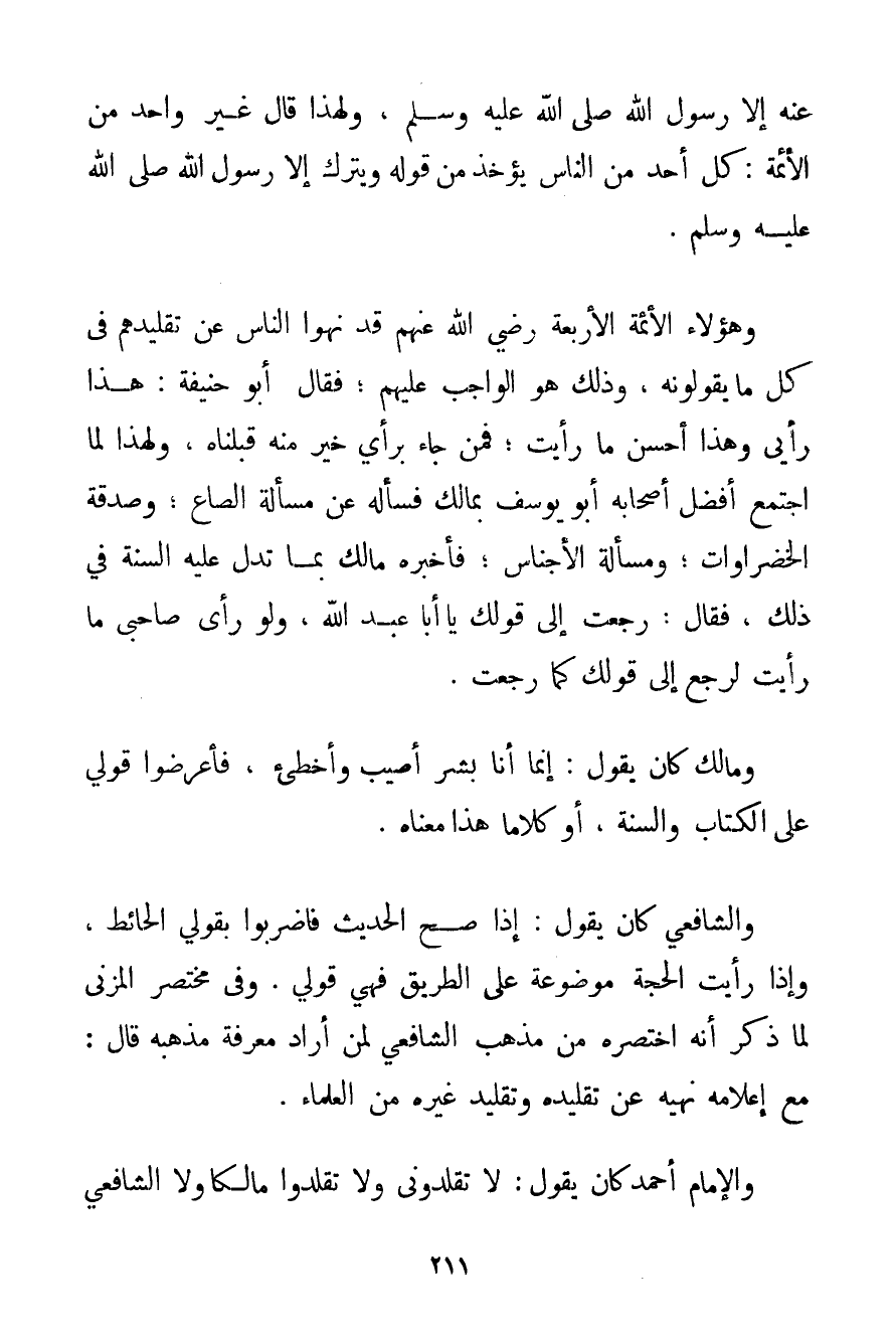 وَهَؤُلَاءِ الْأَئِمَّةُ الْأَرْبَعَةُ رَضِيَ اللَّهُ عَنْهُمْ قَدْ نَهَوْا النَّاسَ عَنْ تَقْلِيدِهِمْ فِي كُلِّ مَا يَقُولُونَهُ وَذَلِكَ هُوَ الْوَاجِبُ عَلَيْهِمْ؛ فَقَالَ أَبُو حَنِيفَةَ: هَذَا رَأْيِي وَهَذَا أَحْسَنُ مَا رَأَيْت؛ فَمَنْ جَاءَ بِرَأْيٍ خَيْرٍ مِنْهُ قَبِلْنَاهُ وَلِهَذَا لَمَّا اجْتَمَعَ أَفْضَلُ أَصْحَابِهِ أَبُو يُوسُفَ بِمَالِكِ فَسَأَلَهُ عَنْ مَسْأَلَةِ الصَّاعِ؛ وَصَدَقَةِ الْخَضْرَاوَاتِ؛ وَمَسْأَلَةِ الْأَجْنَاسِ؛ فَأَخْبَرَهُ مَالِكٌ بِمَا تَدُلُّ عَلَيْهِ السُّنَّةُ فِي ذَلِكَ فَقَالَ: رَجَعْت إلَى قَوْلِك يَا أَبَا عَبْدِ اللَّهِ وَلَوْ رَأَى صَاحِبِي مَا رَأَيْت لَرَجَعَ إلَى قَوْلِك كَمَا رَجَعْت. وَمَالِكٌ كَانَ يَقُولُ: إنَّمَا أَنَا بَشَرٌ أُصِيبُ وَأُخْطِئُ فَاعْرِضُوا قَوْلِي عَلَى الْكِتَابِ وَالسُّنَّةِ أَوْ كَلَامًا هَذَا مَعْنَاهُ. وَالشَّافِعِيُّ كَانَ يَقُولُ: إذَا صَحَّ الْحَدِيثُ فَاضْرِبُوا بِقَوْلِي الْحَائِطَ وَإِذَا رَأَيْت الْحُجَّةَ مَوْضُوعَةً عَلَى الطَّرِيقِ فَهِيَ قَوْلِي. وَفِي مُخْتَصَرِ المزني لَمَّا ذَكَرَ أَنَّهُ اخْتَصَرَهُ مِنْ مَذْهَبِ الشَّافِعِيِّ لِمَنْ أَرَادَ مَعْرِفَةَ مَذْهَبِهِ قَالَ: مَعَ إعْلَامِهِ نَهْيَهُ عَنْ تَقْلِيدِهِ وَتَقْلِيدِ غَيْرِهِ مِنْ الْعُلَمَاءِ. وَالْإِمَامُ أَحْمَد كَانَ يَقُولُ: لَا تُقَلِّدُونِي وَلَا تُقَلِّدُوا مَالِكًا وَلَا الشَّافِعِيَّ