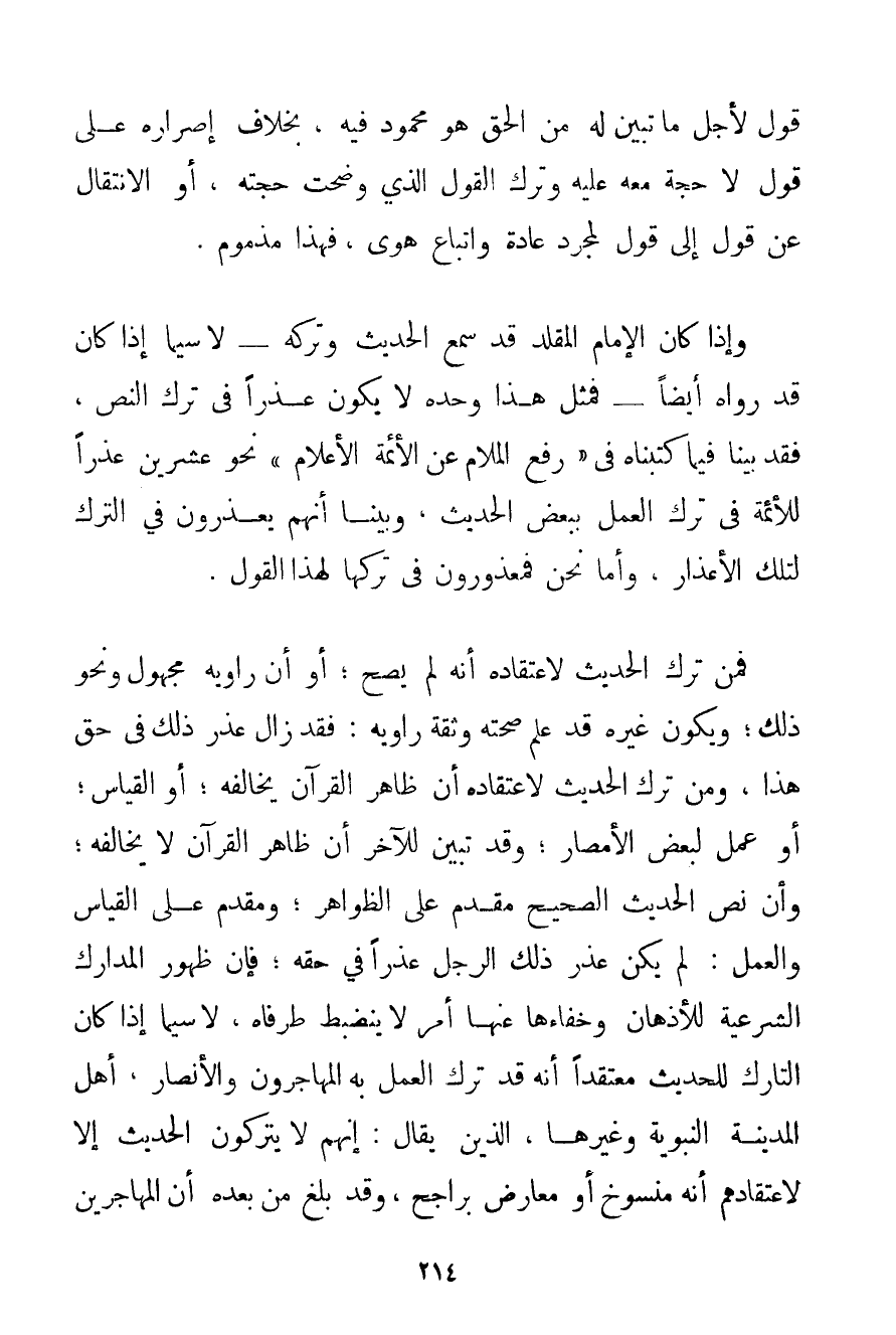 قَوْلٍ لِأَجْلِ مَا تَبَيَّنَ لَهُ مِنْ الْحَقِّ هُوَ مَحْمُودٌ فِيهِ بِخِلَافِ إصْرَارِهِ عَلَى قَوْلٍ لَا حُجَّةَ مَعَهُ عَلَيْهِ وَتَرْكُ الْقَوْلِ الَّذِي وَضَحَتْ حُجَّتُهُ أَوْ الِانْتِقَالُ عَنْ قَوْلٍ إلَى قَوْلٍ لِمُجَرَّدِ عَادَةٍ وَاتِّبَاعِ هَوًى فَهَذَا مَذْمُومٌ. وَإِذَا كَانَ الْإِمَامُ الْمُقَلَّدُ قَدْ سَمِعَ الْحَدِيثَ وَتَرَكَهُ - لَا سِيَّمَا إذَا كَانَ قَدْ رَوَاهُ أَيْضًا - فَمِثْلُ هَذَا وَحْدَهُ لَا يَكُونُ عُذْرًا فِي تَرْكِ النَّصِّ فَقَدْ بَيَّنَّا فِيمَا كَتَبْنَاهُ فِي " رَفْعِ الْمَلَامِ عَنْ الْأَئِمَّةِ الْأَعْلَامِ " نَحْوَ عِشْرِينَ عُذْرًا لِلْأَئِمَّةِ فِي تَرْكِ الْعَمَلِ بِبَعْضِ الْحَدِيثِ وَبَيَّنَّا أَنَّهُمْ يُعْذَرُونَ فِي التَّرْكِ لِتِلْكَ الْأَعْذَارِ وَأَمَّا نَحْنُ فَمَعْذُورُونَ فِي تَرْكِهَا لِهَذَا الْقَوْلِ. فَمَنْ تَرَكَ الْحَدِيثَ لِاعْتِقَادِهِ أَنَّهُ لَمْ يَصِحَّ؛ أَوْ أَنَّ رَاوِيَهُ مَجْهُولٌ وَنَحْوَ ذَلِكَ؛ وَيَكُونُ غَيْرُهُ قَدْ عَلِمَ صِحَّتَهُ وَثِقَةَ رَاوِيهِ: فَقَدْ زَالَ عُذْرُ ذَلِكَ فِي حَقِّ هَذَا وَمَنْ تَرَكَ الْحَدِيثَ لِاعْتِقَادِهِ أَنَّ ظَاهِرَ الْقُرْآنِ يُخَالِفُهُ؛ أَوْ الْقِيَاسِ؛ أَوْ عَمَلٍ لِبَعْضِ الْأَمْصَارِ؛ وَقَدْ تَبَيَّنَ لِلْآخَرِ أَنَّ ظَاهِرَ الْقُرْآنِ لَا يُخَالِفُهُ؛ وَأَنَّ نَصَّ الْحَدِيثِ الصَّحِيحِ مُقَدَّمٌ عَلَى الظَّوَاهِرِ؛ وَمُقَدَّمٌ عَلَى الْقِيَاسِ وَالْعَمَلِ: لَمْ يَكُنْ عُذْرُ ذَلِكَ الرَّجُلِ عُذْرًا فِي حَقِّهِ؛ فَإِنَّ ظُهُورَ الْمَدَارِكِ الشَّرْعِيَّةِ لِلْأَذْهَانِ وَخَفَاءَهَا عَنْهَا أَمْرٌ لَا يَنْضَبِطُ طَرَفَاهُ لَا سِيَّمَا إذَا كَانَ التَّارِكُ لِلْحَدِيثِ مُعْتَقِدًا أَنَّهُ قَدْ تَرَكَ الْعَمَلَ بِهِ الْمُهَاجِرُونَ وَالْأَنْصَارُ أَهْلُ الْمَدِينَةِ النَّبَوِيَّةِ وَغَيْرِهَا الَّذِينَ يُقَالُ: إنَّهُمْ لَا يَتْرُكُونَ الْحَدِيثَ إلَّا لِاعْتِقَادِهِمْ أَنَّهُ مَنْسُوخٌ أَوْ مُعَارَضٌ بِرَاجِحِ وَقَدْ بَلَغَ مَنْ بَعْدَهُ أَنَّ الْمُهَاجِرِينَ