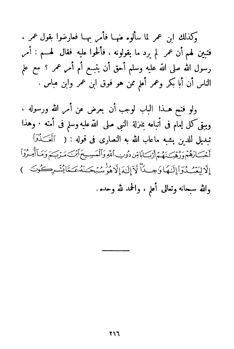 وَكَذَلِكَ ابْنُ عُمَرَ لَمَّا سَأَلُوهُ عَنْهَا فَأَمَرَ بِهَا فَعَارَضُوا بِقَوْلِ عُمَرَ فَتَبَيَّنَ لَهُمْ أَنَّ عُمَرَ لَمْ يَرُدَّ مَا يَقُولُونَهُ فَأَلَحُّوا عَلَيْهِ فَقَالَ لَهُمْ: أَمْرُ رَسُولِ اللَّهِ صَلَّى اللَّهُ عَلَيْهِ وَسَلَّمَ أَحَقُّ أَنْ يُتَّبَعَ أَمْ أَمْرُ عُمَرَ؟ مَعَ عِلْمِ النَّاسِ أَنَّ أَبَا بَكْرٍ وَعُمَرَ أَعْلَمُ مِمَّنْ هُوَ فَوْقَ ابْنِ عُمَرَ وَابْنِ عَبَّاسٍ. وَلَوْ فُتِحَ هَذَا الْبَابُ لَوَجَبَ أَنْ يُعْرِضَ عَنْ أَمْرِ اللَّهِ وَرَسُولِهِ وَيَبْقَى كُلُّ إمَامٍ فِي أَتْبَاعِهِ بِمَنْزِلَةِ النَّبِيِّ صَلَّى اللَّهُ عَلَيْهِ وَسَلَّمَ فِي أُمَّتِهِ وَهَذَا تَبْدِيلٌ لِلدِّينِ يُشْبِهُ مَا عَابَ اللَّهُ بِهِ النَّصَارَى فِي قَوْلِهِ: {اتَّخَذُوا أَحْبَارَهُمْ وَرُهْبَانَهُمْ أَرْبَابًا مِنْ دُونِ اللَّهِ وَالْمَسِيحَ ابْنَ مَرْيَمَ وَمَا أُمِرُوا إلَّا لِيَعْبُدُوا إلَهًا وَاحِدًا لَا إلَهَ إلَّا هُوَ سُبْحَانَهُ عَمَّا يُشْرِكُونَ} وَاَللَّهُ سُبْحَانَهُ وَتَعَالَى أَعْلَمُ وَالْحَمْدُ لِلَّهِ وَحْدَهُ.