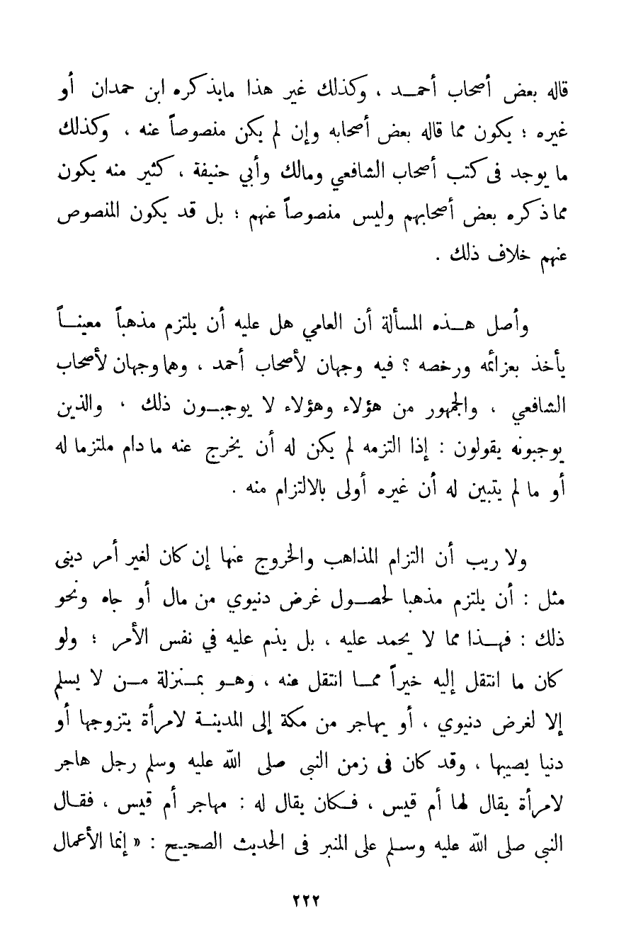 وَلَا رَيْبَ أَنَّ الْتِزَامَ الْمَذَاهِبِ وَالْخُرُوجَ عَنْهَا إنْ كَانَ لِغَيْرِ أَمْرٍ دِينِيٍّ مِثْلَ: أَنْ يَلْتَزِمَ مَذْهَبًا لِحُصُولِ غَرَضٍ دُنْيَوِيٍّ مِنْ مَالٍ أَوْ جَاهٍ وَنَحْوِ ذَلِكَ: فَهَذَا مِمَّا لَا يُحْمَدُ عَلَيْهِ بَلْ يُذَمُّ عَلَيْهِ فِي نَفْسِ الْأَمْرِ؛ وَلَوْ كَانَ مَا انْتَقَلَ إلَيْهِ خَيْرًا مِمَّا انْتَقَلَ عَنْهُ وَهُوَ بِمَنْزِلَةِ مَنْ لَا يُسْلِمُ إلَّا لِغَرَضِ دُنْيَوِيٍّ أَوْ يُهَاجِرُ مِنْ مَكَّةَ إلَى الْمَدِينَةِ لِامْرَأَةٍ يَتَزَوَّجُهَا أَوْ دُنْيَا يُصِيبُهَا وَقَدْ كَانَ فِي زَمَنِ النَّبِيِّ صَلَّى اللَّهُ عَلَيْهِ وَسَلَّمَ رَجُلٌ هَاجَرَ لِامْرَأَةٍ يُقَالُ لَهَا أُمُّ قَيْسٍ فَكَانَ يُقَالُ لَهُ: مُهَاجِرُ أُمِّ قَيْسٍ فَقَالَ النَّبِيُّ صَلَّى اللَّهُ عَلَيْهِ وَسَلَّمَ عَلَى الْمِنْبَرِ فِي الْحَدِيثِ الصَّحِيحِ: {إنَّمَا الْأَعْمَالُ