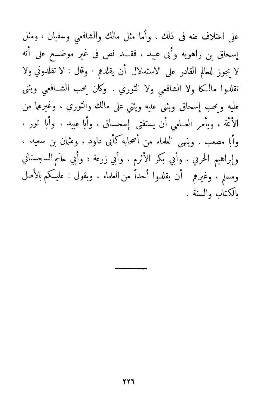 عَلَى اخْتِلَافٍ عَنْهُ فِي ذَلِكَ وَأَمَّا مِثْلُ مَالِكٍ وَالشَّافِعِيِّ وَسُفْيَانَ؛ وَمِثْلُ إسْحَاقَ بْنِ رَاهَوَيْه وَأَبِي عُبَيْدٍ فَقَدْ نَصَّ فِي غَيْرِ مَوْضِعٍ عَلَى أَنَّهُ لَا يَجُوزُ لِلْعَالِمِ الْقَادِرِ عَلَى الِاسْتِدْلَالِ أَنْ يُقَلِّدَهُمْ وَقَالَ: لَا تُقَلِّدُونِي وَلَا تُقَلِّدُوا مَالِكًا وَلَا الشَّافِعِيَّ وَلَا الثَّوْرِيَّ. وَكَانَ يُحِبُّ الشَّافِعِيَّ وَيُثْنِي عَلَيْهِ وَيُحِبُّ إسْحَاقَ وَيُثْنِي عَلَيْهِ وَيُثْنِي عَلَى مَالِكٍ وَالثَّوْرِيِّ وَغَيْرِهِمَا مِنْ الْأَئِمَّةِ وَيَأْمُرُ الْعَامِّيَّ أَنْ يَسْتَفْتِيَ إسْحَاقَ وَأَبَا عُبَيْدٍ وَأَبَا ثَوْرٍ وَأَبَا مُصْعَبٍ. وَيَنْهَى الْعُلَمَاءَ مِنْ أَصْحَابِهِ كَأَبِي دَاوُد وَعُثْمَانَ بْنِ سَعِيدٍ وَإِبْرَاهِيمَ الْحَرْبِيِّ؛ وَأَبِي بَكْرٍ الْأَثْرَمِ وَأَبِي زُرْعَةَ؛ وَأَبِي حَاتِمٍ السجستاني وَمُسْلِمٍ وَغَيْرِهِمْ: أَنْ يُقَلِّدُوا أَحَدًا مِنْ الْعُلَمَاءِ. وَيَقُولُ: عَلَيْكُمْ بِالْأَصْلِ بِالْكِتَابِ وَالسُّنَّةِ.