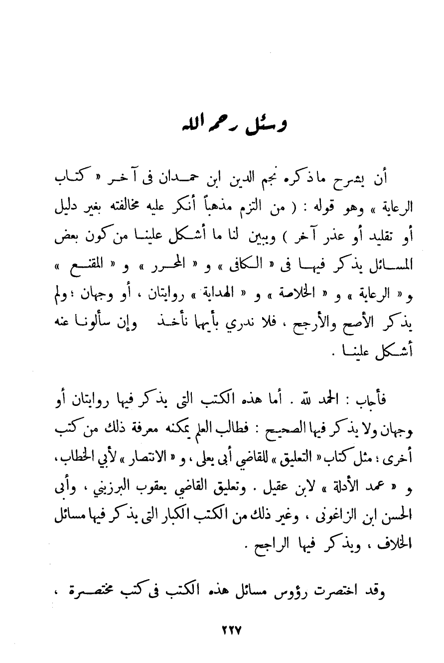 الْحَمْدُ لِلَّهِ، أَمَّا هَذِهِ الْكُتُبُ الَّتِي يُذْكَرُ فِيهَا رِوَايَتَانِ أَوْ وَجْهَانِ وَلَا يُذْكَرُ فِيهَا الصَّحِيحُ: فَطَالِبُ الْعِلْمِ يُمْكِنُهُ مَعْرِفَةُ ذَلِكَ مِنْ كُتُبٍ أُخْرَى؛ مِثْلَ كِتَابِ " التَّعْلِيقِ " لِلْقَاضِي أَبِي يَعْلَى وَ " الِانْتِصَارِ " لِأَبِي الْخَطَّابِ وَ " عُمَدِ الْأَدِلَّةِ " لِابْنِ عَقِيلٍ. وَتَعْلِيقِ الْقَاضِي يَعْقُوبَ البرزبيني وَأَبِي الْحَسَنِ ابْنِ الزَّاغُونِي وَغَيْرِ ذَلِكَ مِنْ الْكُتُبِ الْكِبَارِ الَّتِي يُذْكَرُ فِيهَا مَسَائِلُ الْخِلَافِ وَيُذْكَرُ فِيهَا الرَّاجِحُ. وَقَدْ اخْتَصَرْت رُءُوسَ مَسَائِلِ هَذِهِ الْكُتُبِ فِي كُتُبٍ مُخْتَصَرَةٍ