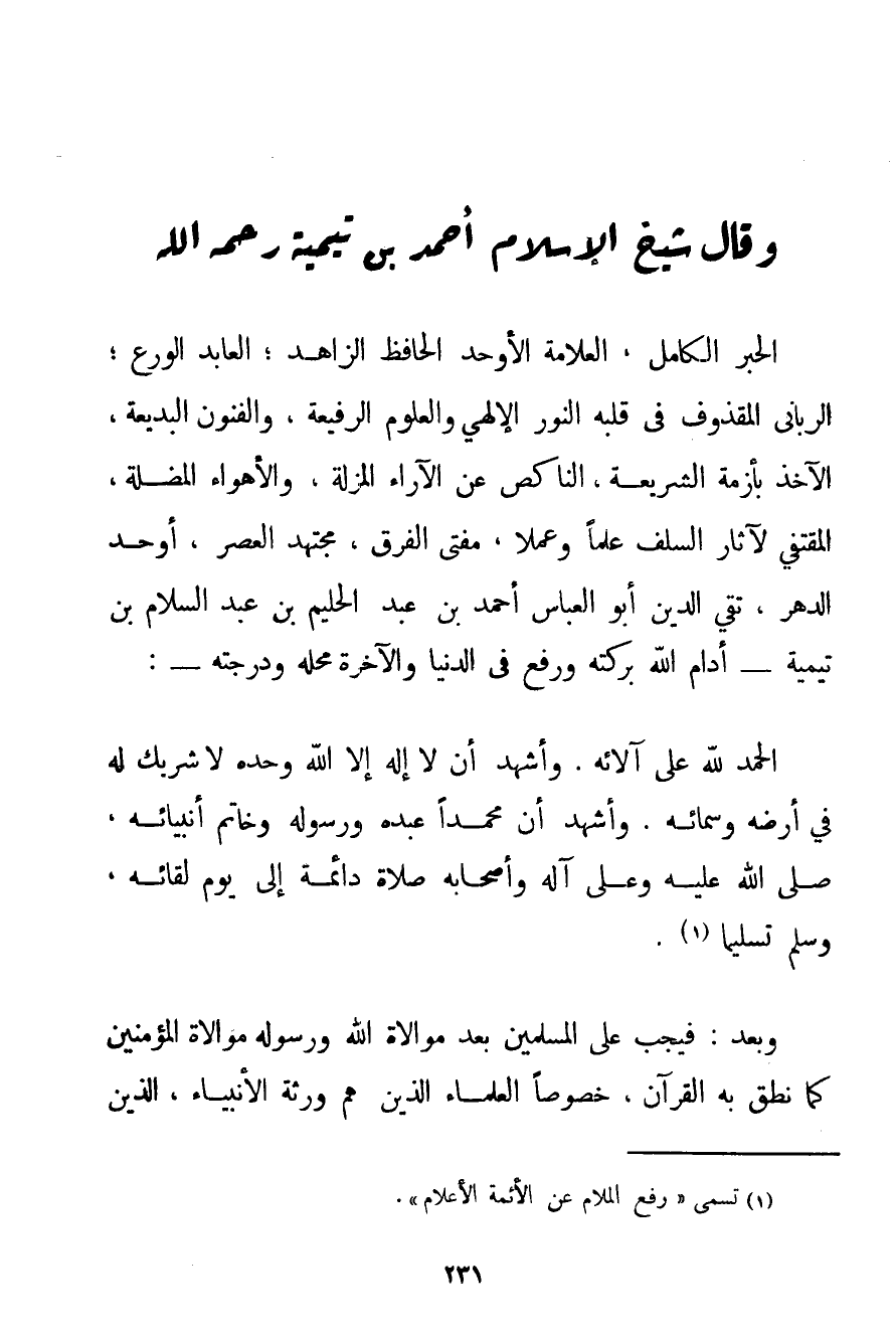 وَقَالَ شَيْخُ الْإِسْلَامِ أَحْمَد بْنُ تَيْمِيَّة رَحِمَهُ اللَّهُ الْحَبْرُ الْكَامِلُ الْعَلَّامَةُ الْأَوْحَدُ الْحَافِظُ الزَّاهِدُ؛ الْعَابِدُ الْوَرِعُ؛ الرَّبَّانِيُّ الْمَقْذُوفُ فِي قَلْبِهِ النُّورُ الْإِلَهِيُّ وَالْعُلُومُ الرَّفِيعَةُ وَالْفُنُونُ الْبَدِيعَةُ الْآخِذُ بِأَزْمَةِ الشَّرِيعَةِ النَّاكِصُ عَنْ الْآرَاءِ الْمُزِلَّةِ وَالْأَهْوَاءِ الْمُضِلَّةِ الْمُقْتَفِي لِآثَارِ السَّلَفِ عِلْمًا وَعَمَلًا مُفْتِي الْفِرَقِ مُجْتَهِدُ الْعَصْرِ أَوْحَدُ الدَّهْرِ تَقِيُّ الدِّينِ أَبُو الْعَبَّاسِ أَحْمَد بْنُ عَبْدِ الْحَلِيمِ بْنِ عَبْدِ السَّلَامِ بْنِ تَيْمِيَّة - أَدَامَ اللَّهُ بَرَكَتَهُ وَرَفَعَ فِي الدُّنْيَا وَالْآخِرَةِ مَحَلَّهُ وَدَرَجَتَهُ -: