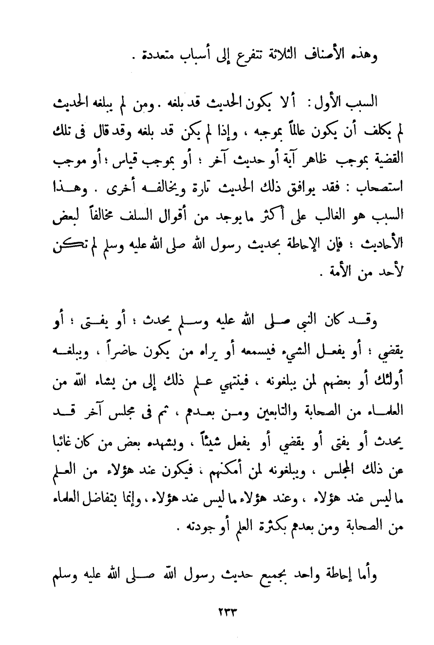 وَهَذِهِ الْأَصْنَافُ الثَّلَاثَةُ تَتَفَرَّعُ إلَى أَسْبَابٍ مُتَعَدِّدَةٍ. السَّبَبُ الْأَوَّلُ: أَلَّا يَكُونَ الْحَدِيثُ قَدْ بَلَغَهُ. وَمَنْ لَمْ يَبْلُغْهُ الْحَدِيثُ لَمْ يُكَلَّفْ أَنْ يَكُونَ عَالِمًا بِمُوجَبِهِ وَإِذَا لَمْ يَكُنْ قَدْ بَلَغَهُ وَقَدْ قَالَ فِي تِلْكَ الْقَضِيَّةِ بِمُوجَبِ ظَاهِرِ آيَةٍ أَوْ حَدِيثٍ آخَرَ؛ أَوْ بِمُوجَبِ قِيَاسٍ؛ أَوْ مُوجَبِ اسْتِصْحَابٍ: فَقَدْ يُوَافِقُ ذَلِكَ الْحَدِيثَ تَارَةً وَيُخَالِفُهُ أُخْرَى. وَهَذَا السَّبَبُ هُوَ الْغَالِبُ عَلَى أَكْثَرِ مَا يُوجَدُ مِنْ أَقْوَالِ السَّلَفِ مُخَالِفًا لِبَعْضِ الْأَحَادِيثِ؛ فَإِنَّ الْإِحَاطَةَ بِحَدِيثِ رَسُولِ اللَّهِ صَلَّى اللَّهُ عَلَيْهِ وَسَلَّمَ لَمْ تَكُنْ لِأَحَدِ مِنْ الْأُمَّةِ. وَقَدْ كَانَ النَّبِيُّ صَلَّى اللَّهُ عَلَيْهِ وَسَلَّمَ يُحَدِّثُ؛ أَوْ يُفْتِي؛ أَوْ يَقْضِي؛ أَوْ يَفْعَلُ الشَّيْءَ فَيَسْمَعُهُ أَوْ يَرَاهُ مَنْ يَكُونُ حَاضِرًا وَيُبَلِّغُهُ أُولَئِكَ أَوْ بَعْضُهُمْ لِمَنْ يُبَلِّغُونَهُ فَيَنْتَهِي عِلْمُ ذَلِكَ إلَى مَنْ يَشَاءُ اللَّهُ مِنْ الْعُلَمَاءِ مِنْ الصَّحَابَةِ وَالتَّابِعِينَ وَمَنْ بَعْدَهُمْ ثُمَّ فِي مَجْلِسٍ آخَرَ قَدْ يُحَدِّثُ أَوْ يُفْتِي أَوْ يَقْضِي أَوْ يَفْعَلُ شَيْئًا وَيَشْهَدُهُ بَعْضُ مَنْ كَانَ غَائِبًا عَنْ ذَلِكَ الْمَجْلِسِ وَيُبَلِّغُونَهُ لِمَنْ أَمْكَنَهُمْ فَيَكُونُ عِنْدَ هَؤُلَاءِ مِنْ الْعِلْمِ مَا لَيْسَ عِنْدَ هَؤُلَاءِ وَعِنْدَ هَؤُلَاءِ مَا لَيْسَ عِنْدَ هَؤُلَاءِ وَإِنَّمَا يَتَفَاضَلُ الْعُلَمَاءُ مِنْ الصَّحَابَةِ وَمَنْ بَعْدَهُمْ بِكَثْرَةِ الْعِلْمِ أَوْ جَوْدَتِهِ. وَأَمَّا إحَاطَةُ وَاحِدٍ بِجَمِيعِ حَدِيثِ رَسُولِ اللَّهِ صَلَّى اللَّهُ عَلَيْهِ وَسَلَّمَ