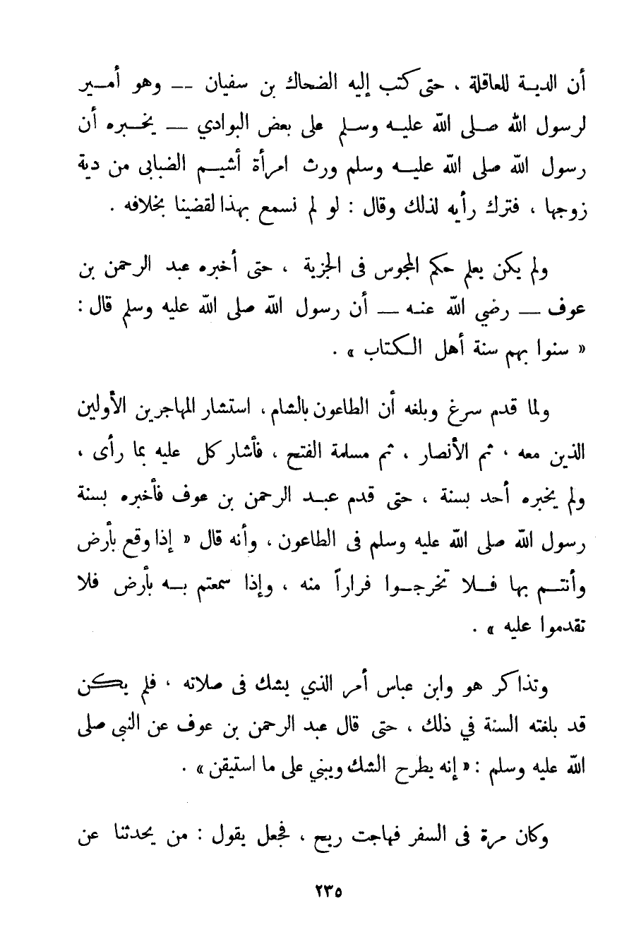 أَنَّ الدِّيَةَ لِلْعَاقِلَةِ حَتَّى كَتَبَ إلَيْهِ الضَّحَّاكُ بْنُ سُفْيَانَ - وَهُوَ أَمِيرٌ لِرَسُولِ اللَّهِ صَلَّى اللَّهُ عَلَيْهِ وَسَلَّمَ عَلَى بَعْضِ الْبَوَادِي - يُخْبِرُهُ {أَنَّ رَسُولَ اللَّهِ صَلَّى اللَّهُ عَلَيْهِ وَسَلَّمَ وَرَّثَ امْرَأَةَ أَشْيَمَ الضَّبَابِيِّ مِنْ دِيَةِ زَوْجِهَا} فَتَرَكَ رَأْيَهُ لِذَلِكَ وَقَالَ: لَوْ لَمْ نَسْمَعْ بِهَذَا لَقَضَيْنَا بِخِلَافِهِ. وَلَمْ يَكُنْ يَعْلَمُ حُكْمَ الْمَجُوسِ فِي الْجِزْيَةِ حَتَّى أَخْبَرَهُ عَبْدُ الرَّحْمَنِ بْنُ عَوْفٍ - رَضِيَ اللَّهُ عَنْهُ - {أَنَّ رَسُولَ اللَّهِ صَلَّى اللَّهُ عَلَيْهِ وَسَلَّمَ قَالَ: سَنُّوا بِهِمْ سُنَّةَ أَهْلِ الْكِتَابِ} . وَلَمَّا قَدِمَ سرغ وَبَلَغَهُ أَنَّ الطَّاعُونَ بِالشَّامِ اسْتَشَارَ الْمُهَاجِرِينَ الْأَوَّلِينَ الَّذِينَ مَعَهُ ثُمَّ الْأَنْصَارَ ثُمَّ مُسْلِمَةَ الْفَتْحِ فَأَشَارَ كُلٌّ عَلَيْهِ بِمَا رَأَى وَلَمْ يُخْبِرْهُ أَحَدٌ بِسُنَّةٍ حَتَّى قَدِمَ عَبْدُ الرَّحْمَنِ بْنُ عَوْفٍ {فَأَخْبَرَهُ بِسُنَّةِ رَسُولِ اللَّهِ صَلَّى اللَّهُ عَلَيْهِ وَسَلَّمَ فِي الطَّاعُونِ وَأَنَّهُ قَالَ إذَا وَقَعَ بِأَرْضِ وَأَنْتُمْ بِهَا فَلَا تَخْرُجُوا فِرَارًا مِنْهُ وَإِذَا سَمِعْتُمْ بِهِ بِأَرْضِ فَلَا تَقْدَمُوا عَلَيْهِ} . وَتَذَاكَرَ هُوَ وَابْنُ عَبَّاسٍ أَمْرَ الَّذِي يَشُكُّ فِي صَلَاتِهِ فَلَمْ يَكُنْ قَدْ بَلَغَتْهُ السُّنَّةُ فِي ذَلِكَ حَتَّى {قَالَ عَبْدُ الرَّحْمَنِ بْنُ عَوْفٍ عَنْ النَّبِيِّ صَلَّى اللَّهُ عَلَيْهِ وَسَلَّمَ إنَّهُ يَطْرَحُ الشَّكَّ وَيَبْنِي عَلَى مَا اسْتَيْقَنَ} . وَكَانَ مَرَّةً فِي السَّفَرِ فَهَاجَتْ رِيحٌ فَجَعَلَ يَقُولُ: مَنْ يُحَدِّثُنَا عَنْ