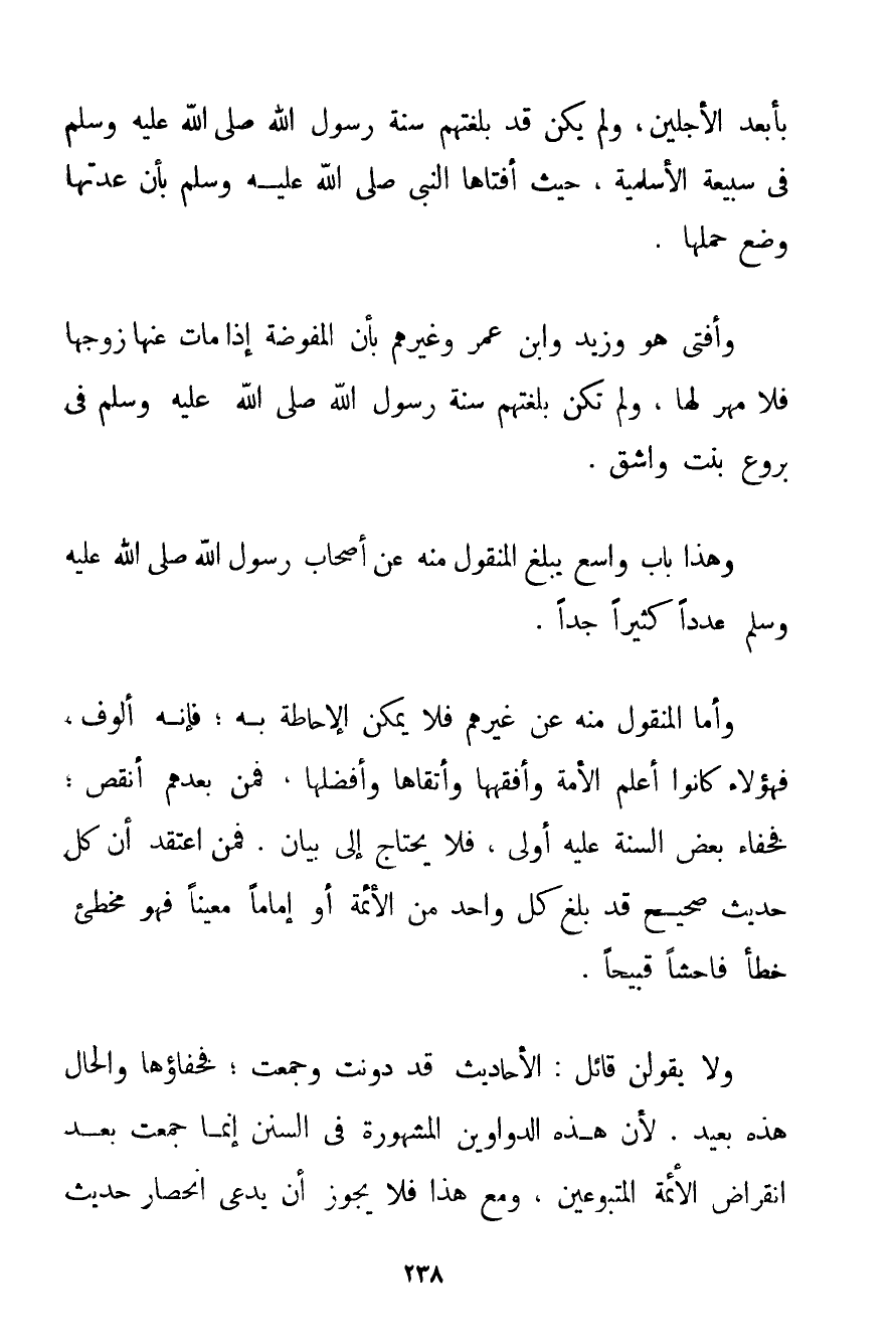 بِأَبْعَدِ الْأَجَلَيْنِ وَلَمْ يَكُنْ قَدْ بَلَغَتْهُمْ {سُنَّةُ رَسُولِ اللَّهِ صَلَّى اللَّهُ عَلَيْهِ وَسَلَّمَ فِي سبيعة الأسلمية حَيْثُ أَفْتَاهَا النَّبِيُّ صَلَّى اللَّهُ عَلَيْهِ وَسَلَّمَ بِأَنَّ عِدَّتَهَا وَضْعُ حَمْلِهَا} . وَأَفْتَى هُوَ وَزَيْدٌ وَابْنُ عُمَرَ وَغَيْرُهُمْ بِأَنَّ الْمُفَوَّضَةَ إذَا مَاتَ عَنْهَا زَوْجُهَا فَلَا مَهْرَ لَهَا وَلَمْ تَكُنْ بَلَغَتْهُمْ سُنَّةُ رَسُولِ اللَّهِ صَلَّى اللَّهُ عَلَيْهِ وَسَلَّمَ فِي بروع بِنْتِ وَاشِقٍ. وَهَذَا بَابٌ وَاسِعٌ يَبْلُغُ الْمَنْقُولُ مِنْهُ عَنْ أَصْحَابِ رَسُولِ اللَّهِ صَلَّى اللَّهُ عَلَيْهِ وَسَلَّمَ عَدَدًا كَثِيرًا جِدًّا. وَأَمَّا الْمَنْقُولُ مِنْهُ عَنْ غَيْرِهِمْ فَلَا يُمْكِنُ الْإِحَاطَةُ بِهِ؛ فَإِنَّهُ أُلُوفٌ فَهَؤُلَاءِ كَانُوا أَعْلَمَ الْأُمَّةِ وَأَفْقَهَهَا وَأَتْقَاهَا وَأَفْضَلَهَا فَمَنْ بَعْدَهُمْ أَنْقَصُ؛ فَخَفَاءُ بَعْضِ السُّنَّةِ عَلَيْهِ أَوْلَى فَلَا يَحْتَاجُ إلَى بَيَانٍ. فَمَنْ اعْتَقَدَ أَنَّ كُلَّ حَدِيثٍ صَحِيحٍ قَدْ بَلَغَ كُلَّ وَاحِدٍ مِنْ الْأَئِمَّةِ أَوْ إمَامًا مُعَيَّنًا فَهُوَ مُخْطِئٌ خَطَأً فَاحِشًا قَبِيحًا. وَلَا يَقُولَن قَائِلٌ: الْأَحَادِيثُ قَدْ دُوِّنَتْ وَجُمِعَتْ؛ فَخَفَاؤُهَا وَالْحَالُ هَذِهِ بَعِيدٌ. لِأَنَّ هَذِهِ الدَّوَاوِينَ الْمَشْهُورَةَ فِي السُّنَنِ إنَّمَا جُمِعَتْ بَعْدَ انْقِرَاضِ الْأَئِمَّةِ الْمَتْبُوعِينَ وَمَعَ هَذَا فَلَا يَجُوزُ أَنْ يَدَّعِيَ انْحِصَارَ حَدِيثِ