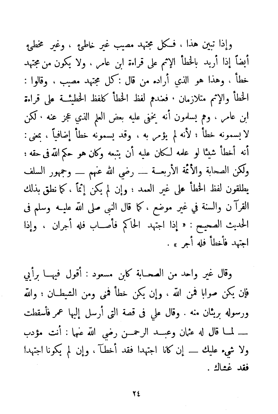 وَإِذَا تَبَيَّنَ هَذَا فَكُلُّ مُجْتَهِدٍ مُصِيبٌ غَيْرُ خَاطِئٍ وَغَيْرُ مُخْطِئٍ أَيْضًا إذَا أُرِيدَ بِالْخَطَأِ الْإِثْمُ عَلَى قِرَاءَةِ ابْنِ عَامِرٍ وَلَا يَكُونُ مِنْ مُجْتَهِدٍ خَطَأٌ وَهَذَا هُوَ الَّذِي أَرَادَهُ مَنْ قَالَ: كُلُّ مُجْتَهِدٍ مُصِيبٌ وَقَالُوا: الْخَطَأُ وَالْإِثْمُ مُتَلَازِمَانِ فَعِنْدَهُمْ لَفْظُ الْخَطَأِ كَلَفْظِ الْخَطِيئَةِ عَلَى قِرَاءَةِ ابْنِ عَامِرٍ وَهُمْ يُسَلِّمُونَ أَنَّهُ يَخْفَى عَلَيْهِ بَعْضُ الْعِلْمِ الَّذِي عَجَزَ عَنْهُ لَكِنْ لَا يُسَمُّونَهُ خَطَأً؛ لِأَنَّهُ لَمْ يُؤْمَرْ بِهِ وَقَدْ يُسَمُّونَهُ خَطَأً إضَافِيًّا بِمَعْنَى: أَنَّهُ أَخْطَأَ شَيْئًا لَوْ عَلِمَهُ لَكَانَ عَلَيْهِ أَنْ يَتْبَعَهُ وَكَانَ هُوَ حُكْمَ اللَّهِ فِي حَقِّهِ؛ وَلَكِنَّ الصَّحَابَةَ وَالْأَئِمَّةَ الْأَرْبَعَةَ - رَضِيَ اللَّهُ عَنْهُمْ - وَجُمْهُورَ السَّلَفِ يُطْلِقُونَ لَفْظَ الْخَطَأِ عَلَى غَيْرِ الْعَمْدِ؛ وَإِنْ لَمْ يَكُنْ إثْمًا كَمَا نَطَقَ بِذَلِكَ الْقُرْآنُ وَالسُّنَّةُ فِي غَيْرِ مَوْضِعٍ كَمَا قَالَ النَّبِيُّ صَلَّى اللَّهُ عَلَيْهِ وَسَلَّمَ فِي الْحَدِيثِ الصَّحِيحِ: {إذَا اجْتَهَدَ الْحَاكِمُ فَأَصَابَ فَلَهُ أَجْرَانِ وَإِذَا اجْتَهَدَ فَأَخْطَأَ فَلَهُ أَجْرٌ} . وَقَالَ غَيْرُ وَاحِدٍ مِنْ الصَّحَابَةِ كَابْنِ مَسْعُودٍ: أَقُولُ فِيهَا بِرَأْيِي فَإِنْ يَكُنْ صَوَابًا فَمِنْ اللَّهِ وَإِنْ يَكُنْ خَطَأً فَمِنِّي وَمِنْ الشَّيْطَانِ؛ وَاَللَّهُ وَرَسُولُهُ بَرِيئَانِ مِنْهُ. وَقَالَ عَلِيٌّ فِي قِصَّةِ الَّتِي أَرْسَلَ إلَيْهَا عُمَرُ فَأَسْقَطَتْ - لَمَّا قَالَ لَهُ عُثْمَانُ وَعَبْدُ الرَّحْمَنِ رَضِيَ اللَّهُ عَنْهُمَا أَنْتَ مُؤَدِّبٌ وَلَا شَيْءَ عَلَيْك - إنْ كَانَا اجْتَهَدَا فَقَدْ أَخْطَآ وَإِنْ لَمْ يَكُونَا اجْتَهَدَا فَقَدْ غَشَّاك.
