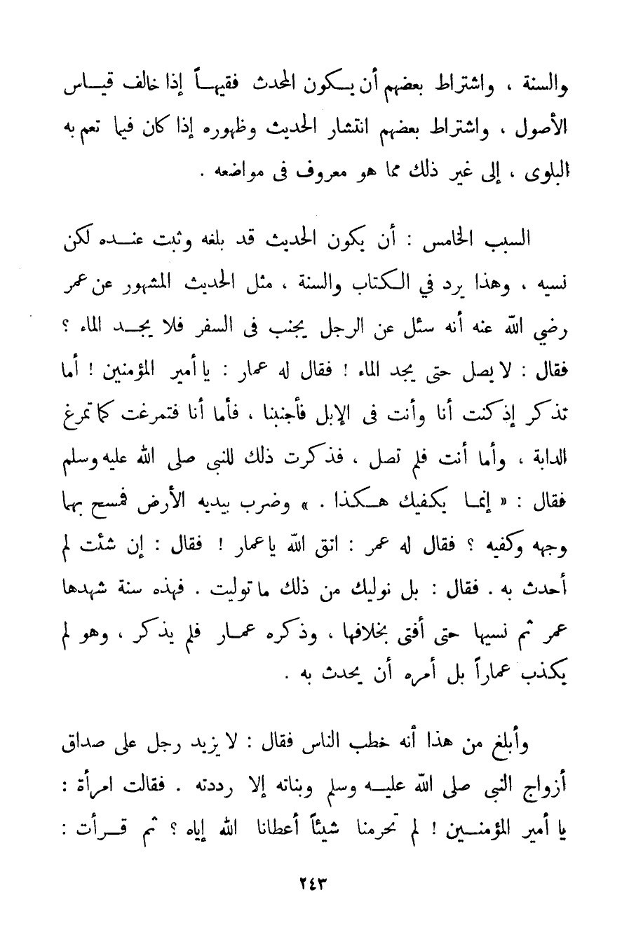 السَّبَبُ الْخَامِسُ: أَنْ يَكُونَ الْحَدِيثُ قَدْ بَلَغَهُ وَثَبَتَ عِنْدَهُ لَكِنْ نَسِيَهُ وَهَذَا يَرِدُ فِي الْكِتَابِ وَالسُّنَّةِ مِثْلَ الْحَدِيثِ الْمَشْهُورِ {عَنْ عُمَرَ رَضِيَ اللَّهُ عَنْهُ أَنَّهُ سُئِلَ عَنْ الرَّجُلِ يُجْنِبُ فِي السَّفَرِ فَلَا يَجِدُ الْمَاءَ؟ فَقَالَ: لَا يُصَلِّ حَتَّى يَجِدَ الْمَاءَ فَقَالَ لَهُ عَمَّارٌ: يَا أَمِيرَ الْمُؤْمِنِينَ أَمَا تَذْكُرُ إذْ كُنْت أَنَا وَأَنْتَ فِي الْإِبِلِ فَأَجْنَبْنَا فَأَمَّا أَنَا فَتَمَرَّغْت كَمَا تَمَرَّغُ الدَّابَّةُ وَأَمَّا أَنْتَ فَلَمْ تُصَلِّ فَذَكَرْت ذَلِكَ لِلنَّبِيِّ صَلَّى اللَّهُ عَلَيْهِ وَسَلَّمَ فَقَالَ: إنَّمَا يَكْفِيَك هَكَذَا وَضَرَبَ بِيَدَيْهِ الْأَرْضَ فَمَسَحَ بِهِمَا وَجْهَهُ وَكَفَّيْهِ؟} فَقَالَ لَهُ عُمَرُ: اتَّقِ اللَّهَ يَا عَمَّارُ فَقَالَ: إنْ شِئْت لَمْ أُحَدِّثْ بِهِ. فَقَالَ: بَلْ نُوَلِّيك مِنْ ذَلِكَ مَا تَوَلَّيْت. فَهَذِهِ سُنَّةٌ شَهِدَهَا عُمَرُ ثُمَّ نَسِيَهَا حَتَّى أَفْتَى بِخِلَافِهَا وَذَكَّرَهُ عَمَّارُ فَلَمْ يَذْكُرْ وَهُوَ لَمْ يُكَذِّبْ عَمَّارًا بَلْ أَمَرَهُ أَنْ يُحَدِّثَ بِهِ. وَأَبْلَغُ مِنْ هَذَا أَنَّهُ خَطَبَ النَّاسَ فَقَالَ: لَا يَزِيدُ رَجُلٌ عَلَى صَدَاقِ أَزْوَاجِ النَّبِيِّ صَلَّى اللَّهُ عَلَيْهِ وَسَلَّمَ وَبَنَاتِهِ إلَّا رَدَدْته. فَقَالَتْ امْرَأَةٌ: يَا أَمِيرَ الْمُؤْمِنِينَ لِمَ تَحْرِمُنَا شَيْئًا أَعْطَانَا اللَّهُ إيَّاهُ؟ ثُمَّ قَرَأَتْ: