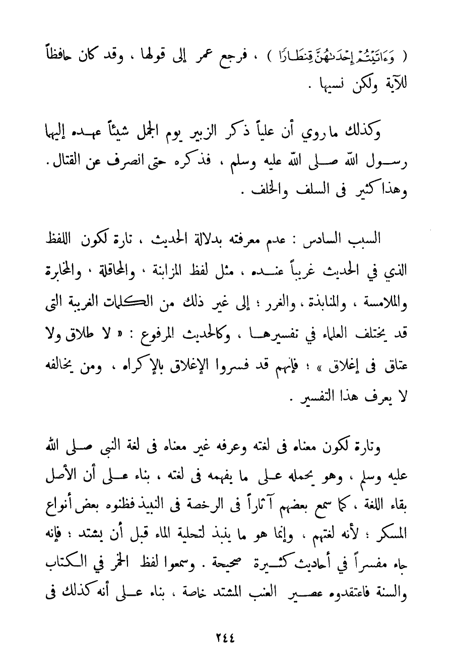 السَّبَبُ السَّادِسُ: عَدَمُ مَعْرِفَتِهِ بِدَلَالَةِ الْحَدِيثِ تَارَةً لِكَوْنِ اللَّفْظِ الَّذِي فِي الْحَدِيثِ غَرِيبًا عِنْدَهُ مِثْلَ لَفْظِ الْمُزَابَنَةِ وَالْمُحَاقَلَةِ وَالْمُخَابَرَةِ وَالْمُلَامَسَةِ وَالْمُنَابَذَةِ وَالْغَرَرِ؛ إلَى غَيْرِ ذَلِكَ مِنْ الْكَلِمَاتِ الْغَرِيبَةِ الَّتِي قَدْ يَخْتَلِفُ الْعُلَمَاءُ فِي تَفْسِيرِهَا وَكَالْحَدِيثِ الْمَرْفُوعِ: {لَا طَلَاقَ وَلَا عَتَاقَ فِي إغْلَاقٍ} فَإِنَّهُمْ قَدْ فَسَّرُوا الْإِغْلَاقَ بِالْإِكْرَاهِ وَمَنْ يُخَالِفُهُ لَا يَعْرِفُ هَذَا التَّفْسِيرَ. وَتَارَةً لِكَوْنِ مَعْنَاهُ فِي لُغَتِهِ وَعُرْفِهِ غَيْرَ مَعْنَاهُ فِي لُغَةِ النَّبِيِّ صَلَّى اللَّهُ عَلَيْهِ وَسَلَّمَ وَهُوَ يَحْمِلُهُ عَلَى مَا يَفْهَمُهُ فِي لُغَتِهِ بِنَاءً عَلَى أَنَّ الْأَصْلَ بَقَاءُ اللُّغَةِ كَمَا سَمِعَ بَعْضُهُمْ آثَارًا فِي الرُّخْصَةِ فِي النَّبِيذِ فَظَنُّوهُ بَعْضَ أَنْوَاعِ الْمُسْكِرِ؛ لِأَنَّهُ لُغَتُهُمْ وَإِنَّمَا هُوَ مَا يُنْبَذُ لِتَحْلِيَةِ الْمَاءِ قَبْلَ أَنْ يَشْتَدَّ؛ فَإِنَّهُ جَاءَ مُفَسَّرًا فِي أَحَادِيثَ كَثِيرَةٍ صَحِيحَةٍ. وَسَمِعُوا لَفْظَ الْخَمْرِ فِي الْكِتَابِ وَالسُّنَّةِ فَاعْتَقَدُوهُ عَصِيرَ الْعِنَبِ الْمُشْتَدِّ خَاصَّةً بِنَاءً عَلَى أَنَّهُ كَذَلِكَ فِي