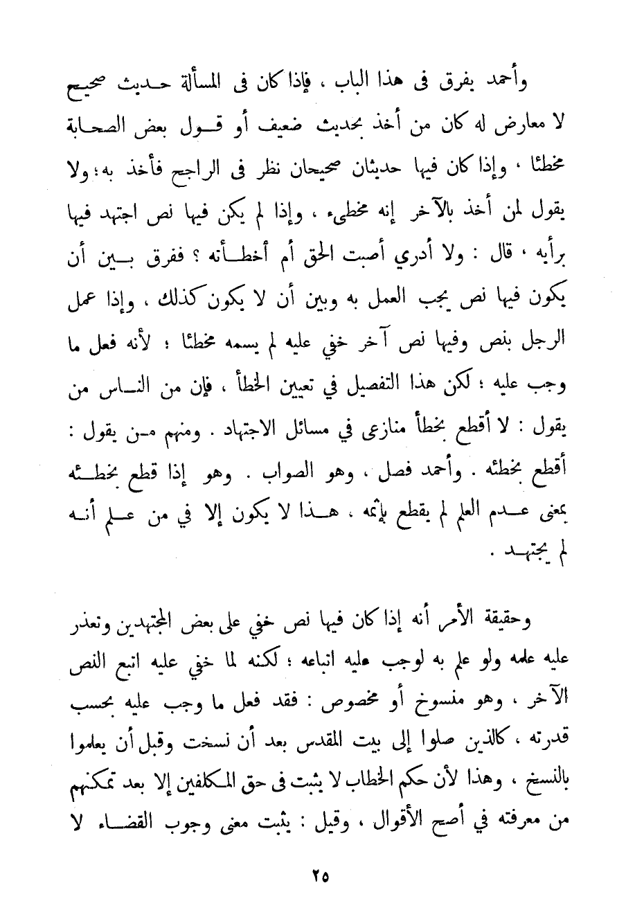 وَأَحْمَد يُفَرِّقُ فِي هَذَا الْبَابِ فَإِذَا كَانَ فِي الْمَسْأَلَةِ حَدِيثٌ صَحِيحٌ لَا مُعَارِضَ لَهُ كَانَ مَنْ أَخَذَ بِحَدِيثِ ضَعِيفٍ أَوْ قَوْلِ بَعْضِ الصَّحَابَةِ مُخْطِئًا وَإِذَا كَانَ فِيهَا حَدِيثَانِ صَحِيحَانِ نَظَرَ فِي الرَّاجِحِ فَأَخَذَ بِهِ؛ وَلَا يَقُولُ لِمَنْ أَخَذَ بِالْآخَرِ إنَّهُ مُخْطِئٌ وَإِذَا لَمْ يَكُنْ فِيهَا نَصٌّ اجْتَهَدَ فِيهَا بِرَأْيِهِ قَالَ: وَلَا أَدْرِي أَصَبْت الْحَقَّ أَمْ أَخْطَأْته؟ فَفَرَّقَ بَيْنَ أَنْ يَكُونَ فِيهَا نَصٌّ يَجِبُ الْعَمَلُ بِهِ وَبَيْنَ أَنْ لَا يَكُونَ كَذَلِكَ وَإِذَا عَمِلَ الرَّجُلُ بِنَصِّ وَفِيهَا نَصٌّ آخَرُ خَفِيَ عَلَيْهِ لَمْ يُسَمِّهِ مُخْطِئًا؛ لِأَنَّهُ فَعَلَ مَا وَجَبَ عَلَيْهِ؛ لَكِنَّ هَذَا التَّفْصِيلَ فِي تَعْيِينِ الْخَطَأِ فَإِنَّ مِنْ النَّاسِ مَنْ يَقُولُ: لَا أَقْطَعُ بِخَطَأِ مُنَازِعِي فِي مَسَائِلِ الِاجْتِهَادِ. وَمِنْهُمْ مَنْ يَقُولُ: أَقْطَعُ بِخَطَئِهِ. وَأَحْمَد فَصَّلَ وَهُوَ الصَّوَابُ. وَهُوَ إذَا قَطَعَ بِخَطَئِهِ بِمَعْنَى عَدَمِ الْعِلْمِ لَمْ يَقْطَعْ بِإِثْمِهِ هَذَا لَا يَكُونُ إلَّا فِي مَنْ عَلِمَ أَنَّهُ لَمْ يَجْتَهِدْ. وَحَقِيقَةُ الْأَمْرِ أَنَّهُ إذَا كَانَ فِيهَا نَصٌّ خَفِيَ عَلَى بَعْضِ الْمُجْتَهِدِينَ وَتَعَذَّرَ عَلَيْهِ عِلْمُهُ وَلَوْ عَلِمَ بِهِ لَوَجَبَ عَلَيْهِ اتِّبَاعُهُ؛ لَكِنَّهُ لَمَّا خَفِيَ عَلَيْهِ اتَّبَعَ النَّصَّ الْآخَرَ وَهُوَ مَنْسُوخٌ أَوْ مَخْصُوصٌ: فَقَدْ فَعَلَ مَا وَجَبَ عَلَيْهِ بِحَسَبِ قُدْرَتِهِ كَاَلَّذِينَ صَلَّوْا إلَى بَيْتِ الْمَقْدِسِ بَعْدَ أَنْ نُسِخَتْ وَقَبْلَ أَنْ يَعْلَمُوا بِالنَّسْخِ وَهَذَا لِأَنَّ حُكْمَ الْخِطَابِ لَا يَثْبُتُ فِي حَقِّ الْمُكَلَّفِينَ إلَّا بَعْدَ تَمَكُّنِهِمْ مِنْ مَعْرِفَتِهِ فِي أَصَحِّ الْأَقْوَالِ وَقِيلَ: يَثْبُتُ مَعْنَى وُجُوبِ الْقَضَاءِ لَا