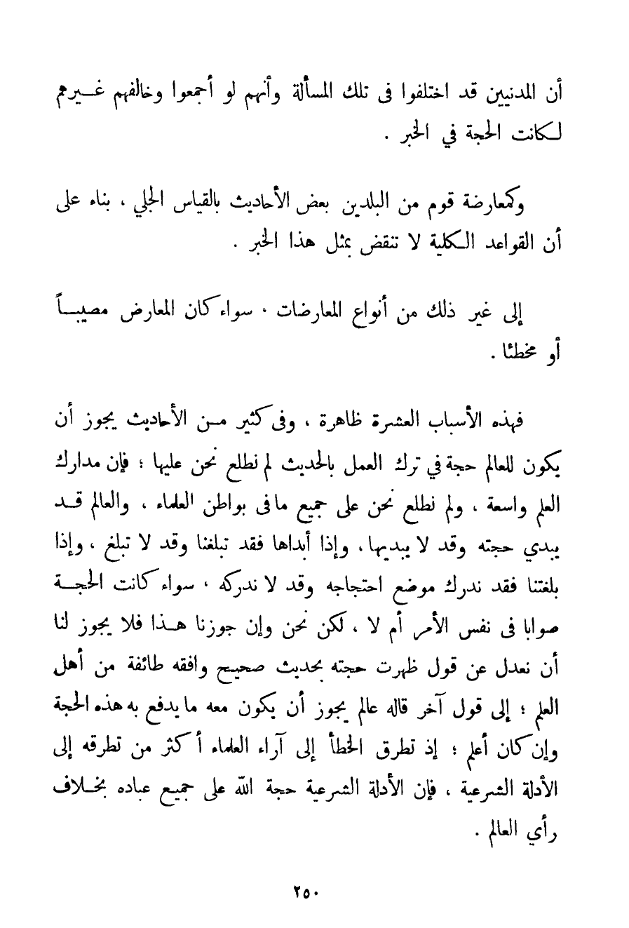 أَنَّ الْمَدَنِيِّينَ قَدْ اخْتَلَفُوا فِي تِلْكَ الْمَسْأَلَةِ وَأَنَّهُمْ لَوْ أَجْمَعُوا وَخَالَفَهُمْ غَيْرُهُمْ لَكَانَتْ الْحُجَّةُ فِي الْخَبَرِ. وَكَمُعَارَضَةِ قَوْمٍ مِنْ الْبَلَدَيْنِ بَعْضَ الْأَحَادِيثِ بِالْقِيَاسِ الْجَلِيِّ بِنَاءً عَلَى أَنَّ الْقَوَاعِدَ الْكُلِّيَّةَ لَا تُنْقَضُ بِمِثْلِ هَذَا الْخَبَرِ. إلَى غَيْرِ ذَلِكَ مِنْ أَنْوَاعِ الْمُعَارَضَاتِ سَوَاءٌ كَانَ الْمُعَارِضُ مُصِيبًا أَوْ مُخْطِئًا. فَهَذِهِ الْأَسْبَابُ الْعَشَرَةُ ظَاهِرَةٌ وَفِي كَثِيرٍ مِنْ الْأَحَادِيثِ يَجُوزُ أَنْ يَكُونَ لِلْعَالِمِ حُجَّةٌ فِي تَرْكِ الْعَمَلِ بِالْحَدِيثِ لَمْ نَطَّلِعْ نَحْنُ عَلَيْهَا؛ فَإِنَّ مَدَارِكَ الْعِلْمِ وَاسِعَةٌ وَلَمْ نَطَّلِعْ نَحْنُ عَلَى جَمِيعِ مَا فِي بَوَاطِنِ الْعُلَمَاءِ وَالْعَالِمُ قَدْ يُبْدِي حُجَّتَهُ وَقَدْ لَا يُبْدِيهَا وَإِذَا أَبْدَاهَا فَقَدْ تَبْلُغُنَا وَقَدْ لَا تَبْلُغُ وَإِذَا بَلَغَتْنَا فَقَدْ نُدْرِكُ مَوْضِعَ احْتِجَاجِهِ وَقَدْ لَا نُدْرِكُهُ سَوَاءٌ كَانَتْ الْحُجَّةُ صَوَابًا فِي نَفْسِ الْأَمْرِ أَمْ لَا لَكِنْ نَحْنُ وَإِنْ جَوَّزْنَا هَذَا فَلَا يَجُوزُ لَنَا أَنْ نَعْدِلَ عَنْ قَوْلٍ ظَهَرَتْ حُجَّتُهُ بِحَدِيثِ صَحِيحٍ وَافَقَهُ طَائِفَةٌ مِنْ أَهْلِ الْعِلْمِ؛ إلَى قَوْلٍ آخَرَ قَالَهُ عَالِمٌ يَجُوزُ أَنْ يَكُونَ مَعَهُ مَا يَدْفَعُ بِهِ هَذِهِ الْحُجَّةَ وَإِنْ كَانَ أَعْلَم؛ إذْ تَطَرُّقُ الْخَطَأِ إلَى آرَاءِ الْعُلَمَاءِ أَكْثَرُ مِنْ تَطَرُّقِهِ إلَى الْأَدِلَّةِ الشَّرْعِيَّةِ فَإِنَّ الْأَدِلَّةَ الشَّرْعِيَّةَ حُجَّةُ اللَّهِ عَلَى جَمِيعِ عِبَادِهِ بِخِلَافِ رَأْيِ الْعَالِمِ.