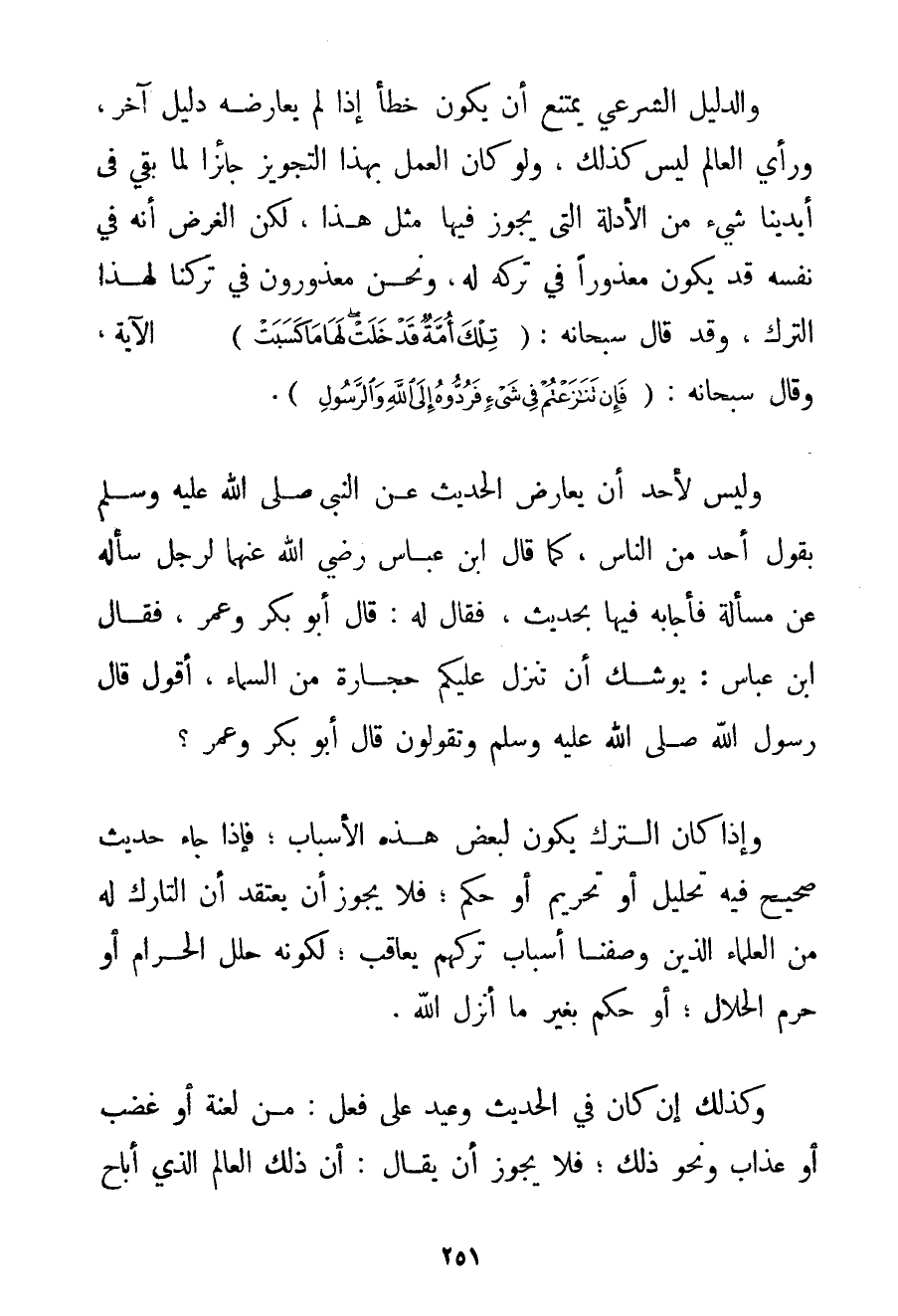 وَالدَّلِيلُ الشَّرْعِيُّ يَمْتَنِعُ أَنْ يَكُونَ خَطَأً إذَا لَمْ يُعَارِضْهُ دَلِيلٌ آخَرُ وَرَأْيُ الْعَالِمِ لَيْسَ كَذَلِكَ وَلَوْ كَانَ الْعَمَلُ بِهَذَا التَّجْوِيزِ جَائِزًا لَمَا بَقِيَ فِي أَيْدِينَا شَيْءٌ مِنْ الْأَدِلَّةِ الَّتِي يَجُوزُ فِيهَا مِثْلُ هَذَا لَكِنَّ الْغَرَضَ أَنَّهُ فِي نَفْسِهِ قَدْ يَكُونُ مَعْذُورًا فِي تَرْكِهِ لَهُ وَنَحْنُ مَعْذُورُونَ فِي تَرْكِنَا لِهَذَا التَّرْكِ وَقَدْ قَالَ سُبْحَانَهُ: {تِلْكَ أُمَّةٌ قَدْ خَلَتْ لَهَا مَا كَسَبَتْ} الْآيَةَ وَقَالَ سُبْحَانَهُ: {فَإِنْ تَنَازَعْتُمْ فِي شَيْءٍ فَرُدُّوهُ إلَى اللَّهِ وَالرَّسُولِ} ، وَلَيْسَ لِأَحَدِ أَنْ يُعَارِضَ الْحَدِيثَ عَنْ النَّبِيِّ صَلَّى اللَّهُ عَلَيْهِ وَسَلَّمَ بِقَوْلِ أَحَدٍ مِنْ النَّاسِ كَمَا قَالَ ابْنُ عَبَّاسٍ رَضِيَ اللَّهُ عَنْهُمَا لِرَجُلِ سَأَلَهُ عَنْ مَسْأَلَةٍ فَأَجَابَهُ فِيهَا بِحَدِيثِ فَقَالَ لَهُ: قَالَ أَبُو بَكْرٍ وَعُمَرُ فَقَالَ ابْنُ عَبَّاسٍ: يُوشِكُ أَنْ تَنْزِلَ عَلَيْكُمْ حِجَارَةٌ مِنْ السَّمَاءِ أَقُولُ قَالَ رَسُولُ اللَّهِ صَلَّى اللَّهُ عَلَيْهِ وَسَلَّمَ وَتَقُولُونَ قَالَ أَبُو بَكْرٍ وَعُمَرُ؟ وَإِذَا كَانَ التَّرْكُ يَكُونُ لِبَعْضِ هَذِهِ الْأَسْبَابِ؛ فَإِذَا جَاءَ حَدِيثٌ صَحِيحٌ فِيهِ تَحْلِيلٌ أَوْ تَحْرِيمٌ أَوْ حُكْمٌ؛ فَلَا يَجُوزُ أَنْ يَعْتَقِدَ أَنَّ التَّارِكَ لَهُ مِنْ الْعُلَمَاءِ الَّذِينَ وَصَفْنَا أَسْبَابَ تَرْكِهِمْ يُعَاقَبُ؛ لِكَوْنِهِ حَلَّلَ الْحَرَامَ أَوْ حَرَّمَ الْحَلَالَ؛ أَوْ حَكَمَ بِغَيْرِ مَا أَنْزَلَ اللَّهُ. وَكَذَلِكَ إنْ كَانَ فِي الْحَدِيثِ وَعِيدٌ عَلَى فِعْلٍ: مِنْ لَعْنَةٍ أَوْ غَضَبٍ أَوْ عَذَابٍ وَنَحْوِ ذَلِكَ؛ فَلَا يَجُوزُ أَنْ يُقَالَ: إنَّ ذَلِكَ الْعَالِمَ الَّذِي أَبَاحَ