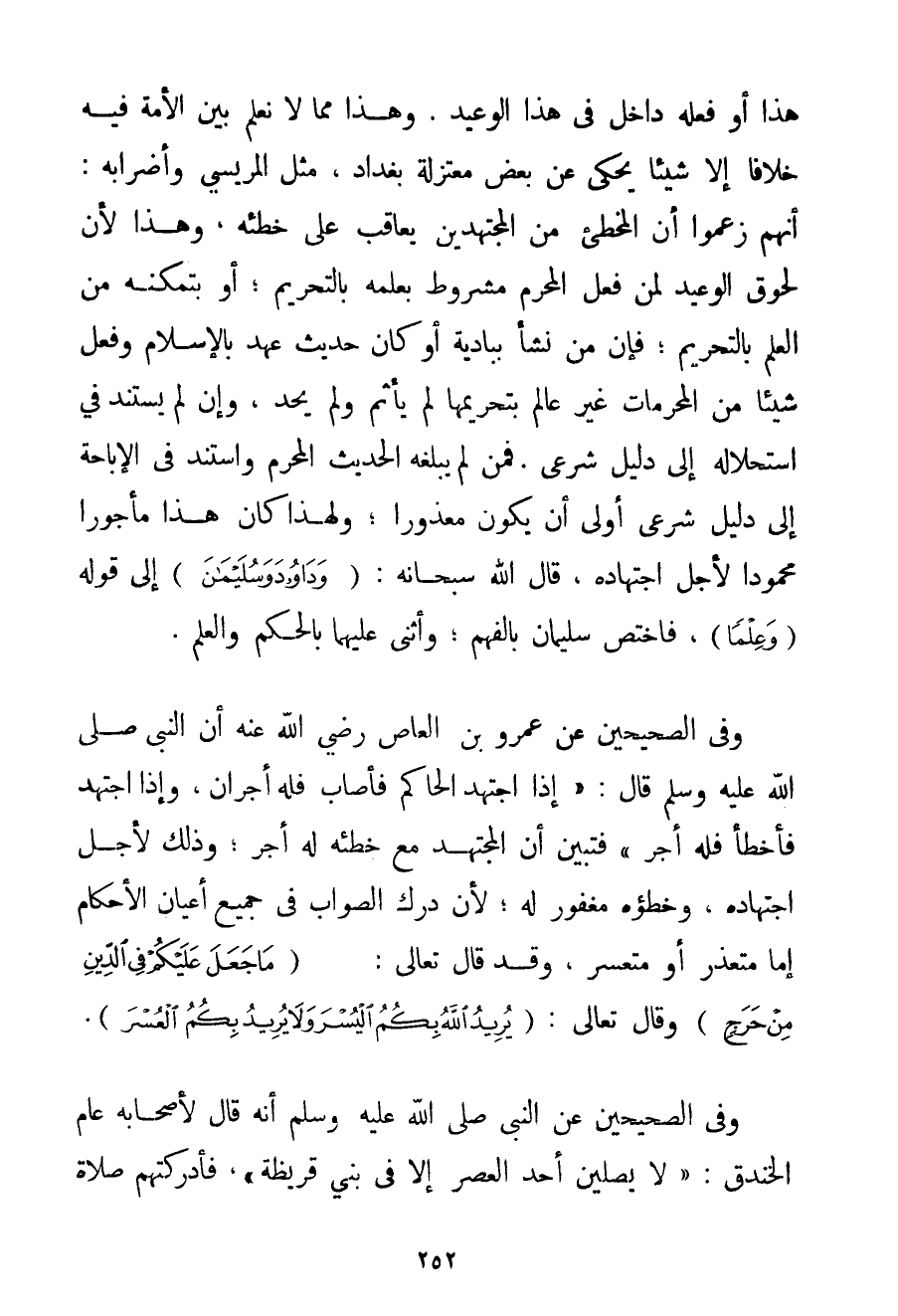 هَذَا أَوْ فَعَلَهُ دَاخِلٌ فِي هَذَا الْوَعِيدِ. وَهَذَا مِمَّا لَا نَعْلَمُ بَيْنَ الْأُمَّةِ فِيهِ خِلَافًا إلَّا شَيْئًا يُحْكَى عَنْ بَعْضِ مُعْتَزِلَةِ بَغْدَادَ مِثْلَ المريسي وَأَضْرَابِهِ: أَنَّهُمْ زَعَمُوا أَنَّ الْمُخْطِئَ مِنْ الْمُجْتَهِدِينَ يُعَاقَبُ عَلَى خَطَئِهِ وَهَذَا لِأَنَّ لُحُوقَ الْوَعِيدِ لِمَنْ فَعَلَ الْمُحَرَّمَ مَشْرُوطٌ بِعِلْمِهِ بِالتَّحْرِيمِ؛ أَوْ بِتَمَكُّنِهِ مِنْ الْعِلْمِ بِالتَّحْرِيمِ؛ فَإِنَّ مَنْ نَشَأَ بِبَادِيَةٍ أَوْ كَانَ حَدِيثَ عَهْدٍ بِالْإِسْلَامِ وَفَعَلَ شَيْئًا مِنْ الْمُحَرَّمَاتِ غَيْرَ عَالِمٍ بِتَحْرِيمِهَا لَمْ يَأْثَمْ وَلَمْ يُحَدَّ وَإِنْ لَمْ يَسْتَنِدْ فِي اسْتِحْلَالِهِ إلَى دَلِيلٍ شَرْعِيٍّ. فَمَنْ لَمْ يَبْلُغْهُ الْحَدِيثُ الْمُحَرِّمُ وَاسْتَنَدَ فِي الْإِبَاحَةِ إلَى دَلِيلٍ شَرْعِيٍّ أَوْلَى أَنْ يَكُونَ مَعْذُورًا؛ وَلِهَذَا كَانَ هَذَا مَأْجُورًا مَحْمُودًا لِأَجْلِ اجْتِهَادِهِ قَالَ اللَّهُ سُبْحَانَهُ: {وَدَاوُدَ وَسُلَيْمَانَ} إلَى قَوْلِهِ {وَعِلْمًا} فَاخْتَصَّ سُلَيْمَانَ بِالْفَهْمِ؛ وَأَثْنَى عَلَيْهِمَا بِالْحُكْمِ وَالْعِلْمِ. وَفِي الصَّحِيحَيْنِ عَنْ عَمْرِو بْنِ العاص رَضِيَ اللَّهُ عَنْهُ أَنَّ النَّبِيَّ صَلَّى اللَّهُ عَلَيْهِ وَسَلَّمَ قَالَ: {إذَا اجْتَهَدَ الْحَاكِمُ فَأَصَابَ فَلَهُ أَجْرَانِ وَإِذَا اجْتَهَدَ فَأَخْطَأَ فَلَهُ أَجْرٌ} فَتَبَيَّنَ أَنَّ الْمُجْتَهِدَ مَعَ خَطَئِهِ لَهُ أَجْرٌ؛ وَذَلِكَ لِأَجْلِ اجْتِهَادِهِ وَخَطَؤُهُ مَغْفُورٌ لَهُ؛ لِأَنَّ دَرْكَ الصَّوَابِ فِي جَمِيعِ أَعْيَانِ الْأَحْكَامِ إمَّا مُتَعَذَّرٌ أَوْ مُتَعَسِّرٌ وَقَدْ قَالَ تَعَالَى: {وَمَا جَعَلَ عَلَيْكُمْ فِي الدِّينِ مِنْ حَرَجٍ} وَقَالَ تَعَالَى: {يُرِيدُ اللَّهُ بِكُمُ الْيُسْرَ وَلَا يُرِيدُ بِكُمُ الْعُسْرَ} . وَفِي الصَّحِيحَيْنِ {عَنْ النَّبِيِّ صَلَّى اللَّهُ عَلَيْهِ وَسَلَّمَ أَنَّهُ قَالَ لِأَصْحَابِهِ عَامَ الْخَنْدَقِ: لَا يُصَلِّيَنَّ أَحَدٌ الْعَصْرَ إلَّا فِي بَنِي قُرَيْظَةَ فَأَدْرَكَتْهُمْ صَلَاةُ