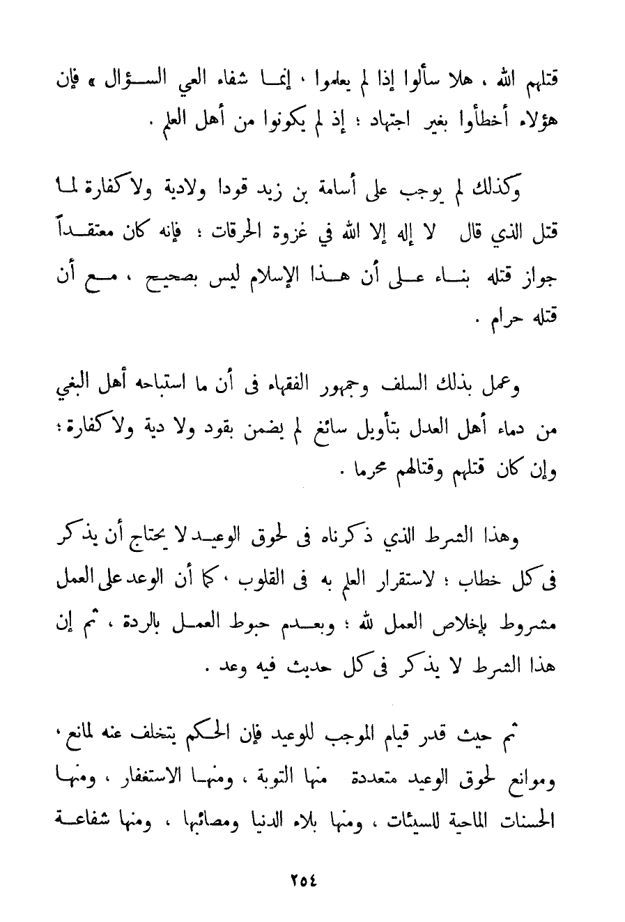 قَتَلَهُمْ اللَّهُ هَلَّا سَأَلُوا إذَا لَمْ يَعْلَمُوا إنَّمَا شِفَاءُ الْعَيِّ السُّؤَالُ} فَإِنَّ هَؤُلَاءِ أَخْطَئُوا بِغَيْرِ اجْتِهَادٍ؛ إذْ لَمْ يَكُونُوا مِنْ أَهْلِ الْعِلْمِ. وَكَذَلِكَ {لَمْ يُوجِبْ عَلَى أُسَامَةَ بْنِ زَيْدٍ قَوَدًا وَلَا دِيَةً وَلَا كَفَّارَةً لَمَّا قَتَلَ الَّذِي قَالَ: لَا إلَهَ إلَّا اللَّهُ فِي غَزْوَةِ الْحَرِقَاتِ} فَإِنَّهُ كَانَ مُعْتَقِدًا جَوَازَ قَتْلِهِ بِنَاءً عَلَى أَنَّ هَذَا الْإِسْلَامَ لَيْسَ بِصَحِيحِ مَعَ أَنَّ قَتْلَهُ حَرَامٌ. وَعَمِلَ بِذَلِكَ السَّلَفُ وَجُمْهُورُ الْفُقَهَاءِ فِي أَنَّ مَا اسْتَبَاحَهُ أَهْلُ الْبَغْيِ مِنْ دِمَاءِ أَهْلِ الْعَدْلِ بِتَأْوِيلِ سَائِغٍ لَمْ يُضْمَنْ بِقَوَدِ وَلَا دِيَةٍ وَلَا كَفَّارَةٍ؛ وَإِنْ كَانَ قَتْلُهُمْ وَقِتَالُهُمْ مُحَرَّمًا. وَهَذَا الشَّرْطُ الَّذِي ذَكَرْنَاهُ فِي لُحُوقِ الْوَعِيدِ لَا يَحْتَاجُ أَنْ يُذْكَرَ فِي كُلِّ خِطَابٍ؛ لِاسْتِقْرَارِ الْعِلْمِ بِهِ فِي الْقُلُوبِ كَمَا أَنَّ الْوَعْدَ عَلَى الْعَمَلِ مَشْرُوطٌ بِإِخْلَاصِ الْعَمَل لِلَّهِ؛ وَبِعَدَمِ حُبُوطِ الْعَمَلِ بِالرِّدَّةِ ثُمَّ إنَّ هَذَا الشَّرْطَ لَا يُذْكَرُ فِي كُلِّ حَدِيثٍ فِيهِ وَعْدٌ. ثُمَّ حَيْثُ قُدِّرَ قِيَامُ الْمُوجِبِ لِلْوَعِيدِ فَإِنَّ الْحُكْمَ يَتَخَلَّفُ عَنْهُ لِمَانِعِ وَمَوَانِعُ لُحُوقِ الْوَعِيدِ مُتَعَدِّدَةٌ: مِنْهَا التَّوْبَةُ وَمِنْهَا الِاسْتِغْفَارُ وَمِنْهَا الْحَسَنَاتُ الْمَاحِيَةُ لِلسَّيِّئَاتِ وَمِنْهَا بَلَاءُ الدُّنْيَا وَمَصَائِبُهَا وَمِنْهَا شَفَاعَةُ