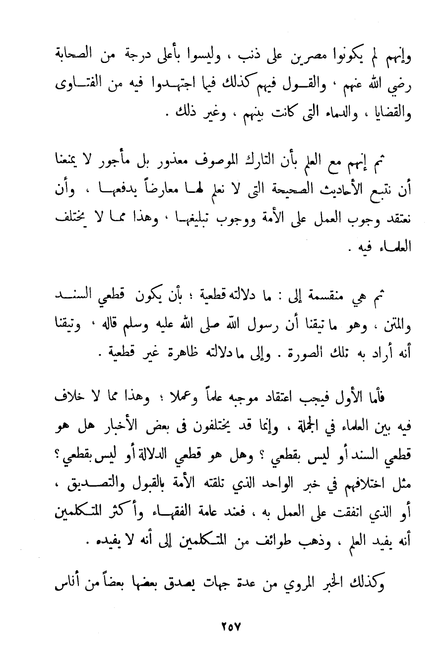 وَإِنَّهُمْ لَمْ يَكُونُوا مُصِرِّينَ عَلَى ذَنْبٍ وَلَيْسُوا بِأَعْلَى دَرَجَةٍ مِنْ الصَّحَابَةِ رَضِيَ اللَّهُ عَنْهُمْ وَالْقَوْلُ فِيهِمْ كَذَلِكَ فِيمَا اجْتَهَدُوا فِيهِ مِنْ الْفَتَاوَى وَالْقَضَايَا وَالدِّمَاءِ الَّتِي كَانَتْ بَيْنَهُمْ وَغَيْرِ ذَلِكَ. ثُمَّ إنَّهُمْ مَعَ الْعِلْمِ بِأَنَّ التَّارِكَ الْمَوْصُوفَ مَعْذُورٌ بَلْ مَأْجُورٌ لَا يَمْنَعُنَا أَنْ نَتَّبِعَ الْأَحَادِيثَ الصَّحِيحَةَ الَّتِي لَا نَعْلَمُ لَهَا مُعَارِضًا يَدْفَعُهَا وَأَنْ نَعْتَقِدَ وُجُوبَ الْعَمَلِ عَلَى الْأُمَّةِ وَوُجُوبَ تَبْلِيغِهَا. وَهَذَا مِمَّا لَا يَخْتَلِفُ الْعُلَمَاءُ فِيهِ. ثُمَّ هِيَ مُنْقَسِمَةٌ إلَى: مَا دَلَالَتُهُ قَطْعِيَّةٌ؛ بِأَنْ يَكُونَ قَطْعِيَّ السَّنَدِ وَالْمَتْنِ وَهُوَ مَا تَيَقَّنَّا أَنَّ رَسُولَ اللَّهِ صَلَّى اللَّهُ عَلَيْهِ وَسَلَّمَ قَالَهُ وَتَيَقَّنَّا أَنَّهُ أَرَادَ بِهِ تِلْكَ الصُّورَةَ. وَإِلَى مَا دَلَالَتُهُ ظَاهِرَةٌ غَيْرُ قَطْعِيَّةٍ. فَأَمَّا الْأَوَّلُ فَيَجِبُ اعْتِقَادُ مُوجَبِهِ عِلْمًا وَعَمَلًا؛ وَهَذَا مِمَّا لَا خِلَافَ فِيهِ بَيْنَ الْعُلَمَاءِ فِي الْجُمْلَةِ وَإِنَّمَا قَدْ يَخْتَلِفُونَ فِي بَعْضِ الْأَخْبَارِ هَلْ هُوَ قَطْعِيُّ السَّنَدِ أَوْ لَيْسَ بِقَطْعِيٍّ؟ وَهَلْ هُوَ قَطْعِيُّ الدَّلَالَةِ أَوْ لَيْسَ بِقَطْعِيٍّ؟ مِثْلَ اخْتِلَافِهِمْ فِي خَبَرِ الْوَاحِدِ الَّذِي تَلَقَّتْهُ الْأُمَّةُ بِالْقَبُولِ وَالتَّصْدِيقِ أَوْ الَّذِي اتَّفَقَتْ عَلَى الْعَمَلِ بِهِ فَعِنْدَ عَامَّةِ الْفُقَهَاءِ وَأَكْثَرِ الْمُتَكَلِّمِينَ أَنَّهُ يُفِيدُ الْعِلْمَ وَذَهَبَ طَوَائِفُ مِنْ الْمُتَكَلِّمِينَ إلَى أَنَّهُ لَا يُفِيدُهُ. وَكَذَلِكَ الْخَبَرُ الْمَرْوِيُّ مِنْ عِدَّةِ جِهَاتٍ يُصَدِّقُ بَعْضُهَا بَعْضًا مِنْ أُنَاسٍ